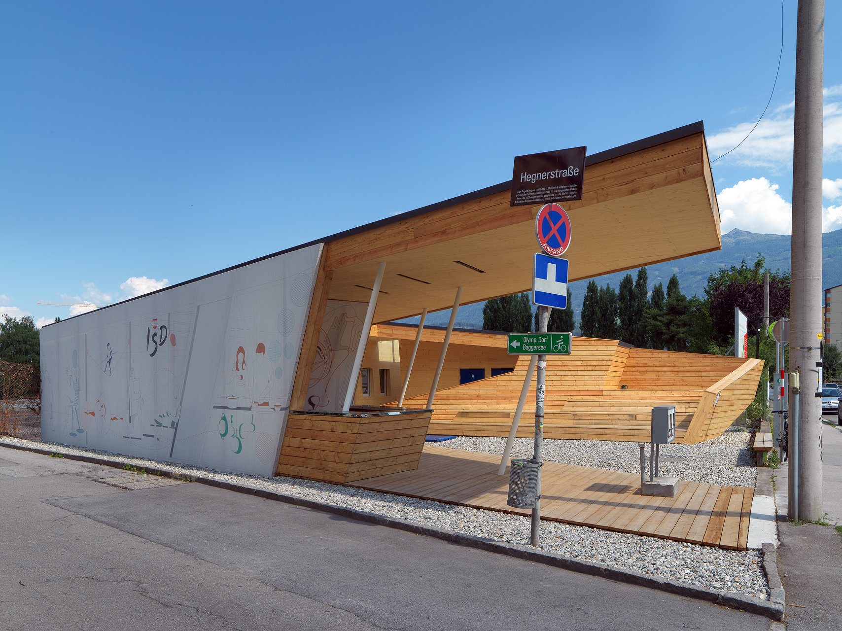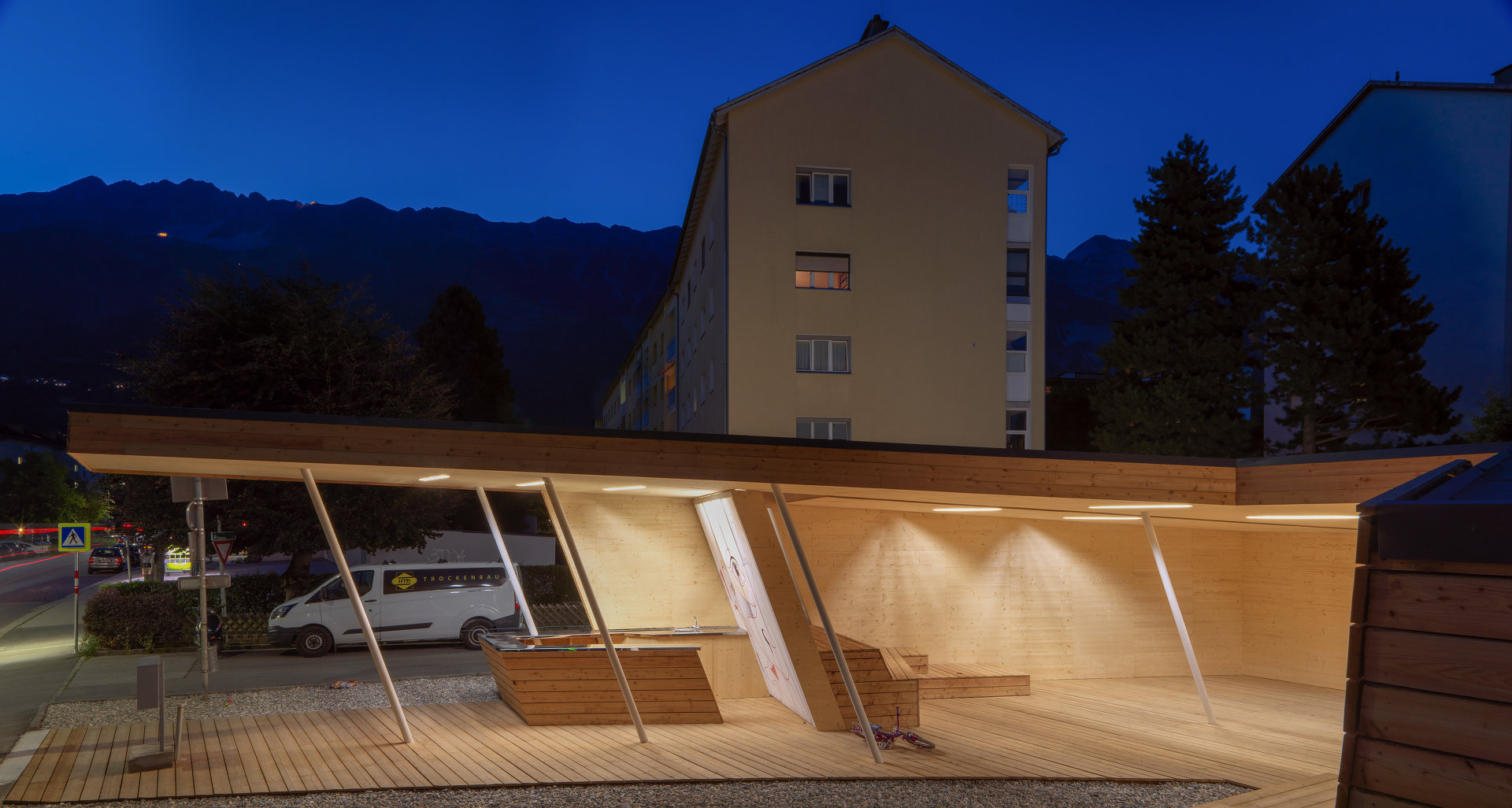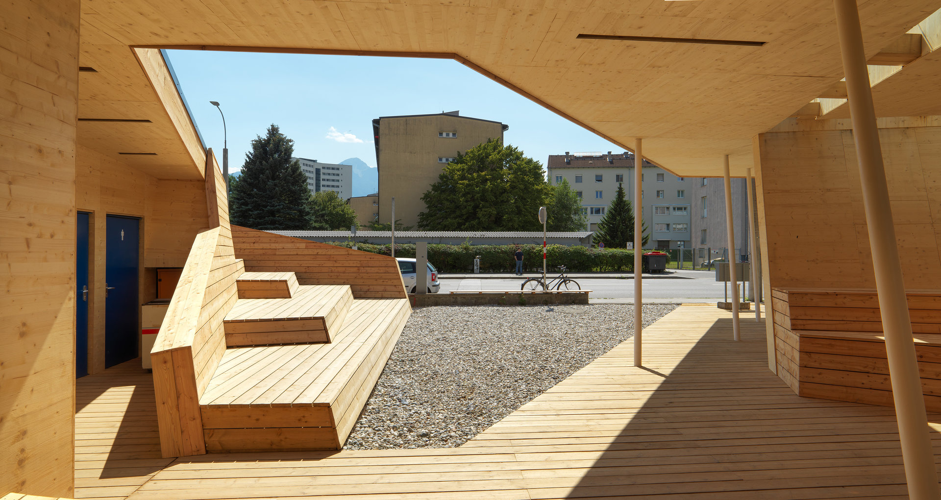 Angesichts der weitreichenden Veränderungen beschloss der Stadtsenat, 2017 in der Reichenau eine institutionalisierte Stadtteilarbeit einzurichten. Erstmalig sollte diese beginnen, bevor die neuen Bewohner:innen einziehen – auch um die ansässige, lokale Bevölkerung aktiv einzubeziehen. Das aus einem offenen Studentenwettbewerb als Sieger hervorgegangene Projekt schafft hierfür einen Ort der Information, des Austausches und der Vernetzung. Der v-förmige Baukörper integriert geschickt die in Containern untergebrachten Räume der ISD (Innsbrucker Soziale Dienste) und öffnet sich zur angrenzenden Straße. Es entsteht ein fließender und in Teilbereichen überdachter Raum, der sowohl Platz bietet für Veranstaltungen als auch Passanten und Anrainer zum Verweilen einlädt. (Text: aut, Birgit Brauner)