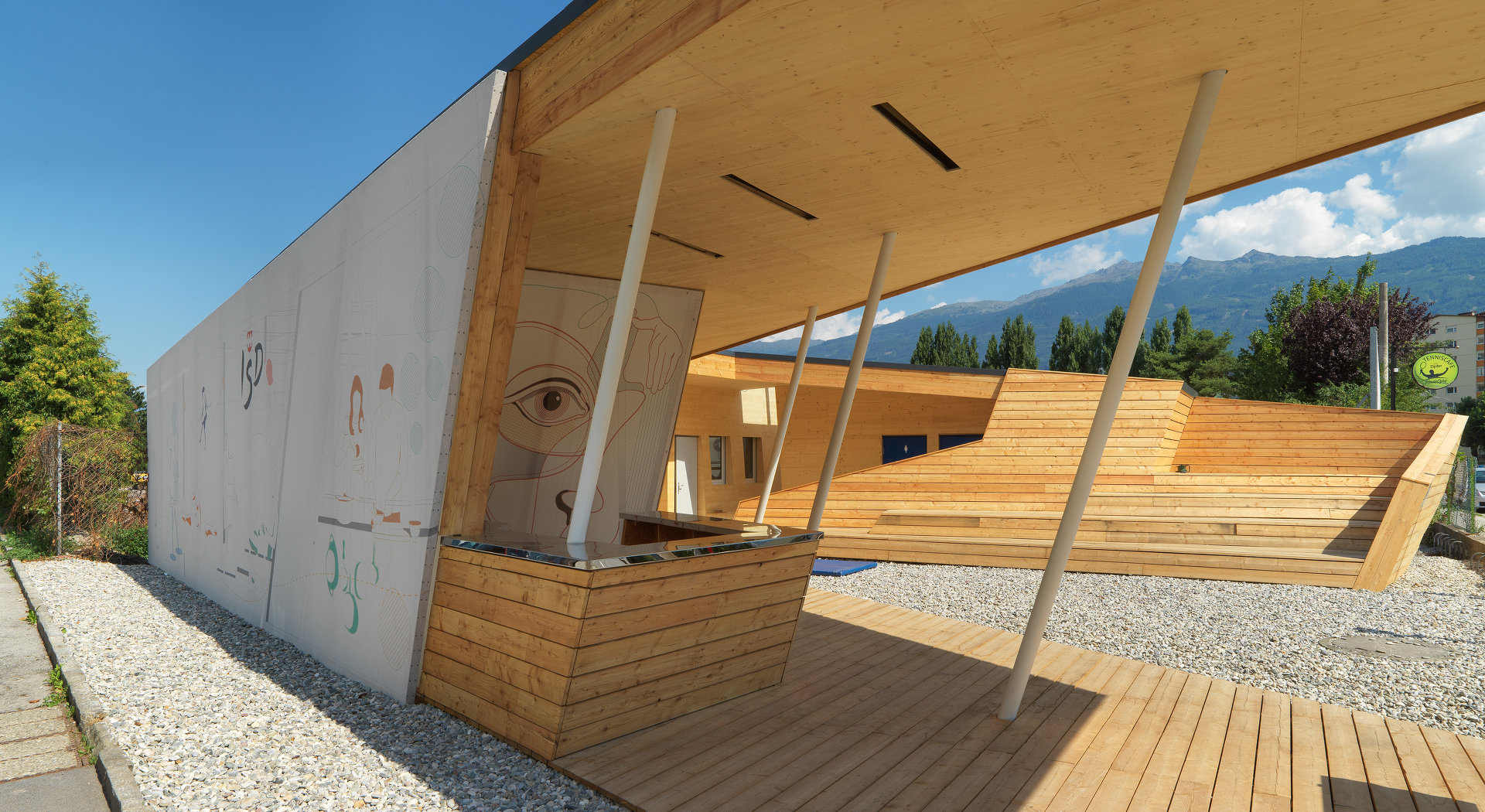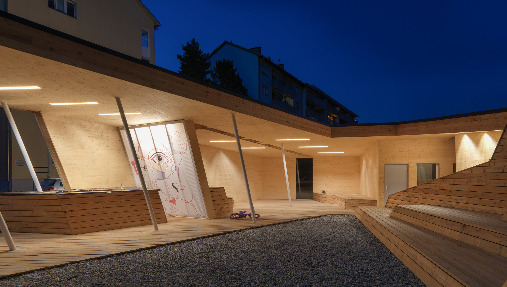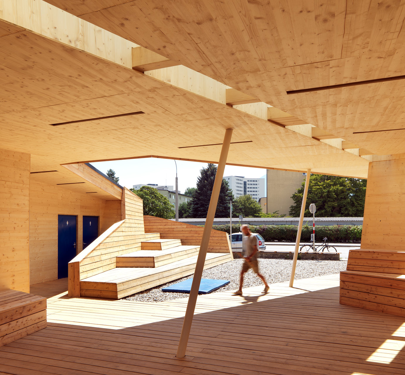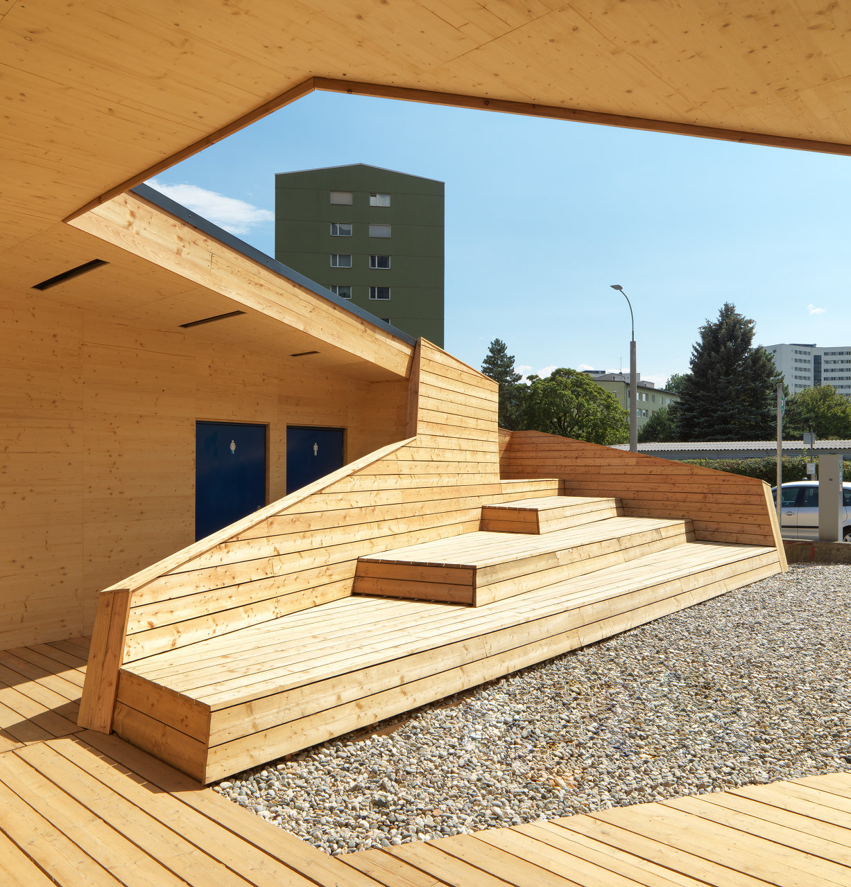 Angesichts der weitreichenden Veränderungen beschloss der Stadtsenat, 2017 in der Reichenau eine institutionalisierte Stadtteilarbeit einzurichten. Erstmalig sollte diese beginnen, bevor die neuen Bewohner:innen einziehen – auch um die ansässige, lokale Bevölkerung aktiv einzubeziehen. Das aus einem offenen Studentenwettbewerb als Sieger hervorgegangene Projekt schafft hierfür einen Ort der Information, des Austausches und der Vernetzung. Der v-förmige Baukörper integriert geschickt die in Containern untergebrachten Räume der ISD (Innsbrucker Soziale Dienste) und öffnet sich zur angrenzenden Straße. Es entsteht ein fließender und in Teilbereichen überdachter Raum, der sowohl Platz bietet für Veranstaltungen als auch Passanten und Anrainer zum Verweilen einlädt. (Text: aut, Birgit Brauner)
