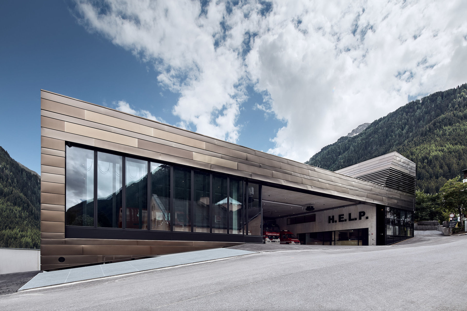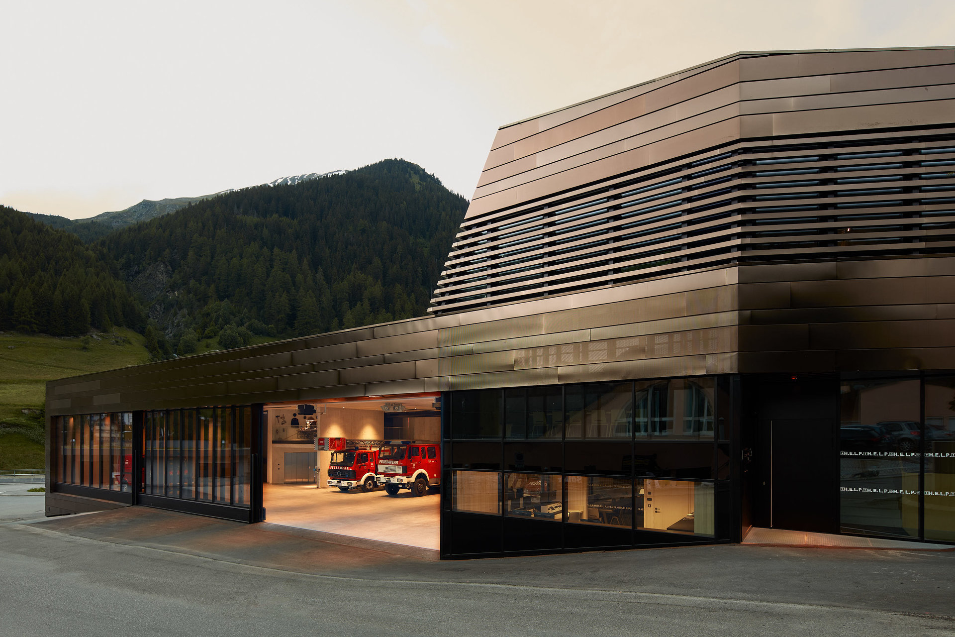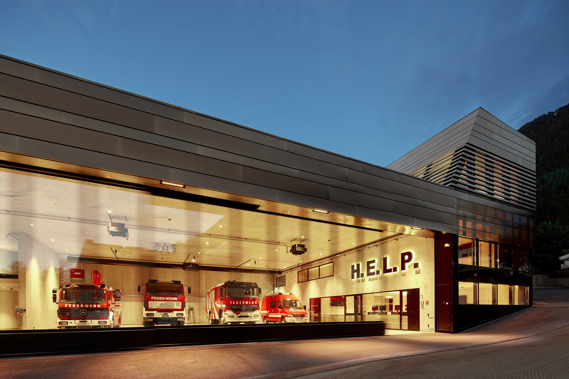 Die Tragstruktur der Wände und Decken wird aufgrund der Hanglage und der Lawinenanforderungen in Betonbauweise ausgeführt. Die Bereiche Aufenthalt, Schulung und Bereitschaft sind innen im einheimischen Holz ausgestattet. Die in sich geschlossene Sicherheitszelle und die fortschreitende Patinabildung an der Oberfläche stehen für die Robustheit des Blaulichtzentrums, die Widerstandsfähigkeit gegen die Naturgefahren und gleichzeitig die Zeitlosigkeit des Gebäudes. Die Tore sind aus Gründen der Belichtung und als Symbol der Verwurzelung mit der Bevölkerung transparent ausgeführt.