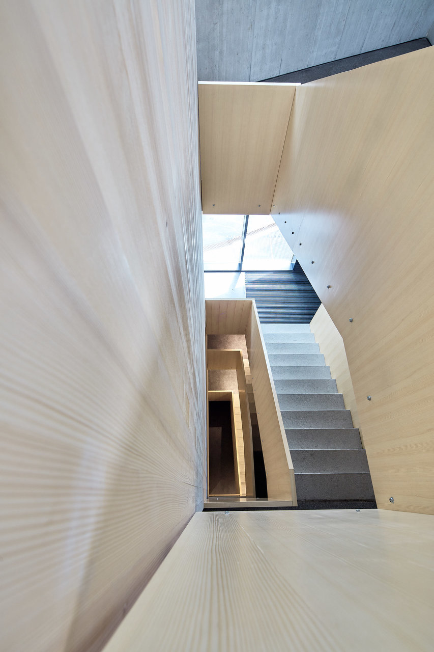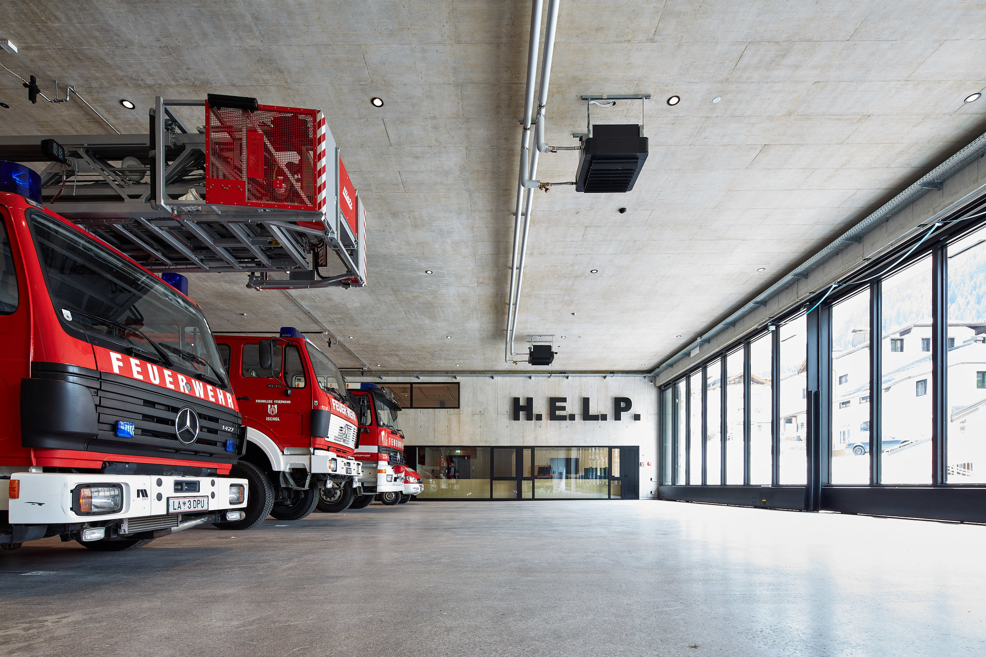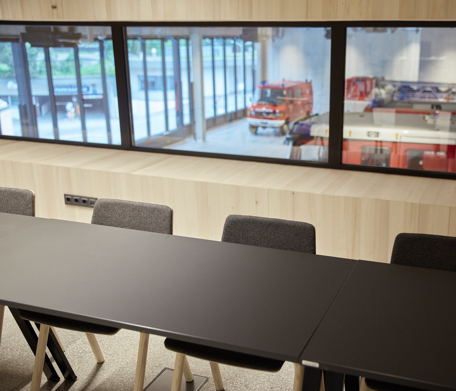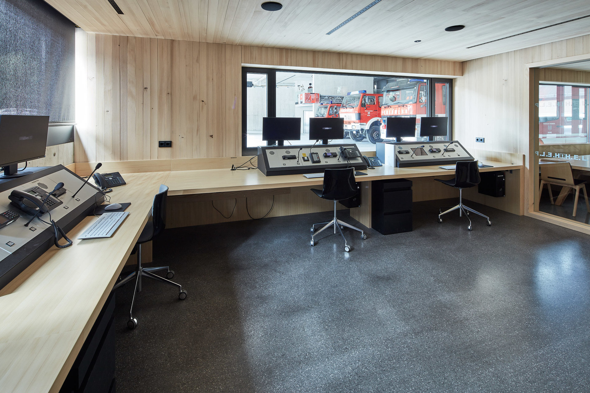 Bei der vertikalen Erschließung werden ganz bewusst zwei Lifte eingesetzt: der Warenlift für die Feuerwehr und der wesentlich schnellere Personenlift für die Rettung. Durch die innenhofartige Anordnung der Fahrzeughalle entsteht ein Maximum an Überblick. Von der Nachrichtenzentrale aus sind die gesamte Fahrzeughalle, der Garderobenbereich und der Vorplatz optimal einzusehen. Im Einsatzfall kann der Lenker des Fahrzeugs den Sichtkontakt zur Kommandozentrale und der Garderobe optimal herstellen.