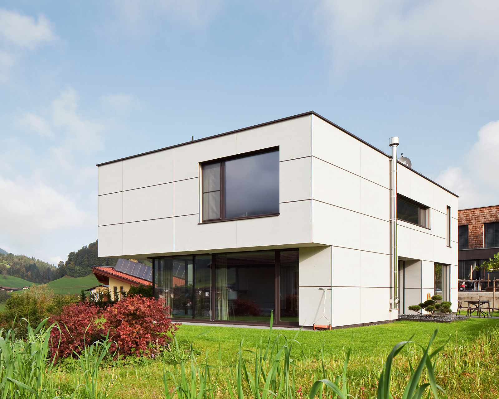 Städtebaulich liegt das Haus zwischen zwei Nachbargebäuden entlang der ansteigenden Straße, nach Norden ist der Bauplatz zum Sonnhang frei von Bebauung. Die im Süden bestehende Siedlung liegt unterhalb der Straße und versperrt den Ausblick bzw. Besonnung nicht.