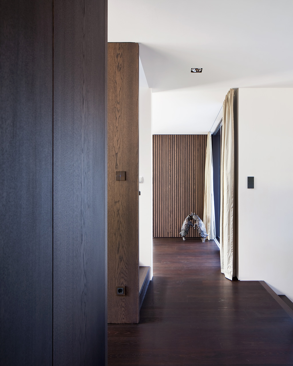 Das Haus ist mit einer Luftwärmepumpe und Kontrollierter Wohnraumlüftung ausgestattet. Die Elektroinstallation ist als BUS System ausgeführt, das der technisch versierten Bauherrschaft erlaubt, Szenarien für Licht und Beschattung selber zu generieren.