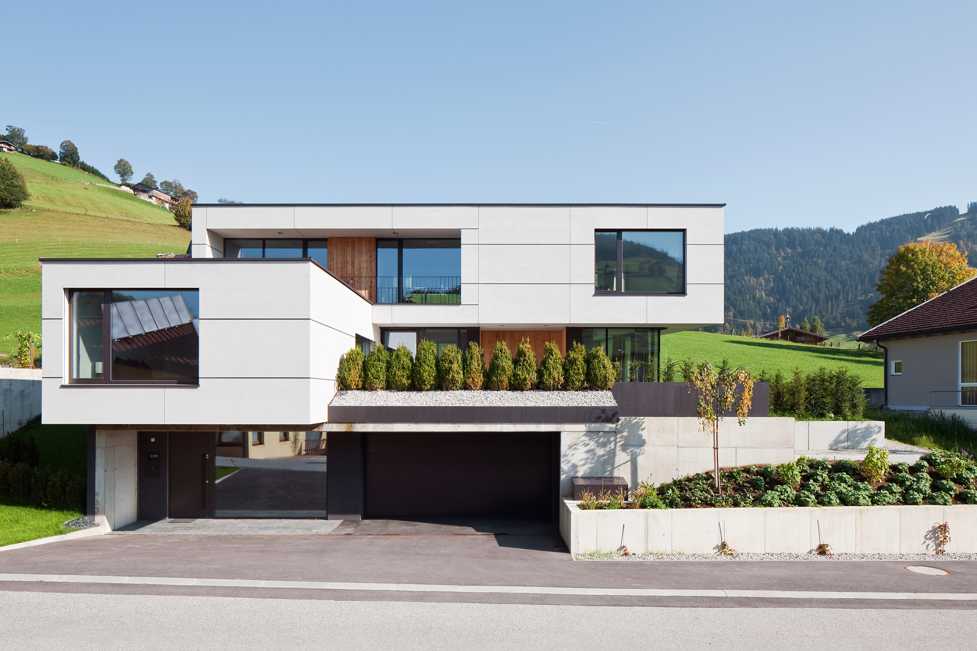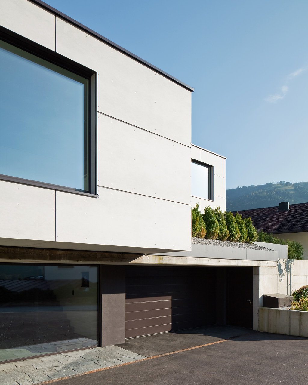Der Bereich zwischen Straße und Außenwand UG mit Garage, Haupteingang, wird als Autoabstellplatz genutzt und bildet einen halböffentlichen Vorplatz. Über den linkerhand liegenden Eingangsraum gelangt man auf der einläufigen Treppe in das Wohngeschoss, das den Ausgang auf das natürliche Gelände erlaubt. Zur Linken gibt es ein eigenes Gästezimmer mit Bad und einem Panoramafenster in das Wildschönauer Hochtal. Zur Morgensonne hin orientiert sich die Küche mit kleiner Außenterrasse. Zentral gelegen der Essplatz, der nach Nord und Süd offen ist und sich optisch zum abgesenkten Wohnbereich erweitert, getrennt bzw. verbunden mit dem in Stein ummantelten Kachelofen.
