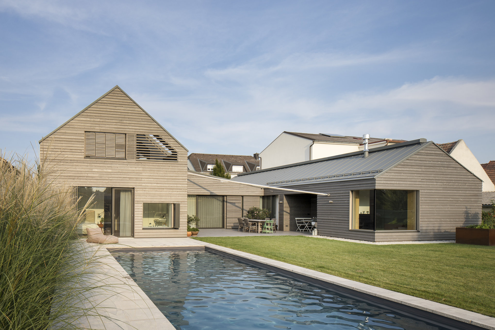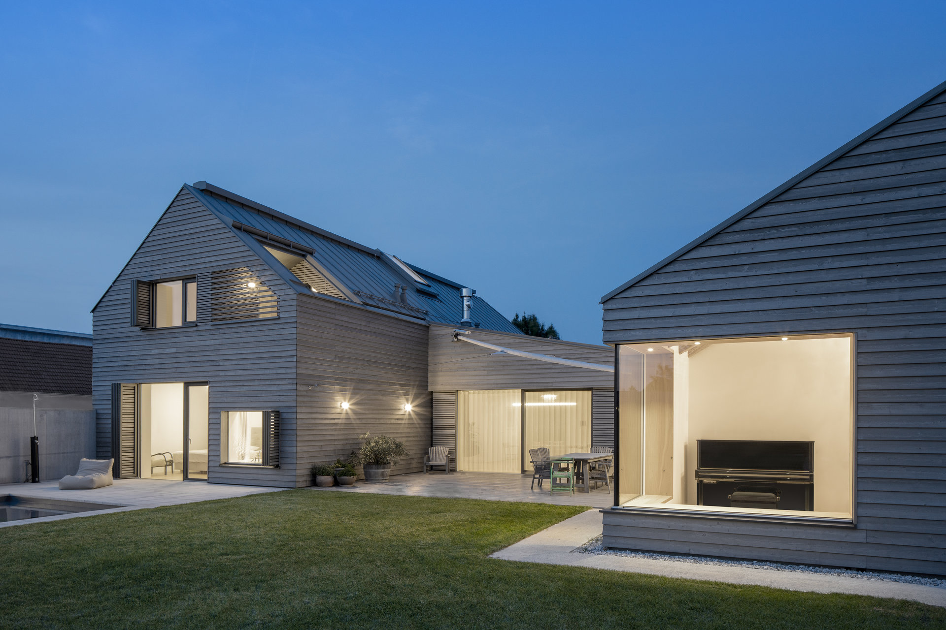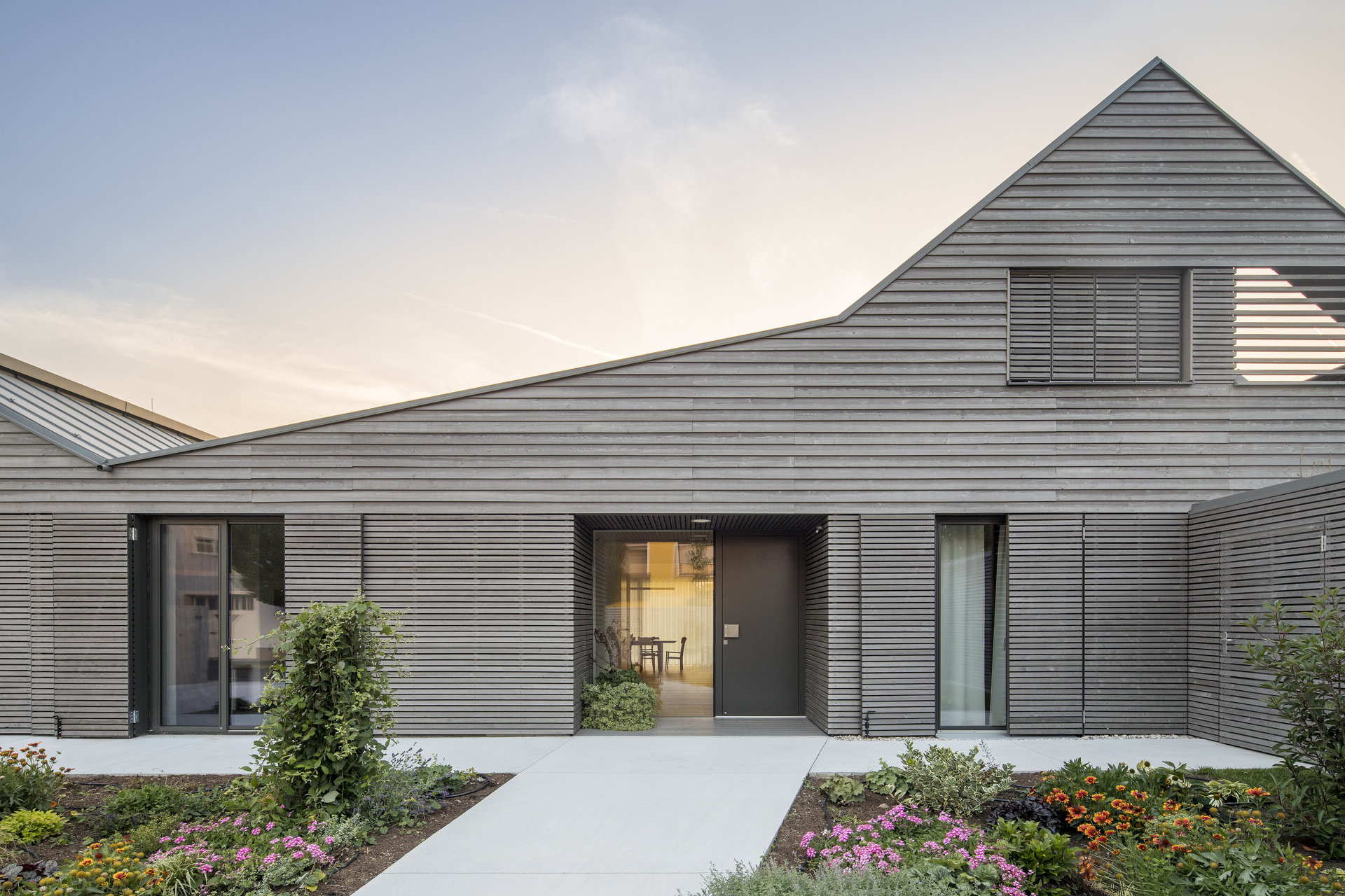 Als Fassadenmaterial wurde eine sägeraue, vorverwitterte Stulpschalung aus Lärchenholz gewählt. Zwei unterschiedliche Größen zonieren die Fassade. Schiebe-, Klapp und Faltläden aus Lärchenholz dienen als bewegliche (angesteuerte) Sonnenschutzelemente. Sie unterstützen außerdem das lebendige Spiel der Fassade und lassen nach Bedarf der Bewohner wechselnde Ein- und Ausblicke zu. Sie geben dem Baukörper ein unterschiedliches Erscheinungsbild – mal eine offene, mal eine geschlossene Hülle. (Text: Architektinnen)