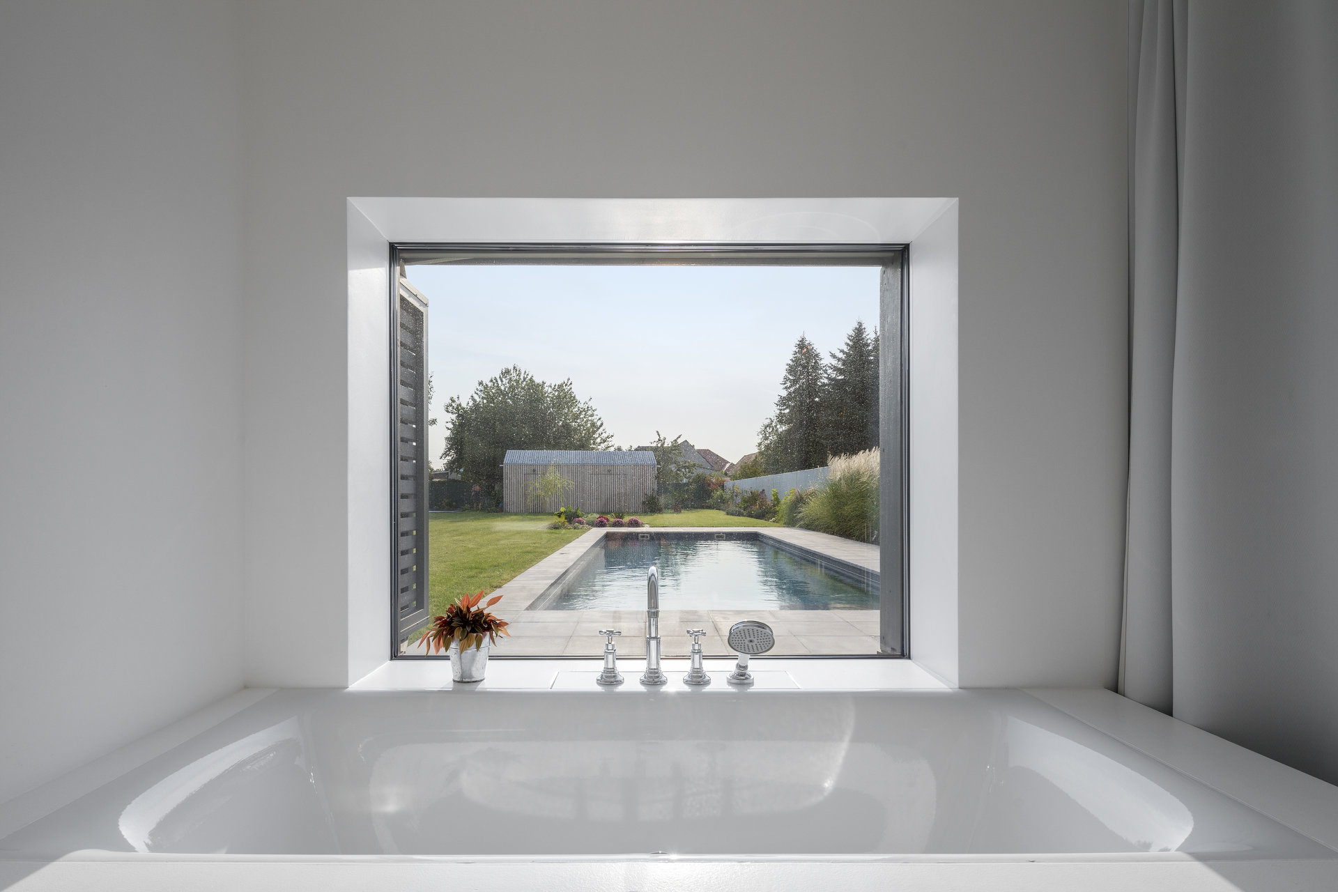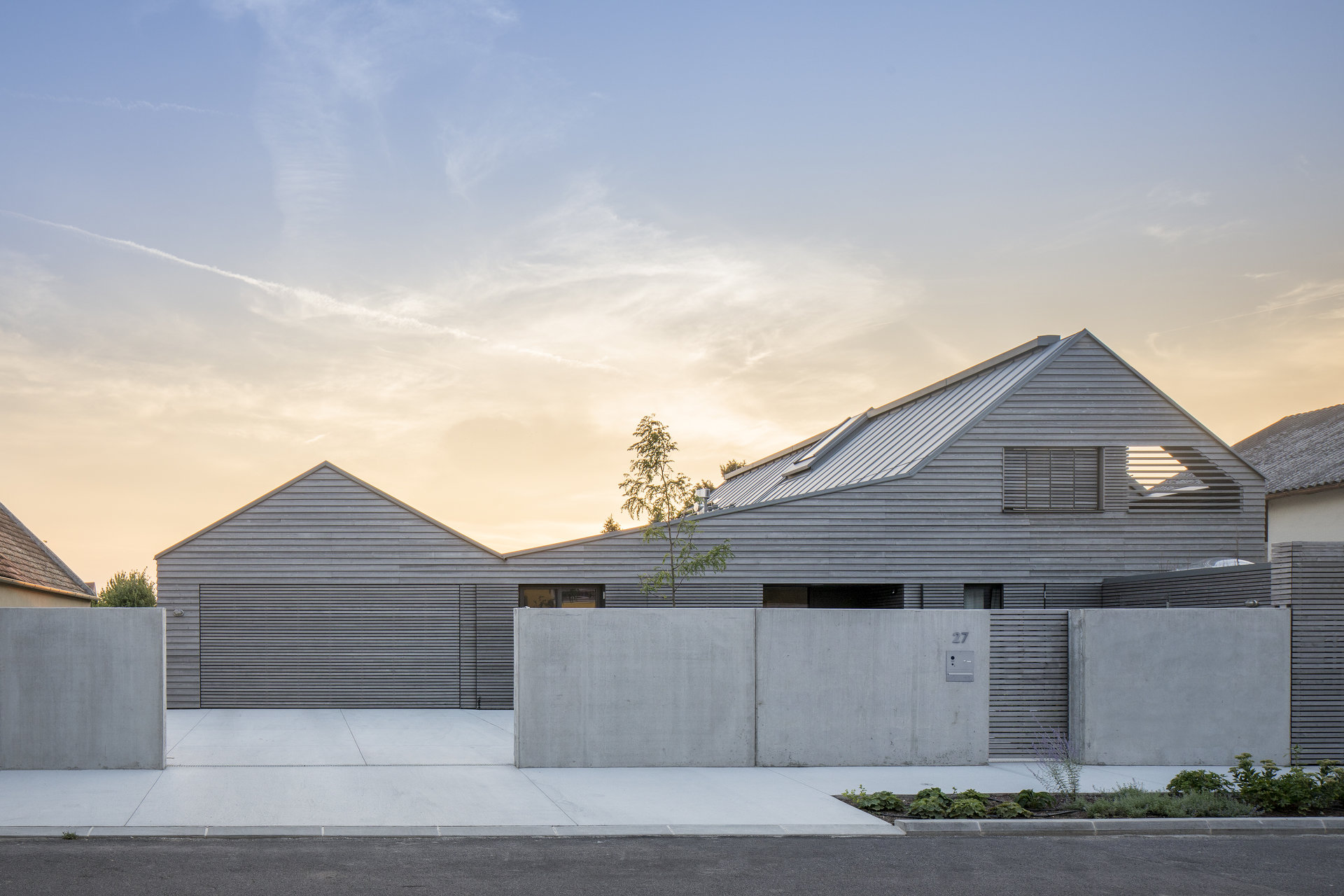 Bezugnehmend auf den typisch burgenländischen Ortscharakter präsentiert sich das Haus zur Straße hin geschlossen und öffnet sich als großzügiges Atriumhaus durch raumhohe Fensterflächen zum westseitig gelegenen Garten. So fliessend wie der Übergang zwischen Innen- und Außenraum ist das Wohnkonzept: offen und lichtdurchflutet. Eingang, Küche und Wohnraum gehen ineinander über und bilden als Raumabfolge das Herzstück des Hauses. Durch die Dachfaltung (auch im Innenraum sehr gut erlebbar) werden die unterschiedlichen Aufenthaltsbereiche zoniert und gleichzeitig als eine Einheit erlebbar. Die windgeschützte Terrasse ist die logische Erweiterung und gleichzeitig der Abschluss des Innenhofes. In den Seitentrakten des Erdgeschoßes findet sich einmal der Elternbereich als eigene Einheit, sowie das Herrenzimmer welches durch seinen eigenen Eingang eine Vielzahlt an Nutzungen zulässt.