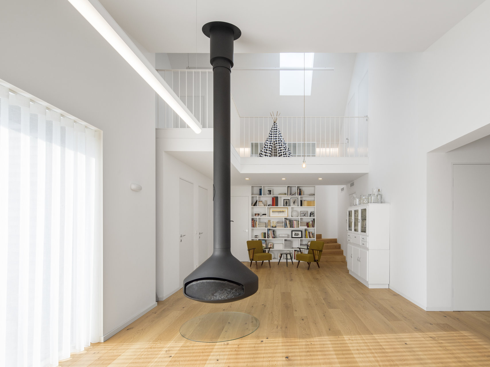 Über eine als Bibliothek gestaltete Treppe gelangt man auf die offene Galerie im Obergeschoss. Sie ist Spielzone und Arbeitsbereich in einem. Anschließend finden sich die Kinderzimmer mit je einer kleinen eingeschnittenen Loggia und das Kinderbad. Durch die bewusste Trennung der Generationen gibt es genügend Privatsphäre für beide Seiten. Der Luftraum (welcher mittels Bühnenvorhang geschlossen werden kann) ermöglicht dennoch attraktive Sichtbeziehungen zwischen den Geschoßen.