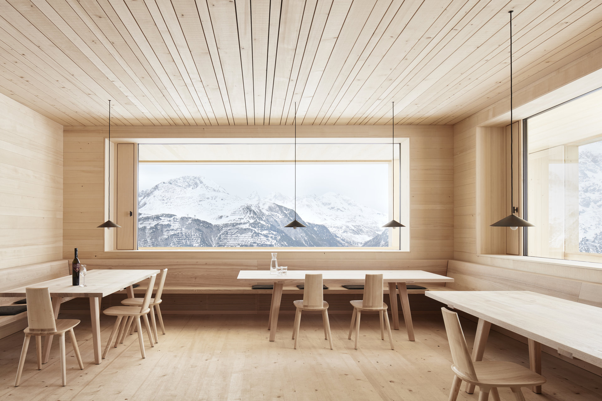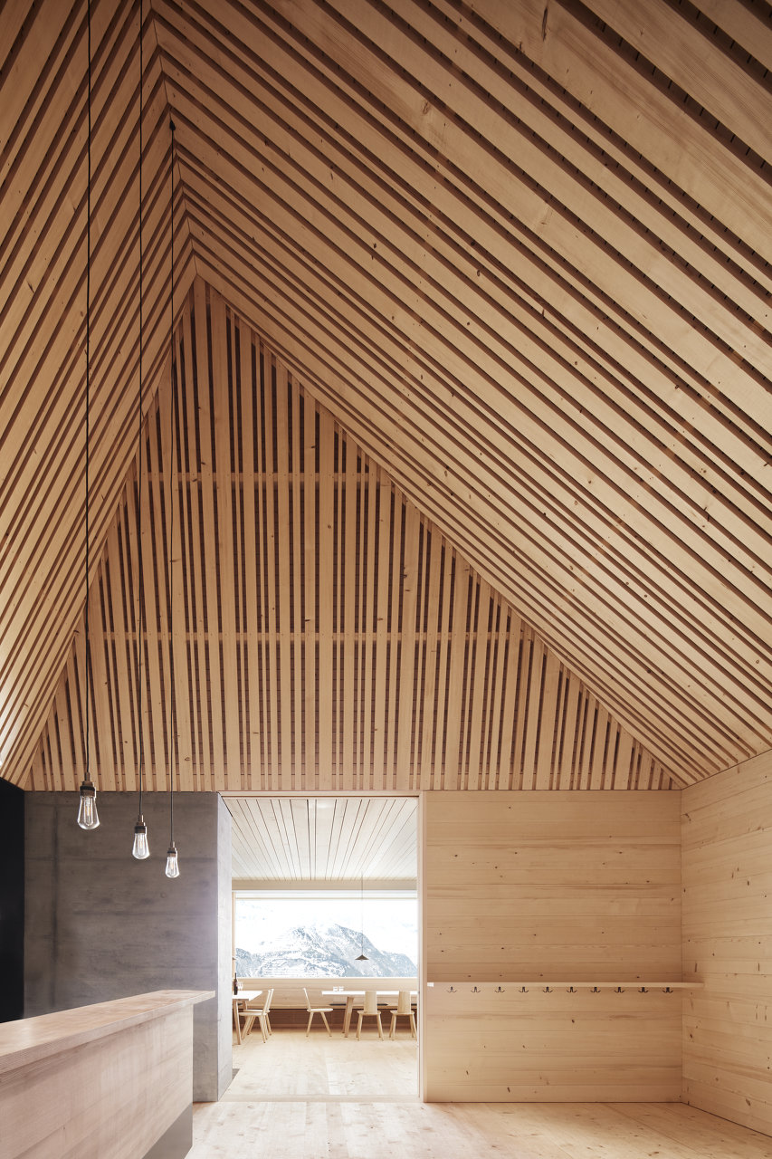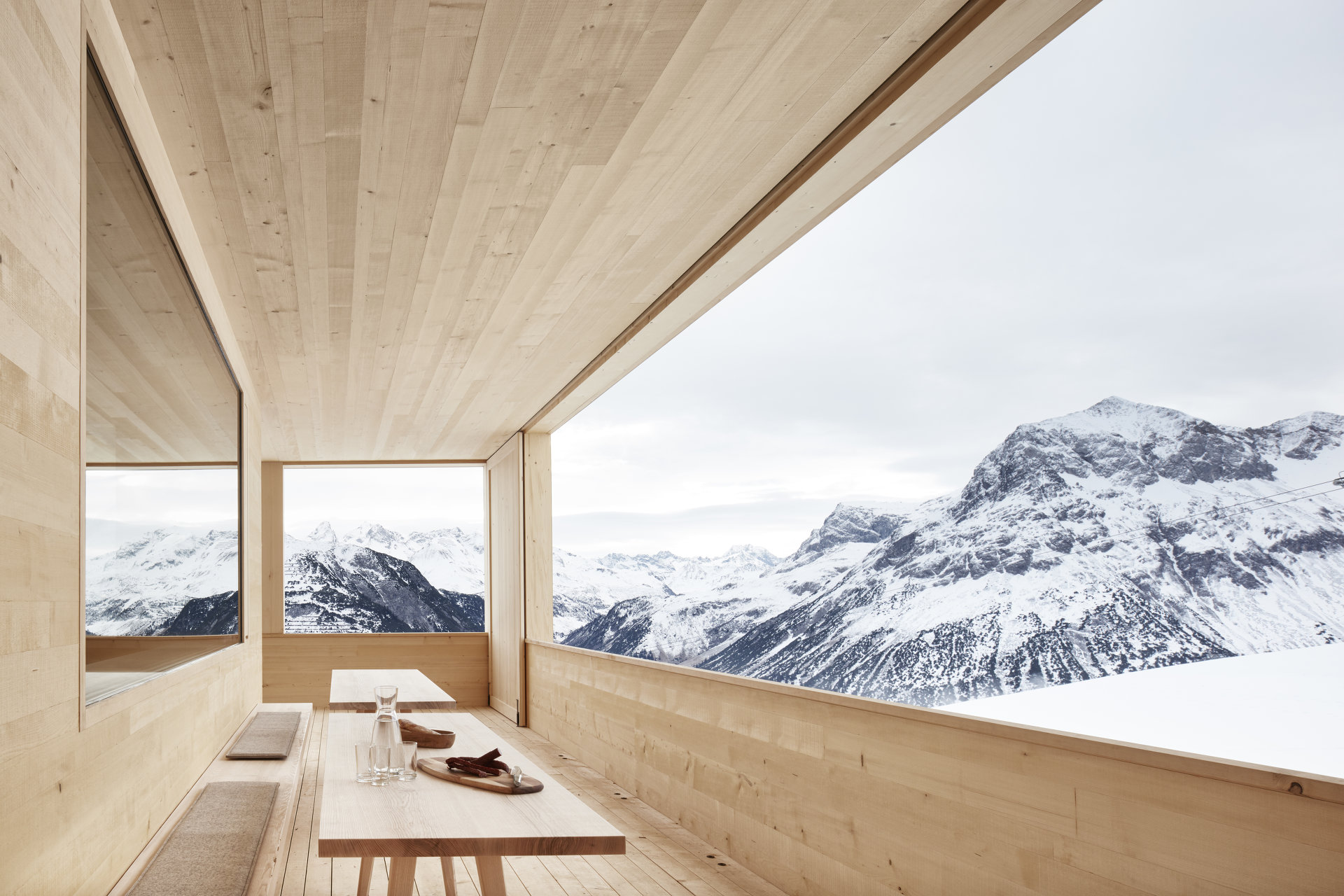 Die Hütte ist von Kopf bis Fuß mit unbehandelter heimischer Fichte verkleidet – mühelos gelingt so der Spagat zwischen Tradition und Moderne. Unter dem Satteldach von 25° Neigung spannt sich ein lichtdurchlässiges Zelt auf. Vom Lift aus Oberlech rutscht man direkt zur Hütte. Windgeschützt kann man hier das Bergpanorama genießen. Unter dem vorgezogenen Satteldach ziehen eine breite gedeckte Terrasse und ein Schopfraum ums Eck. Schwellenlos geht der Boden der Hütte auf die gedeckte Terrasse im Südwesten über: sie ist 2,20 Meter tief. Beim „Schopf“ im Südosten sind es sogar drei Meter. Hier gibt es auch eine Holzbrüstung zwischen den Stützen: so reagiert der alpine Raum auf den Wind vom Berg. Ist es sehr kalt, stehen die Tische parallel zur Wand eng an die Hütte gerückt in geschützter Position. Bei Sonnenschein werden sie im rechten Winkel dazu vorn an die Brüstung gestellt. So können 48 Gäste an sechs Tischen die Aussicht auf Kriegerhorn, Trittkopf und Rüfikopf genießen. (Text: Isabella Marboe)