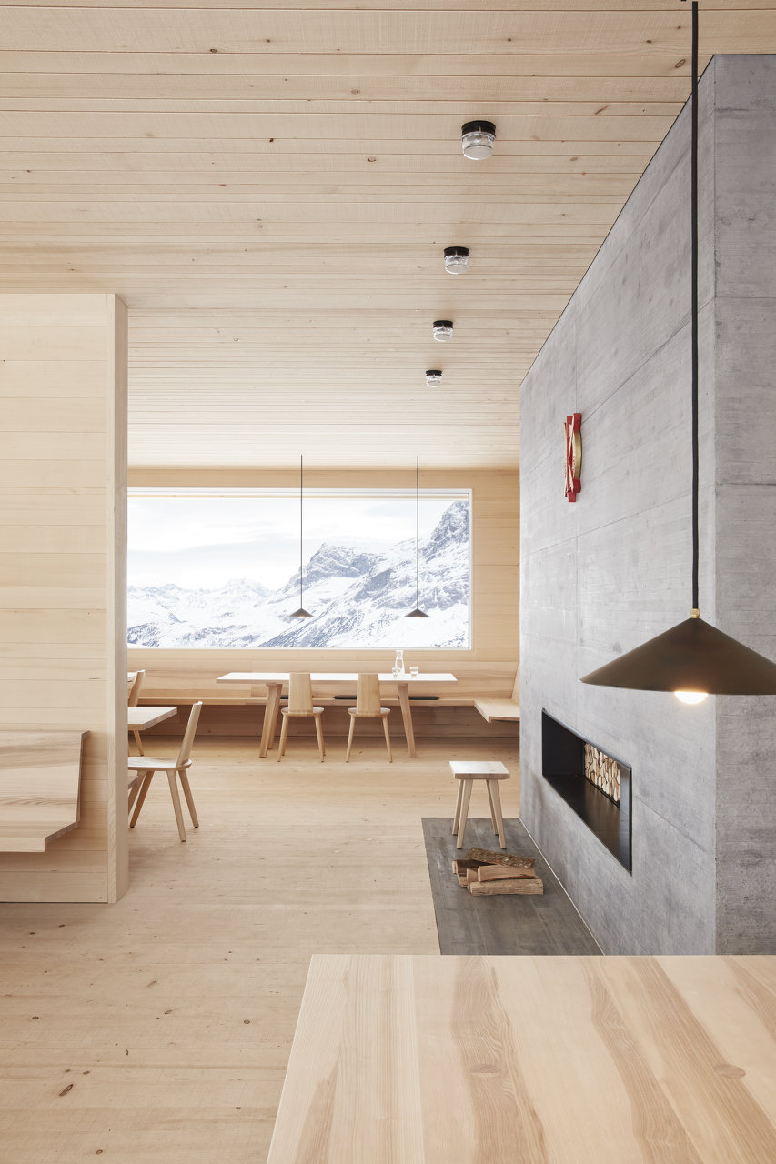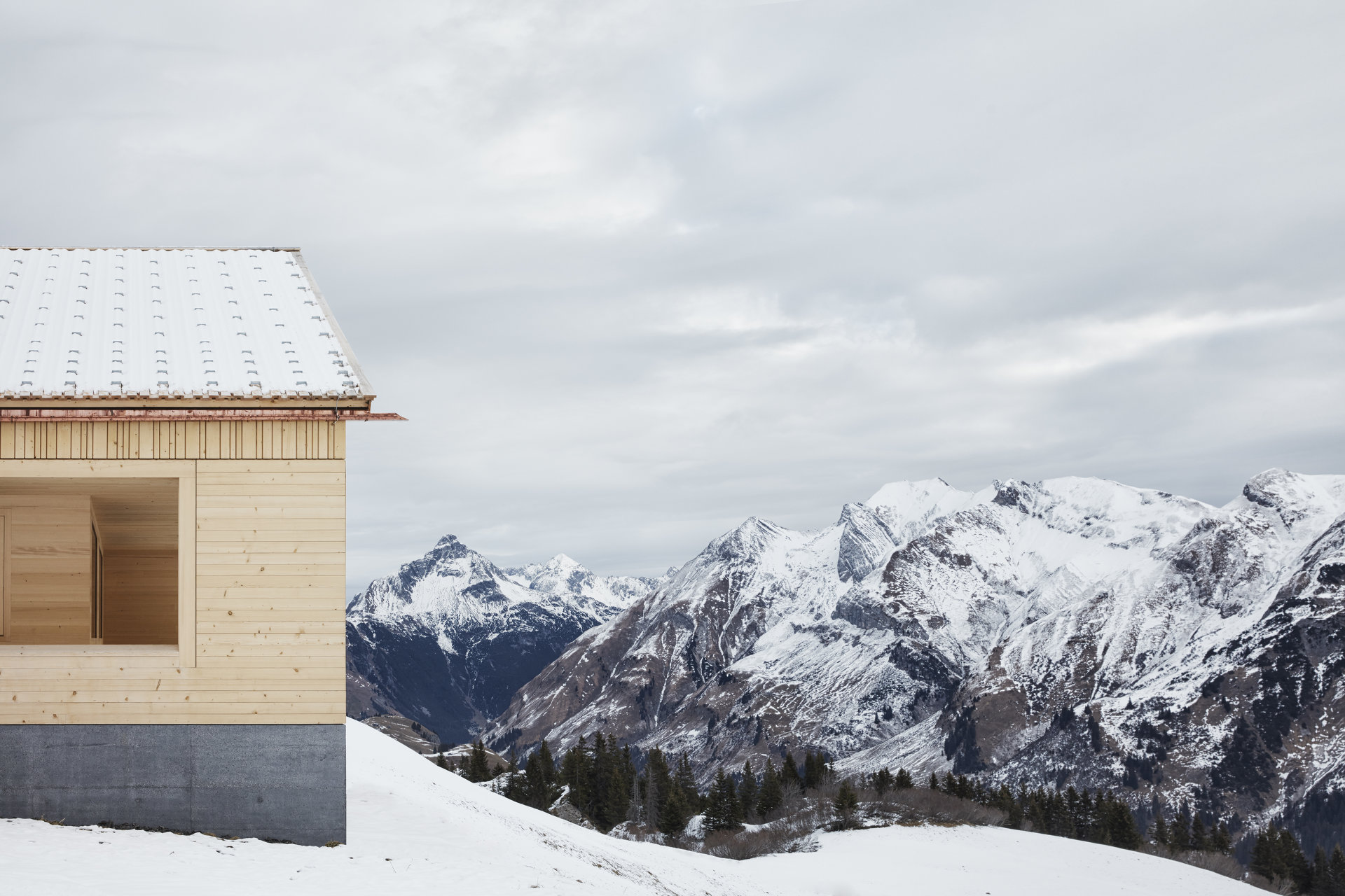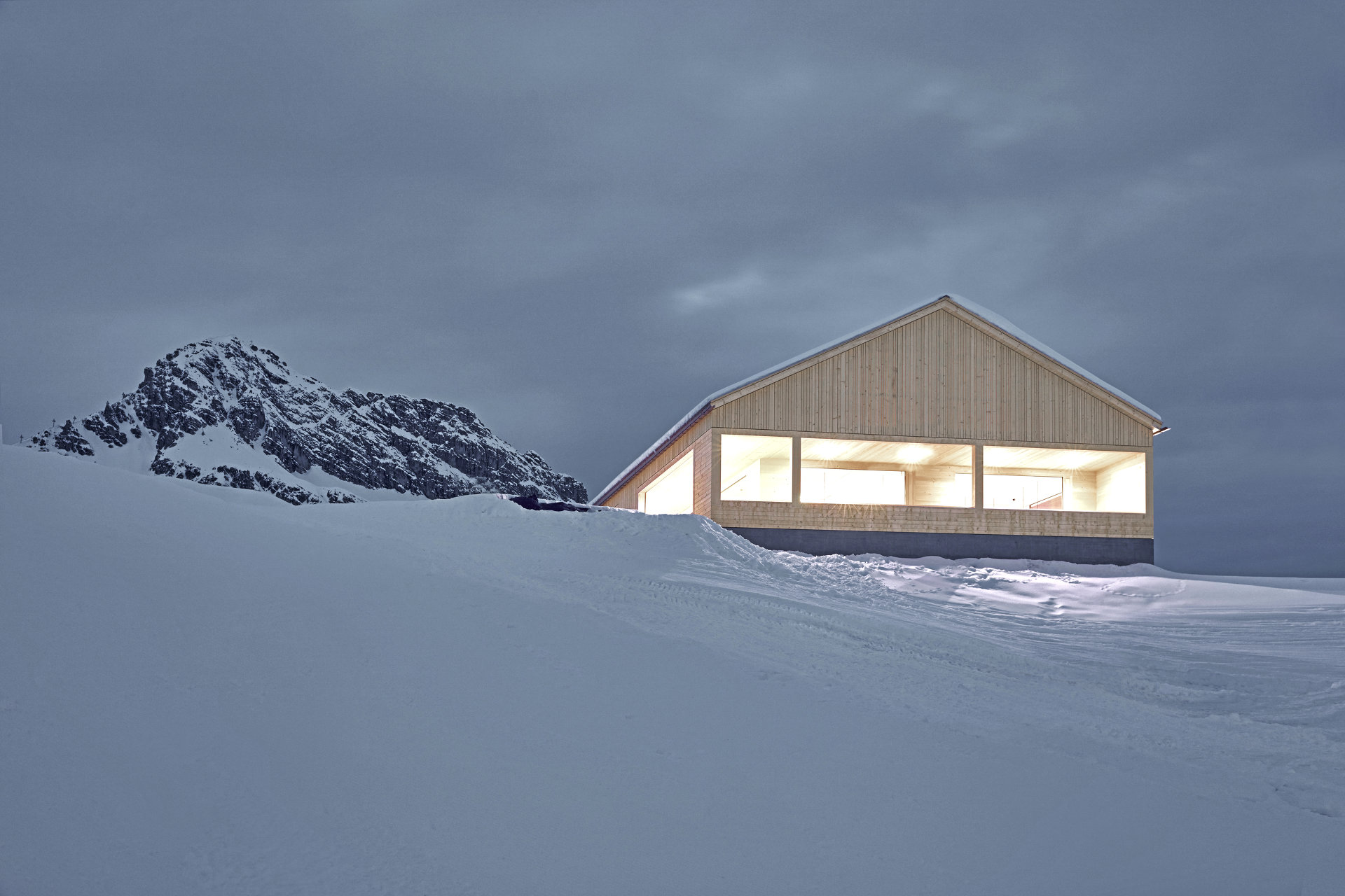 Die Hütte ist von Kopf bis Fuß mit unbehandelter heimischer Fichte verkleidet – mühelos gelingt so der Spagat zwischen Tradition und Moderne. Unter dem Satteldach von 25° Neigung spannt sich ein lichtdurchlässiges Zelt auf. Vom Lift aus Oberlech rutscht man direkt zur Hütte. Windgeschützt kann man hier das Bergpanorama genießen. Unter dem vorgezogenen Satteldach ziehen eine breite gedeckte Terrasse und ein Schopfraum ums Eck. Schwellenlos geht der Boden der Hütte auf die gedeckte Terrasse im Südwesten über: sie ist 2,20 Meter tief. Beim „Schopf“ im Südosten sind es sogar drei Meter. Hier gibt es auch eine Holzbrüstung zwischen den Stützen: so reagiert der alpine Raum auf den Wind vom Berg. Ist es sehr kalt, stehen die Tische parallel zur Wand eng an die Hütte gerückt in geschützter Position. Bei Sonnenschein werden sie im rechten Winkel dazu vorn an die Brüstung gestellt. So können 48 Gäste an sechs Tischen die Aussicht auf Kriegerhorn, Trittkopf und Rüfikopf genießen. (Text: Isabella Marboe)