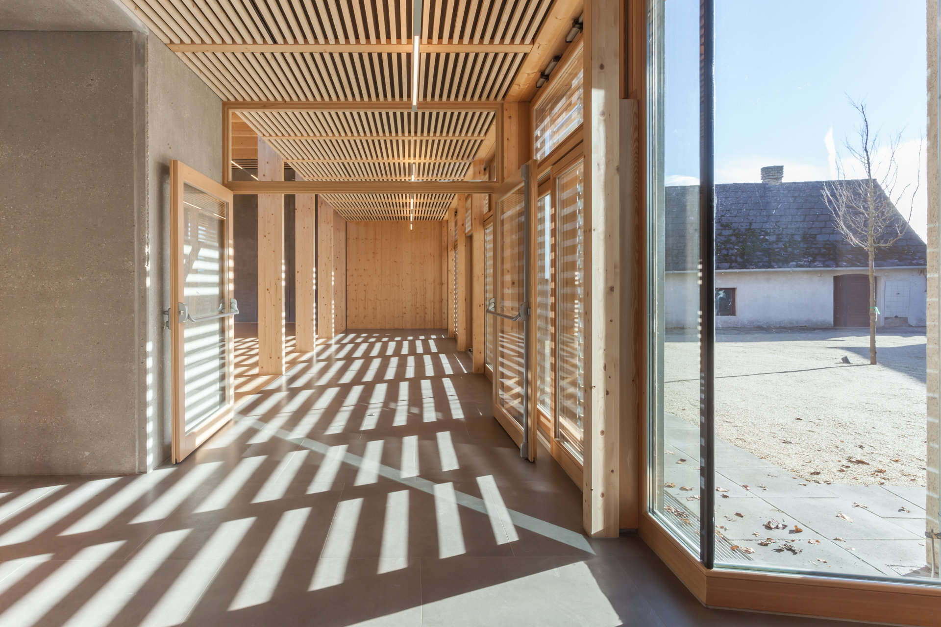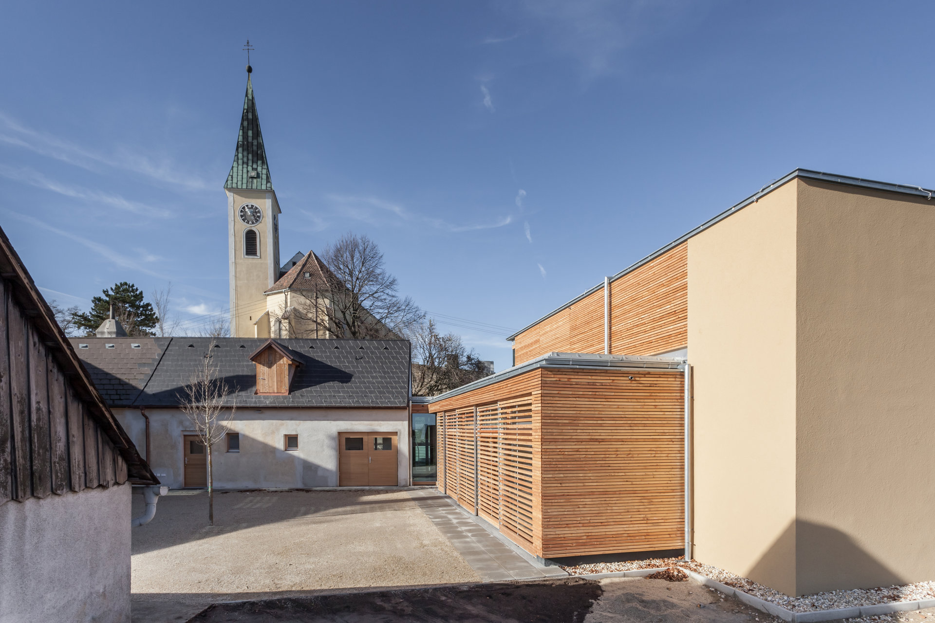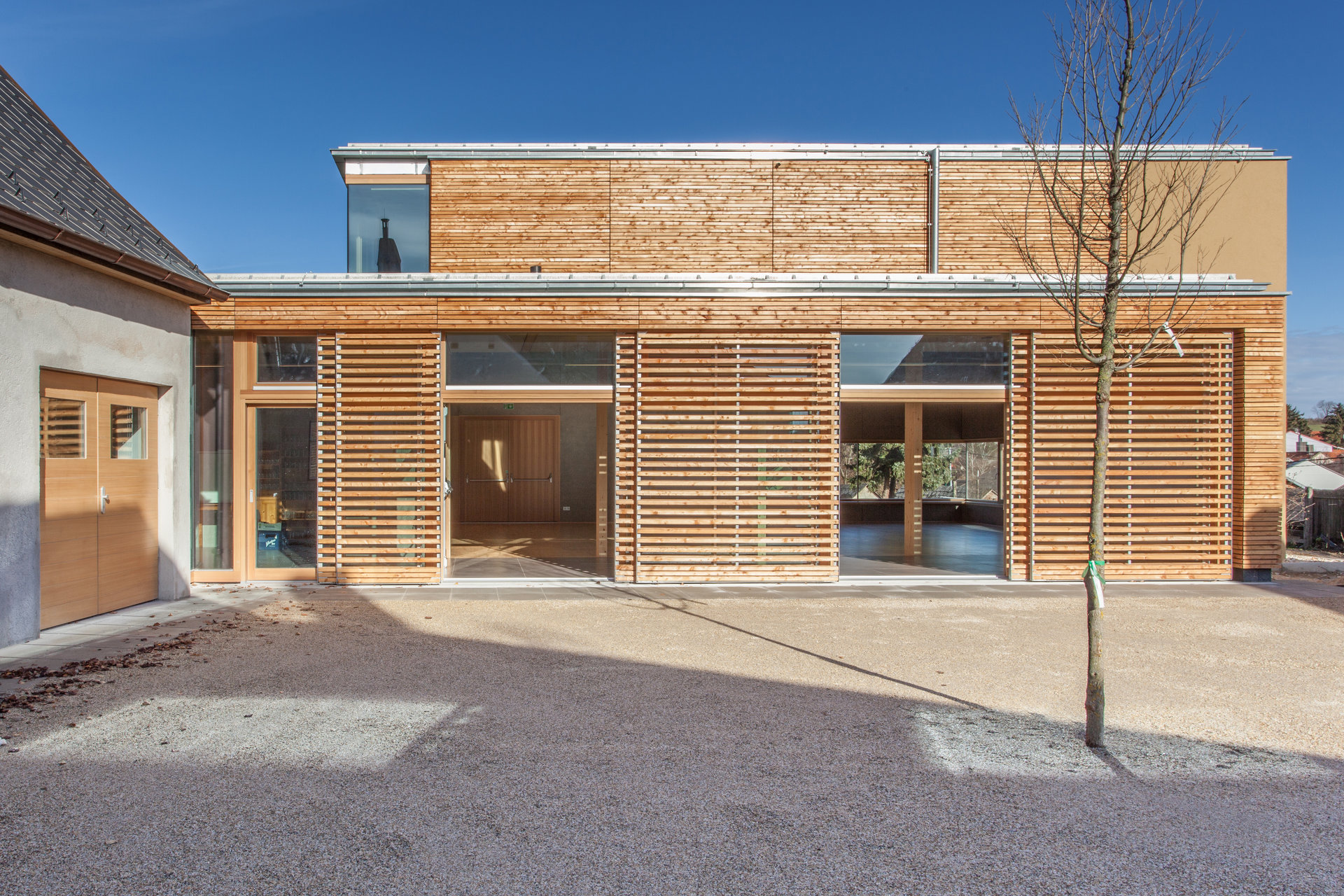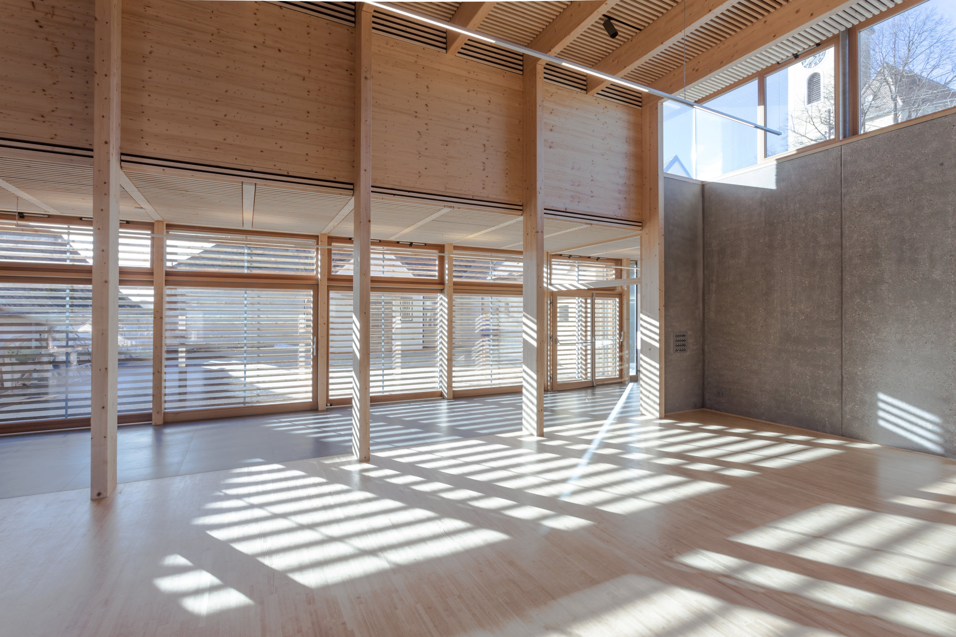 Der Zubau wurde in Mischbauweise und zu einem großen Teil in Holzskelettbauweise errichtet. Die Decke des Saales und des Foyers sowie die Wände zum Innenhof wurden in Holz ausgeführt. Die Kombination von Holzkonstruktion, Holzfassade, Sonnenschutzelementen mit Holzlamellen, Holzfenstern sowie der Holzböden erzeugt gemeinsam mit den sandgestrahlten Betonoberflächen einen maßgeblich von natürlichen Materialien geprägten Raumeindruck. Zudem wurde großer Wert darauf gelegt, dass alle konstruktiven, raumbildenden und sonstige Holzelemente unverkleidet und somit für den Nutzer sichtbar und ablesbar bleiben. (Text: Architekten, bearbeitet)