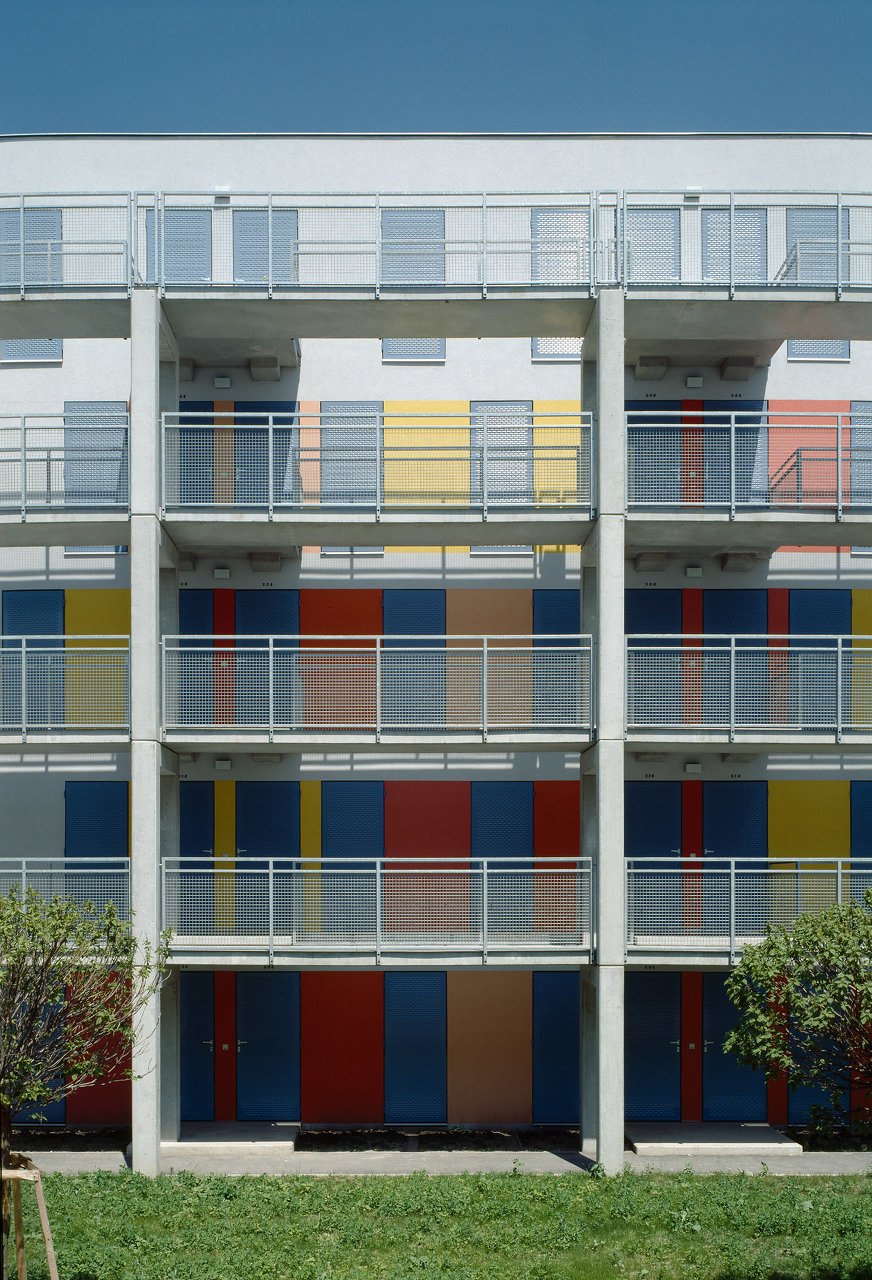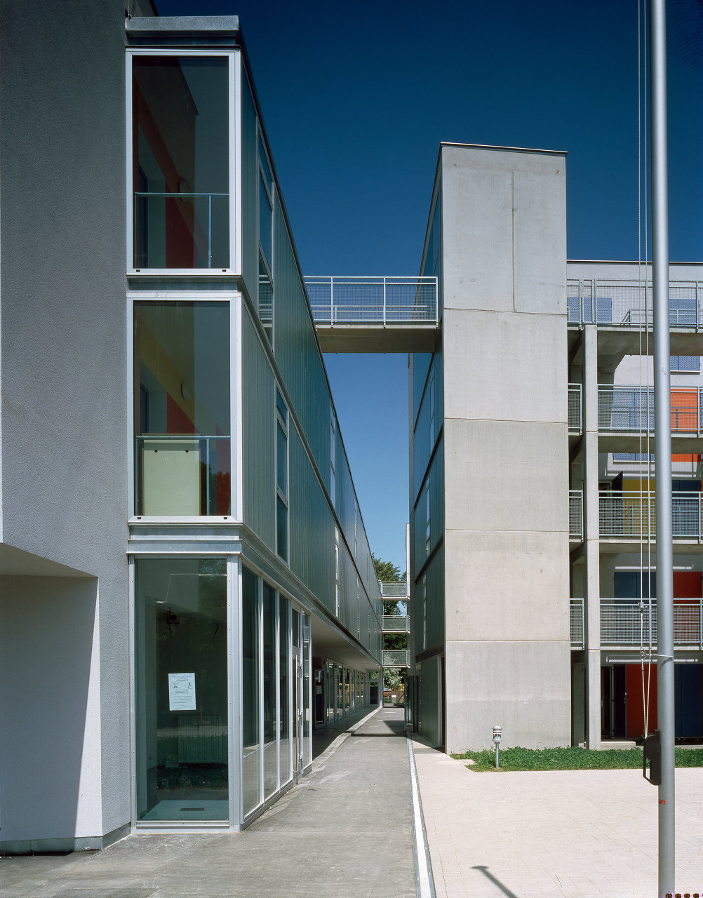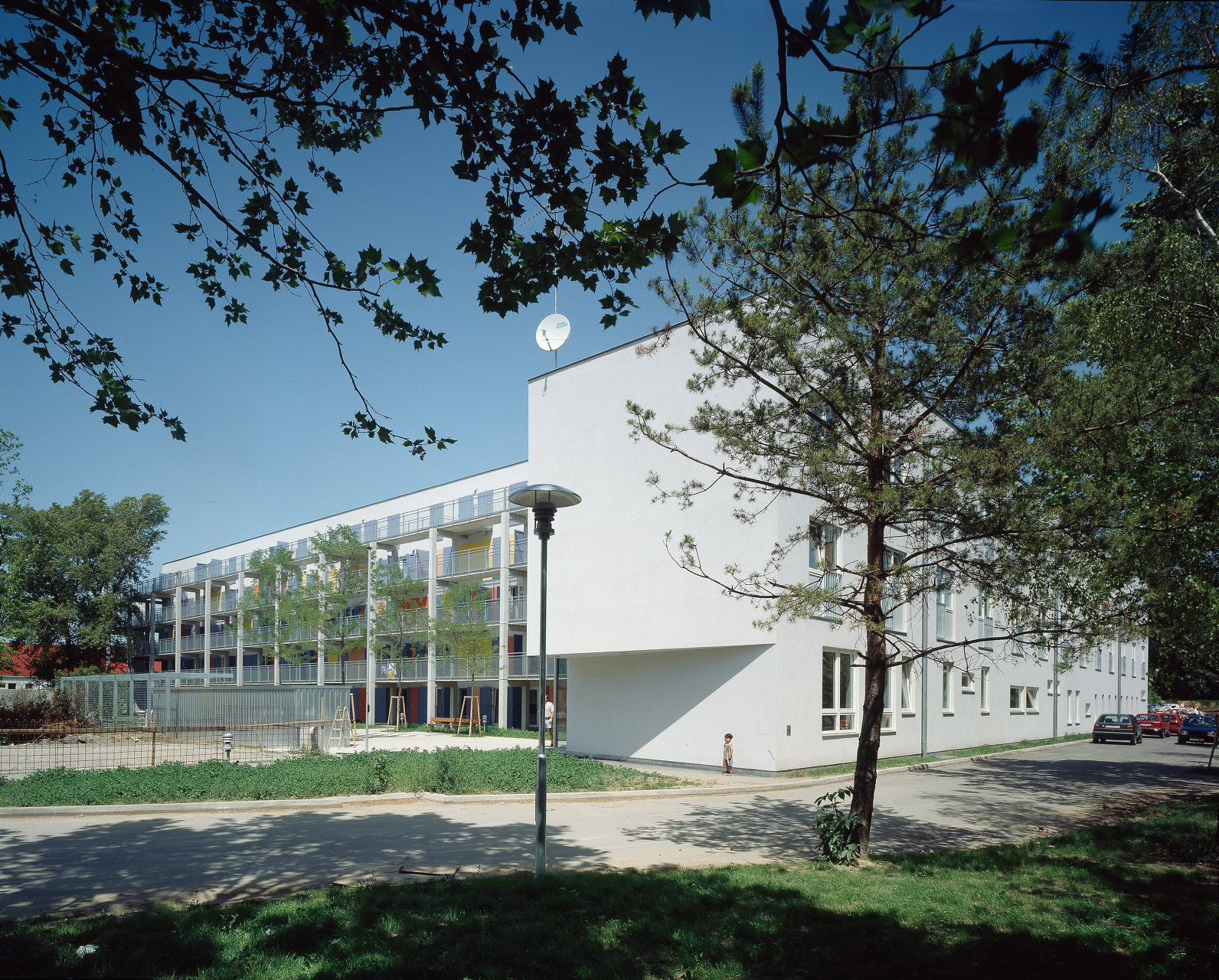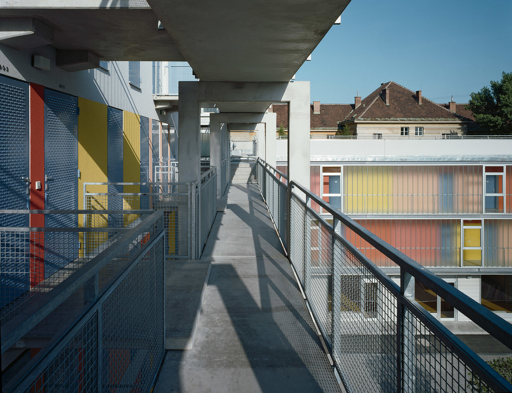 Die Wohnungen öffnen sich mit ihrem Hauptraum über einen kleinen Vorplatz zu den Laubengängen, der Laubengang wird zur Wohnstraße. Diese Offenheit erleichtert Kommunikation und Begegnung. Die Bewohner sind somit auch im Geschoßwohnbau nicht eingesperrt und isoliert, sondern können teilnehmen am Leben der anderen. Sie wohnen miteinander.