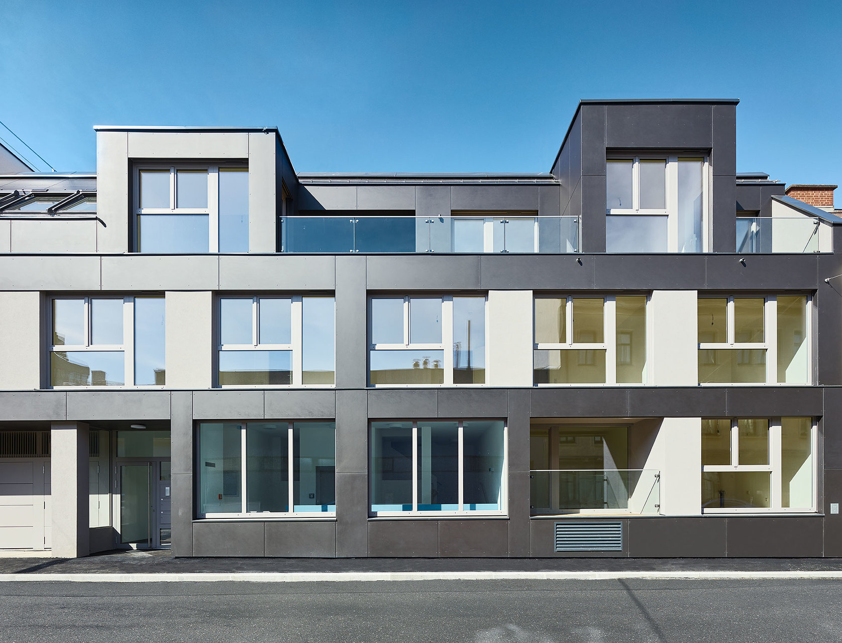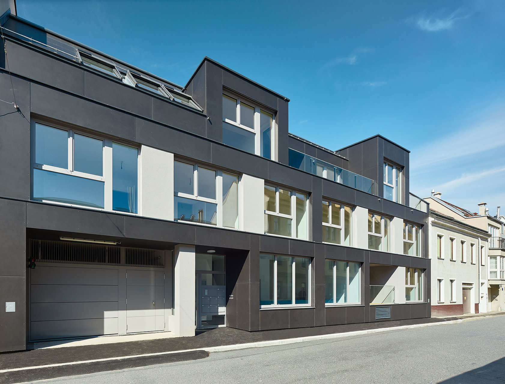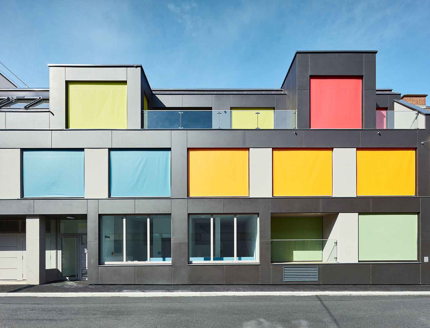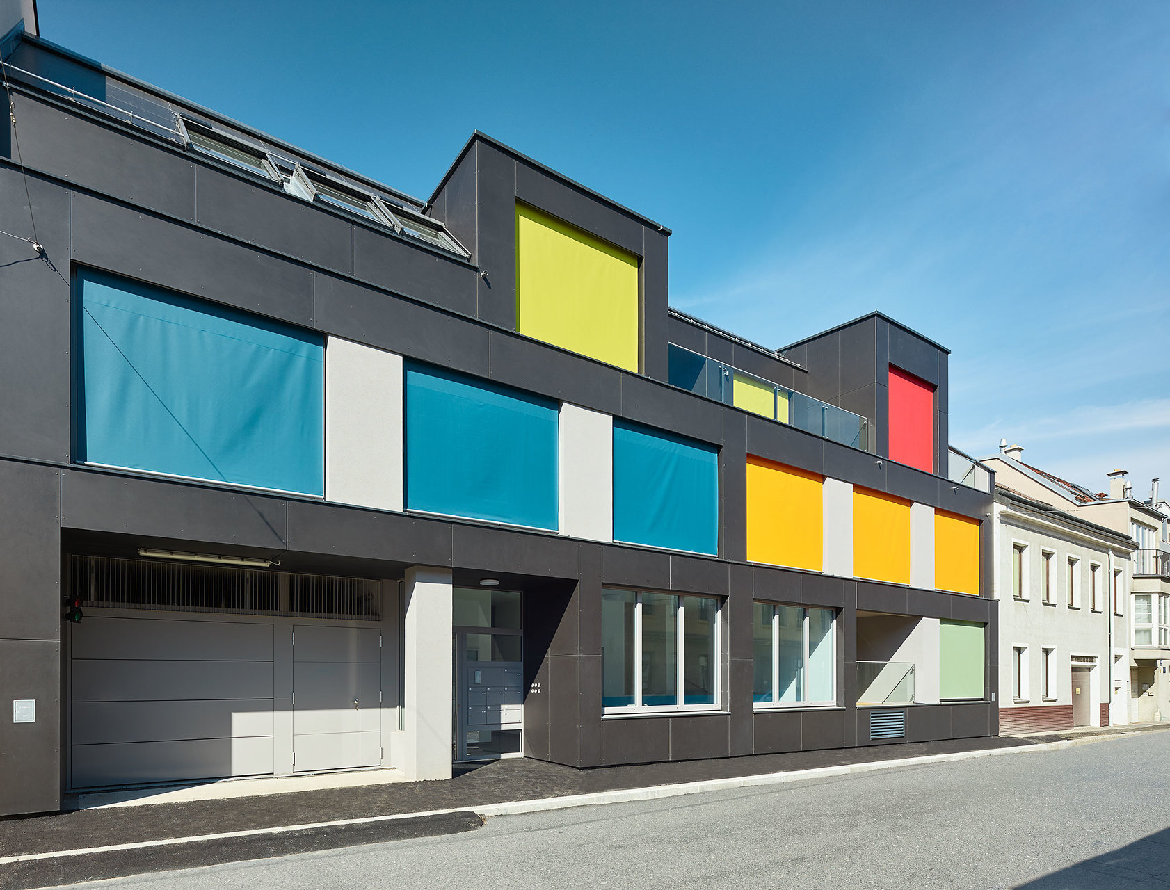 Die Straßenfassade stuft sich pro Geschoss ca 10cm nach hinten ab. Schwarze Eternittafeln bilden einen Rahmen um jede Wohneinheit. Verstärkt wird die Wirkung noch durch den Sonnenschutz, jede Wohnungen hat ihre eigene Farbe.