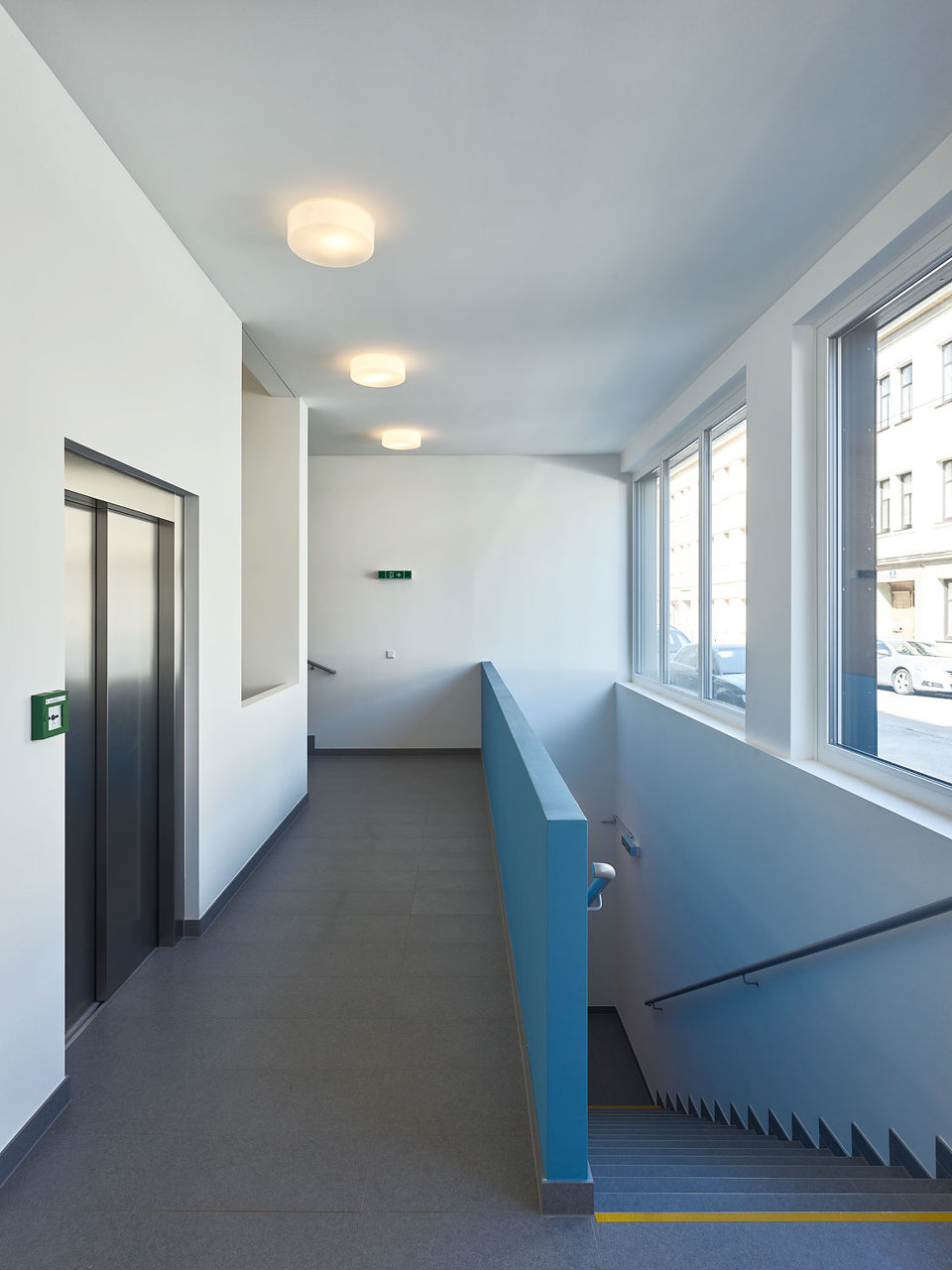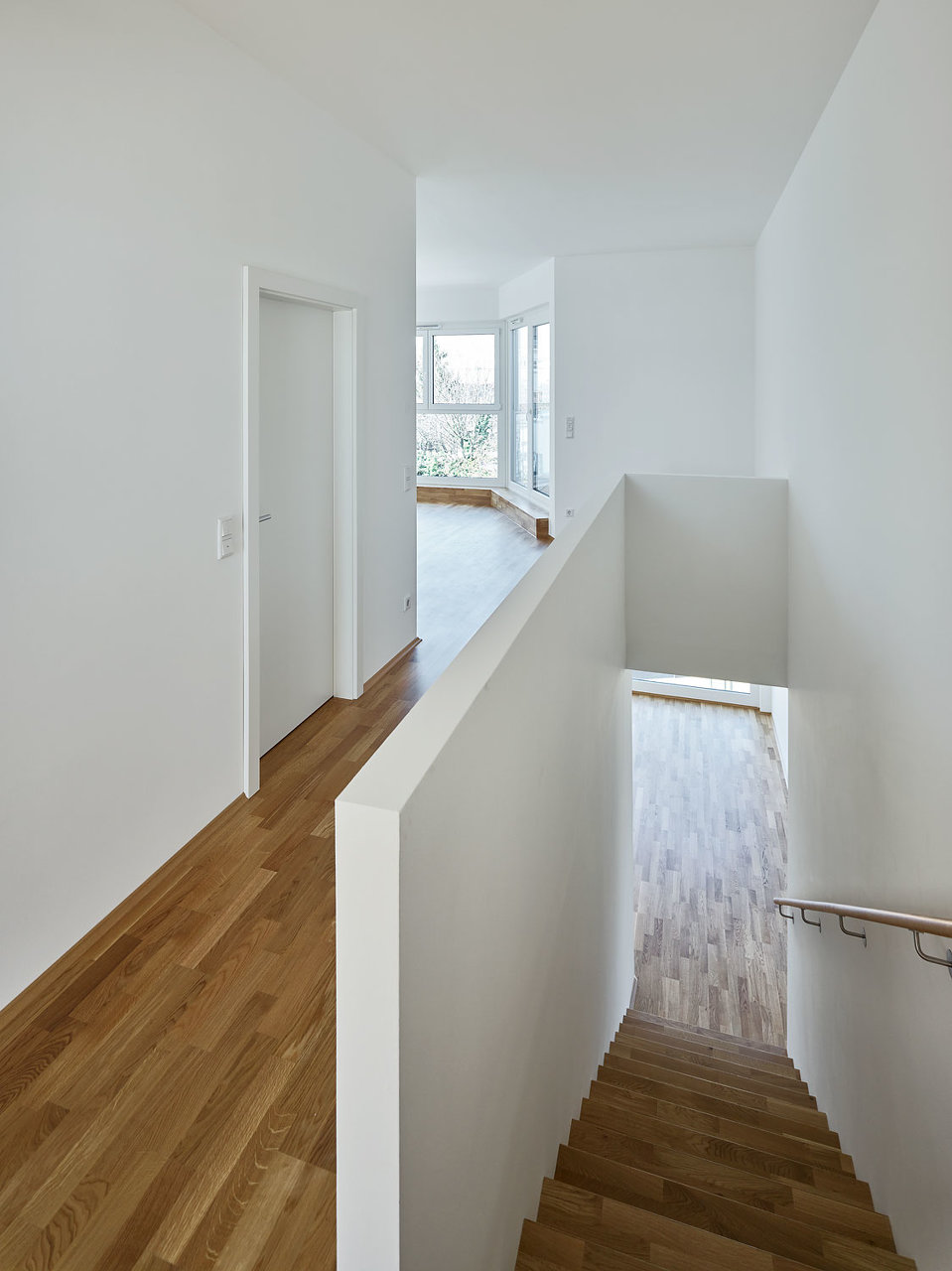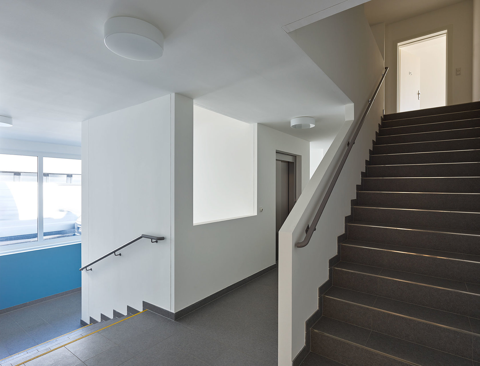 Die 7 Wohnungen werden von einem zentralen Stiegenhaus erschlossen, das durch einen Lichtturm natürlich belichtet wird. Die Erdgeschosswohnungen sind ein halbes Geschoss angehoben, damit sind sie nicht direkt einsichtig. Um die Erschliessungsfläche möglichst kompakt zu halten werden zwei Wohnungen als Maisonetten angelegt. Somit können alle Wohnungen bis auf die kleine Einheit im Erdgeschoss zweiseitig belichtet werden.