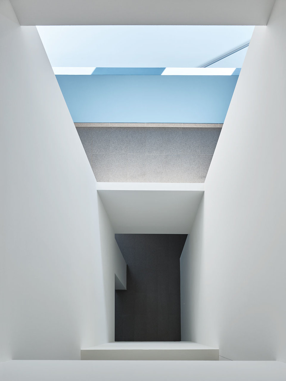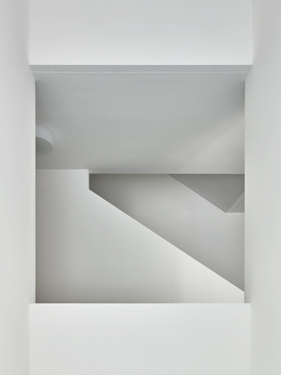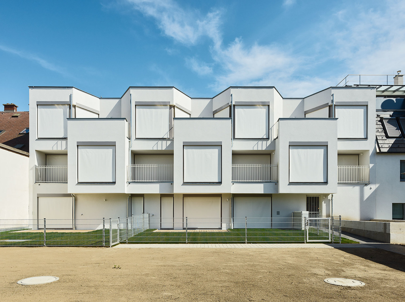 Die 7 Wohnungen werden von einem zentralen Stiegenhaus erschlossen, das durch einen Lichtturm natürlich belichtet wird. Die Erdgeschosswohnungen sind ein halbes Geschoss angehoben, damit sind sie nicht direkt einsichtig. Um die Erschliessungsfläche möglichst kompakt zu halten werden zwei Wohnungen als Maisonetten angelegt. Somit können alle Wohnungen bis auf die kleine Einheit im Erdgeschoss zweiseitig belichtet werden.