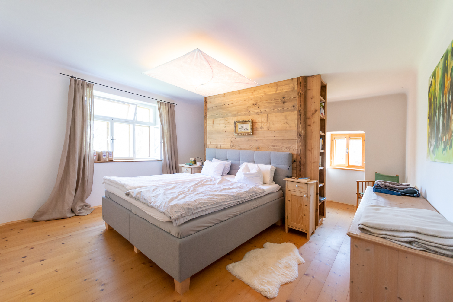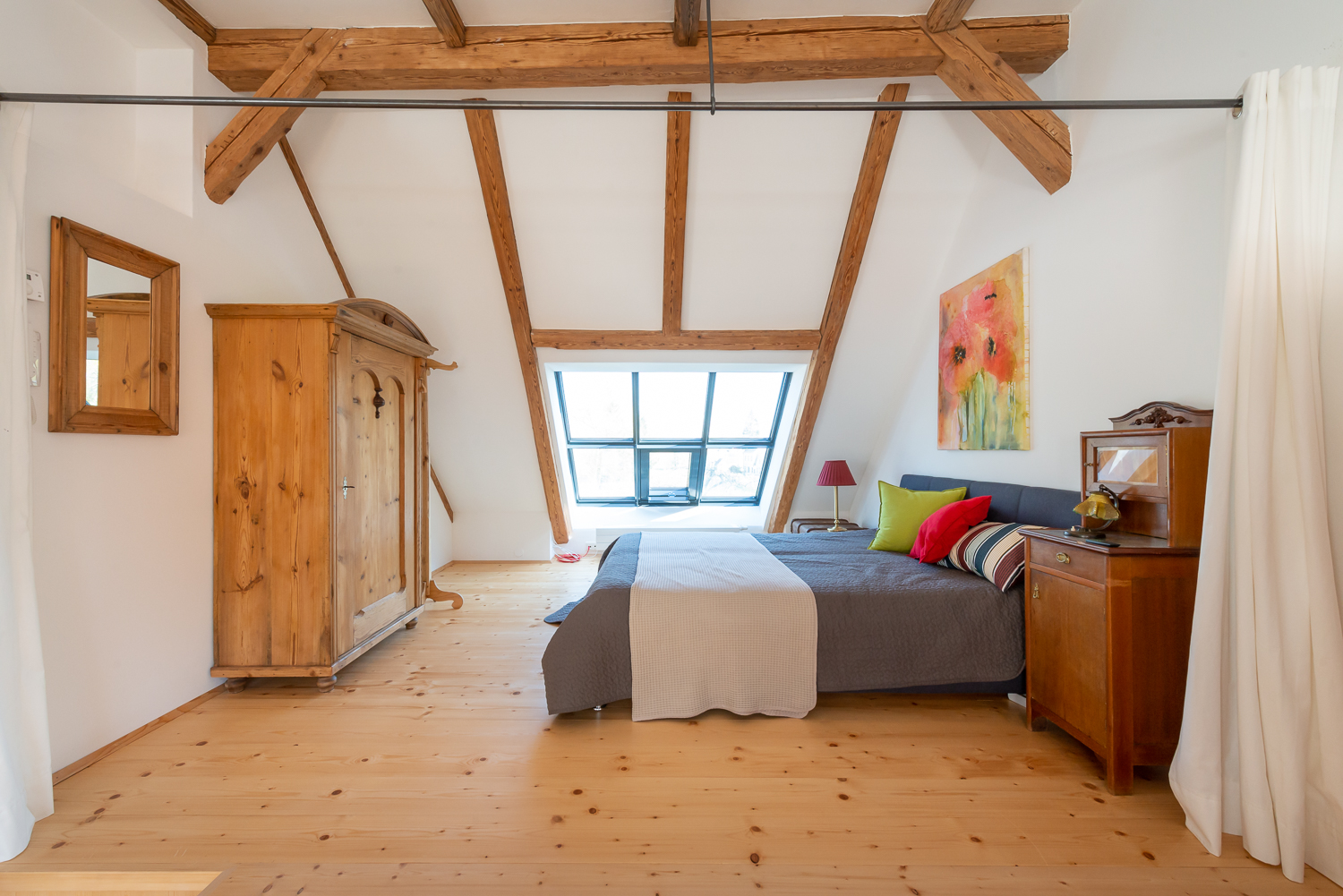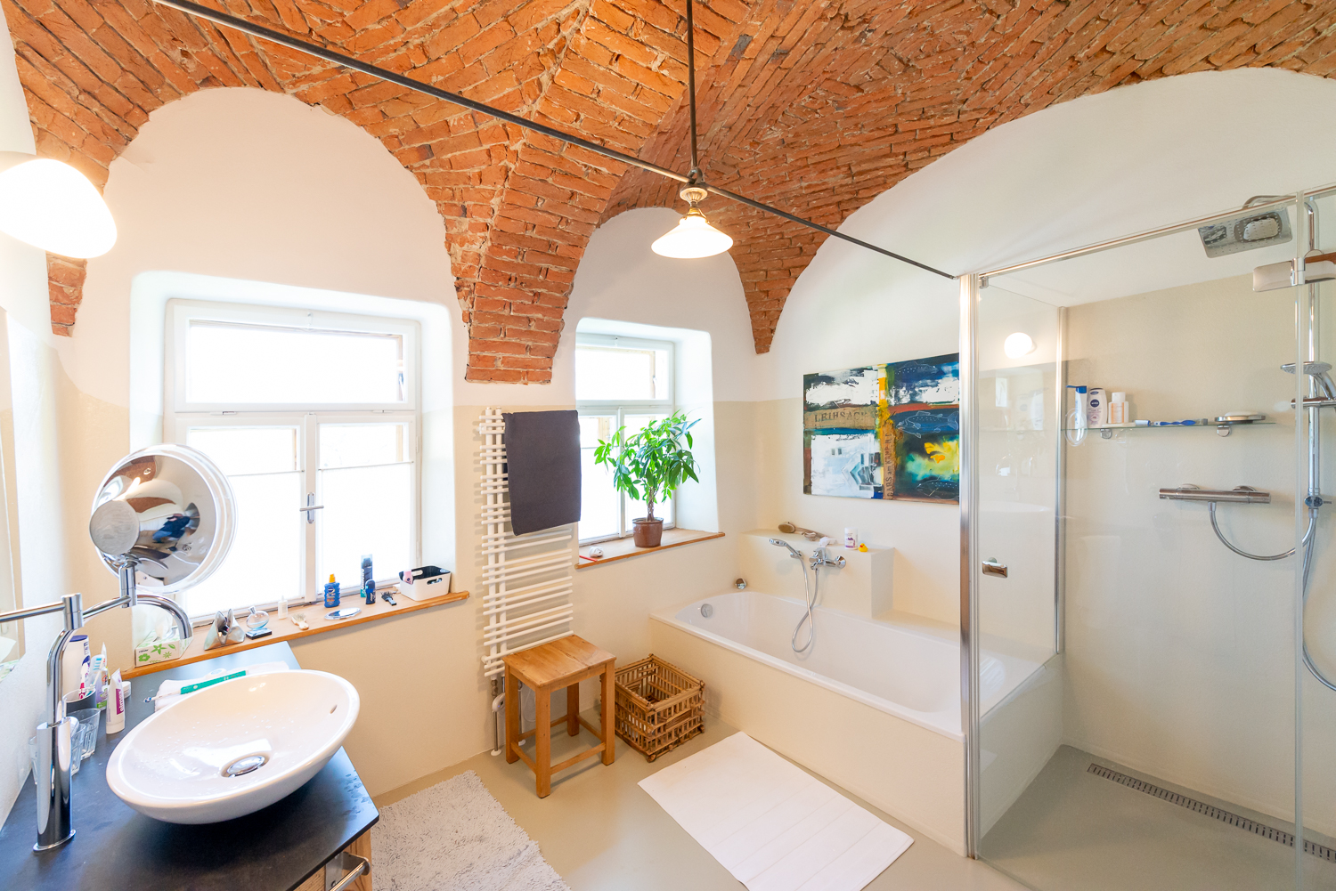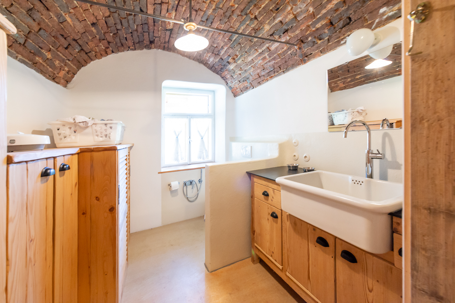 Die alte Mühle war nicht nur identitätsstiftend für das Anwesen, sondern für den ganzen Ort. Daher war die grundsätzliche Entscheidung für ihren Erhalt und eine schonende Sanierung sehr schnell gefallen.Für das Mauerwerk stellte sich die Sanierung als sehr herausfordernd dar, nachdem der Grundwasserspiegel schon immer bis knapp unter das Erdniveau reichte und die Wände daher jahrzehntelanger Feuchtigkeitseinwirkung ausgesetzt waren. Sie wurden alle durchgeschnitten und die erdanliegenden Fußböden erneuert.