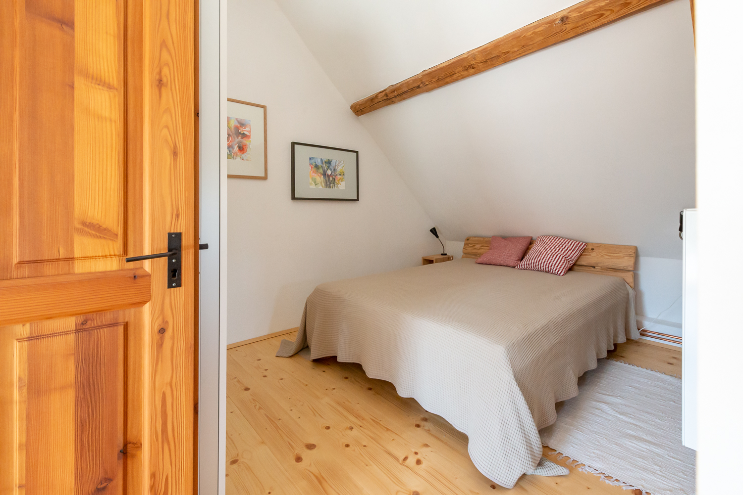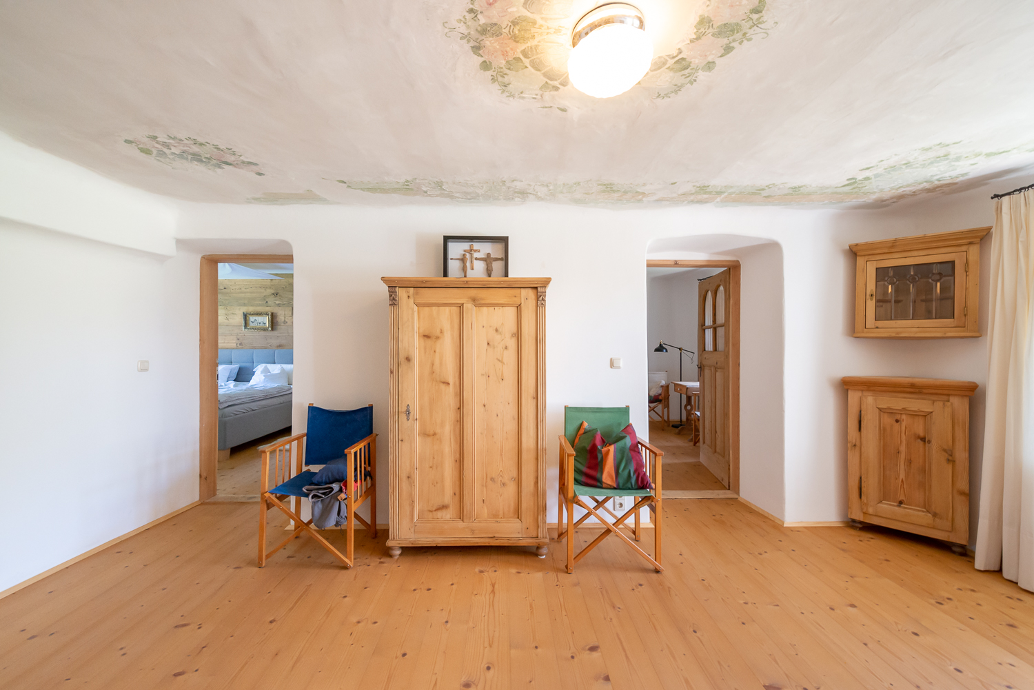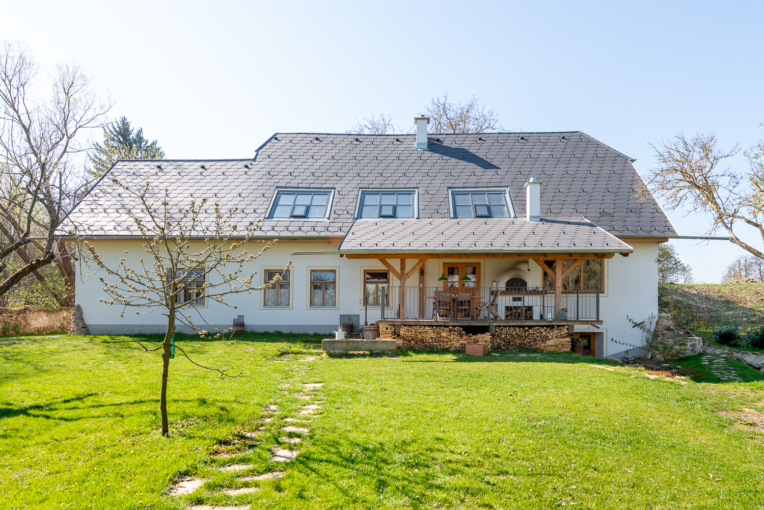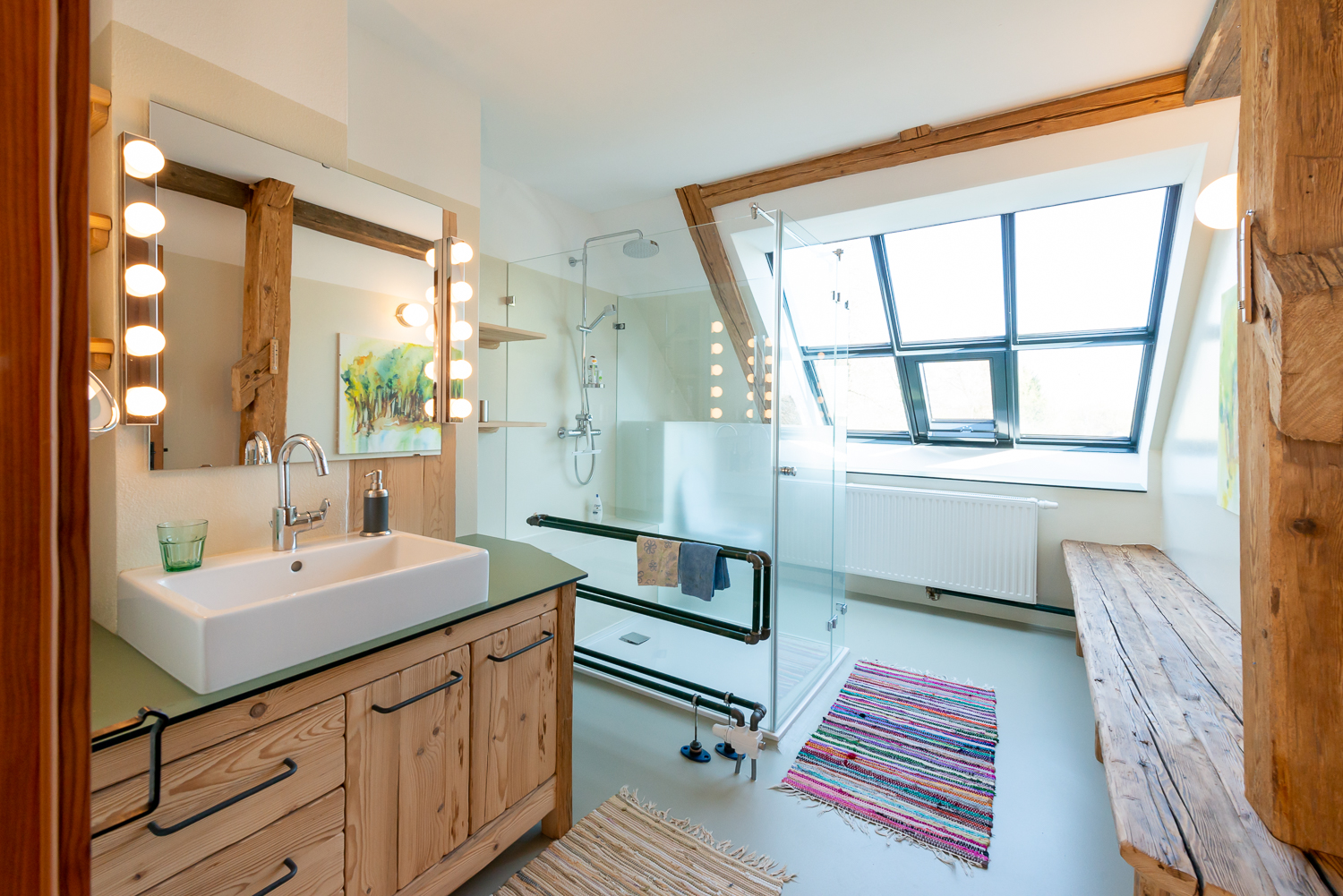 Die alte Mühle war nicht nur identitätsstiftend für das Anwesen, sondern für den ganzen Ort. Daher war die grundsätzliche Entscheidung für ihren Erhalt und eine schonende Sanierung sehr schnell gefallen.Für das Mauerwerk stellte sich die Sanierung als sehr herausfordernd dar, nachdem der Grundwasserspiegel schon immer bis knapp unter das Erdniveau reichte und die Wände daher jahrzehntelanger Feuchtigkeitseinwirkung ausgesetzt waren. Sie wurden alle durchgeschnitten und die erdanliegenden Fußböden erneuert.