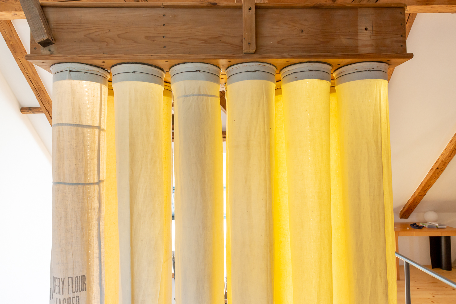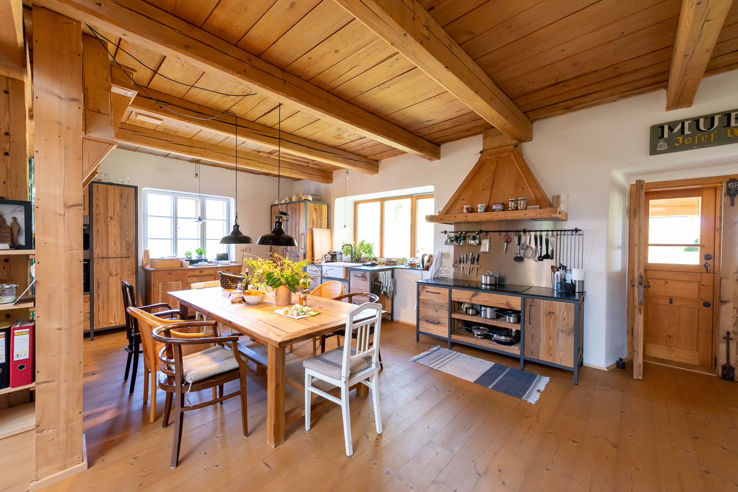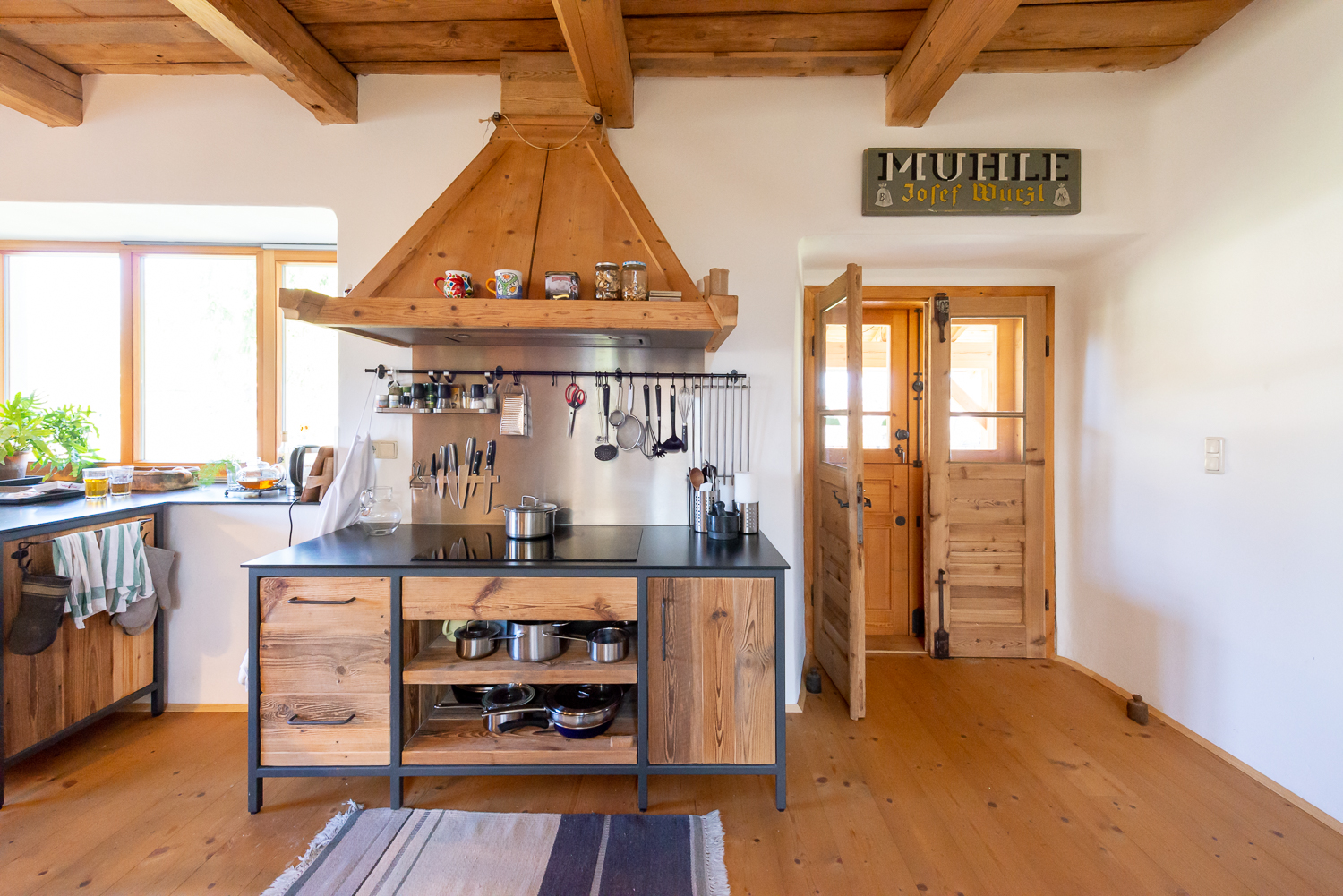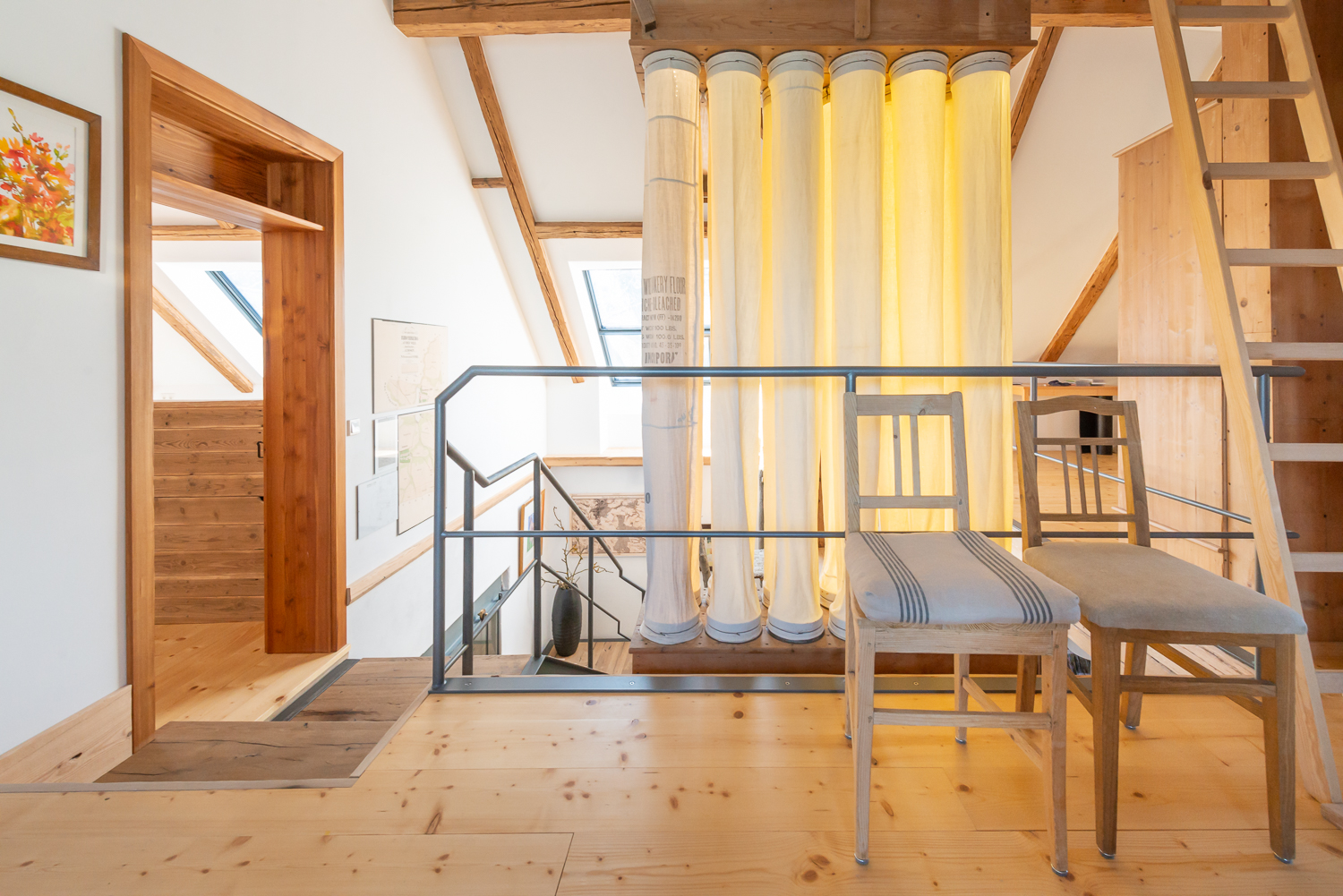 Das durch den Umbau anfallende Altholz wurde für den Bau der neuen Küche, der neuen Stiege oder neue Türen – in alter Mühlentradition oft in Kombination mit Schwarzstahl – wiederverwendet. In direkter Nachbarschaft zu vielen ebenfalls erhaltenen Elementen aus der Mühlenmechanik dominiert dieses Gestaltungskonzept das Gebäude und trägt so den ursprünglichen Charakter aus der eigenartigen vormaligen Nutzung auch in die Zukunft.