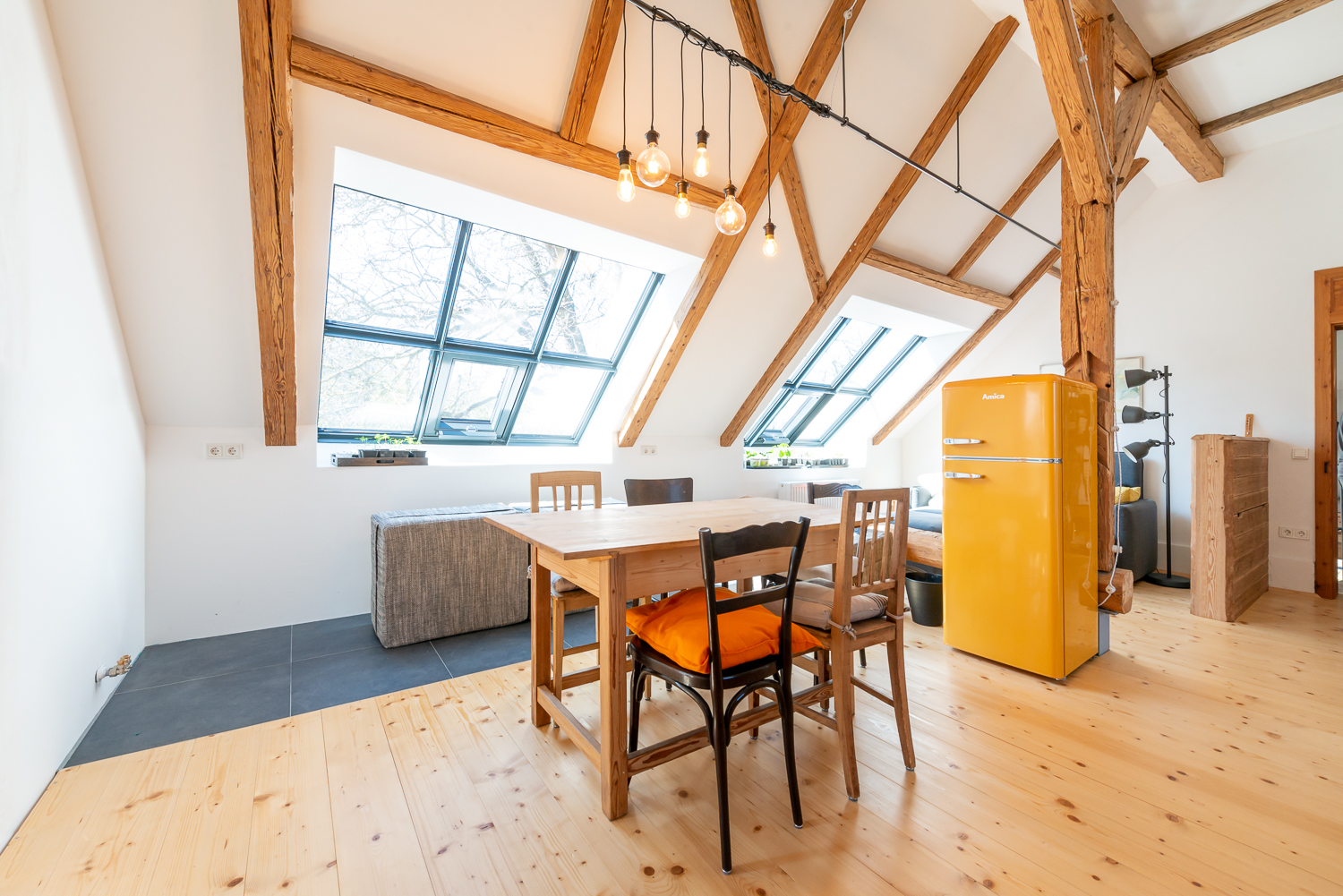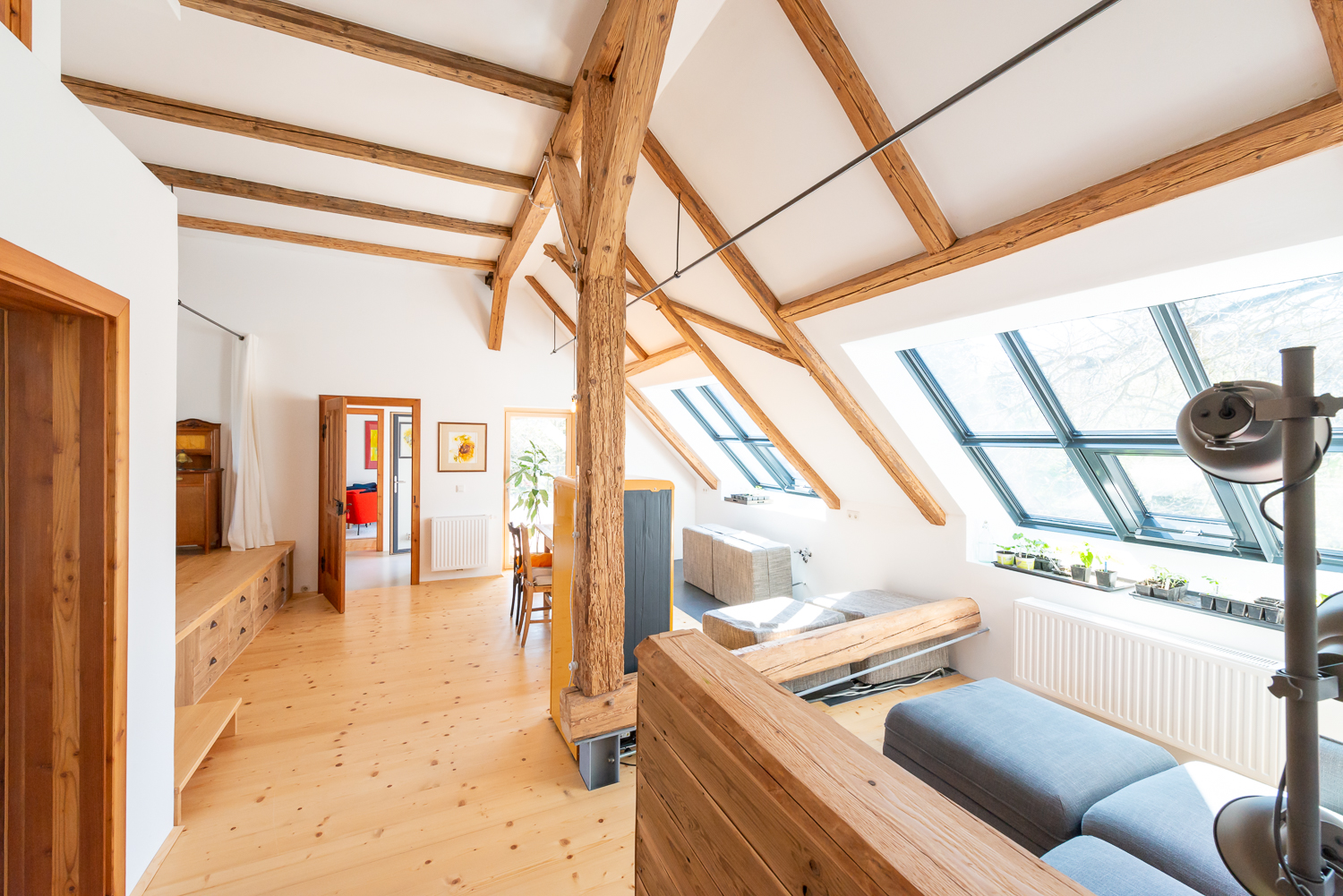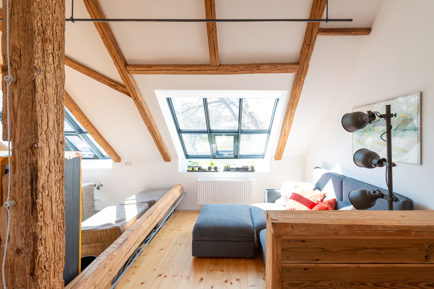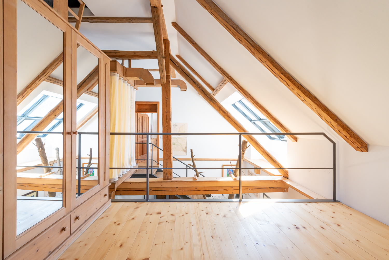 Die Holzkonstruktion der Zwischendecken und des Dachstuhls hingegen hatte die bisherige Lebensdauer hervorragend überstanden und mußte nur an wenigen Stellen für den neuen Ausbau ertüchtigt werden. Daher konnte sie in großem Umfang sichtbar bleiben. Der hinterlüftete neue Dachaufbau wurde mit einer Sparrenaufdoppelung hergestellt, zwischen deren neuen Schalungen die Wärmedämmung eingeblasen wurde.