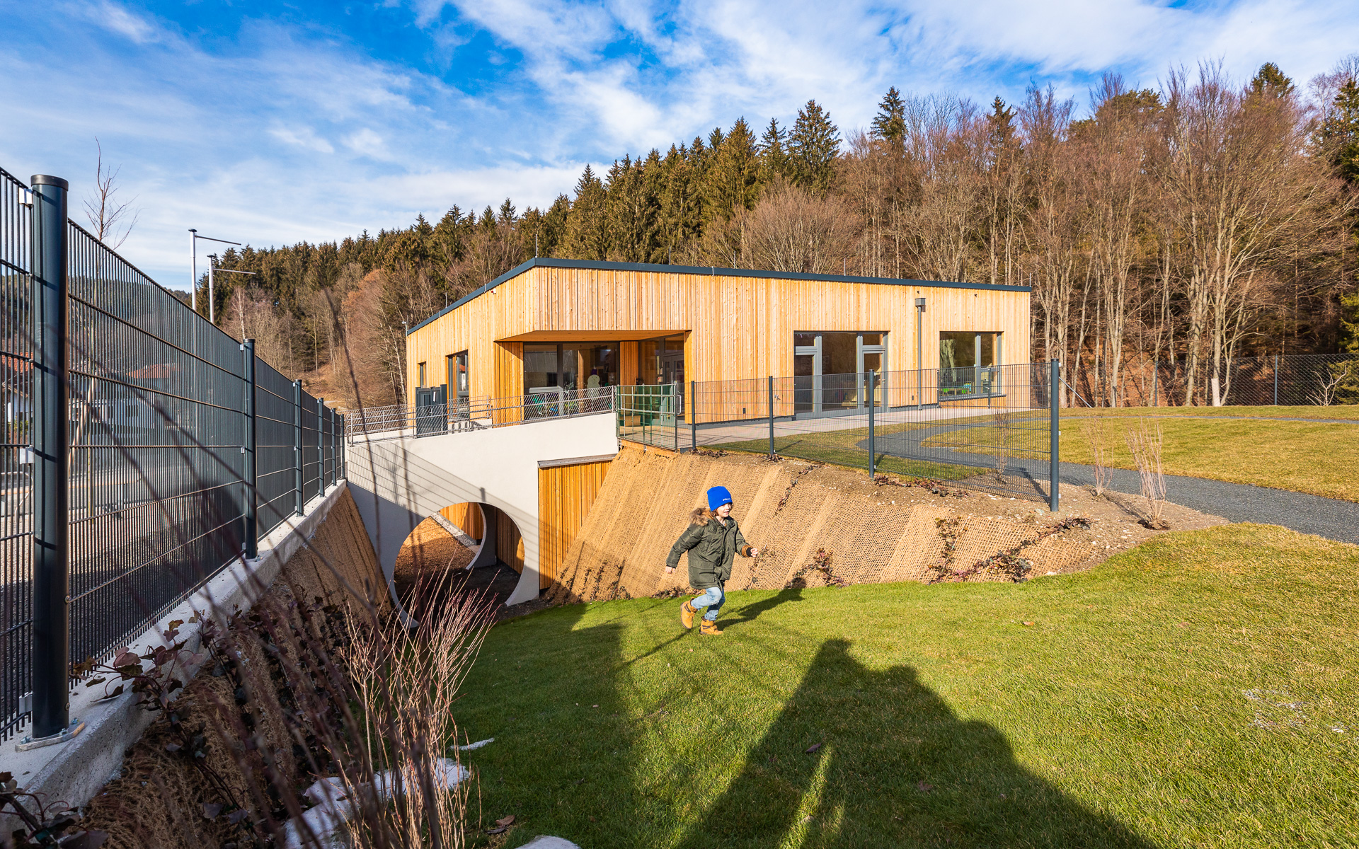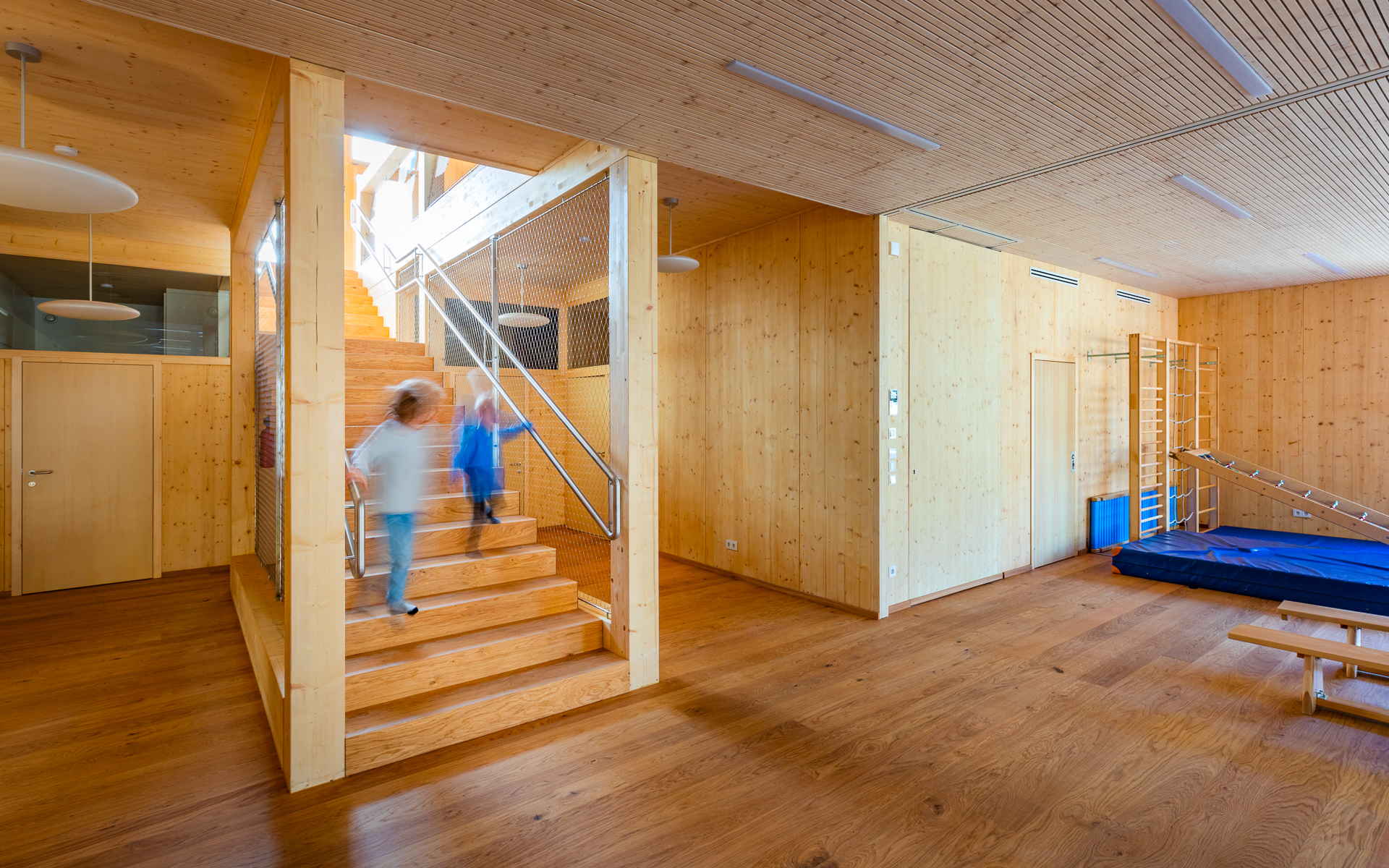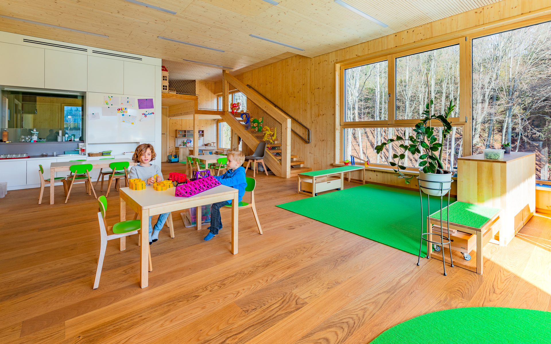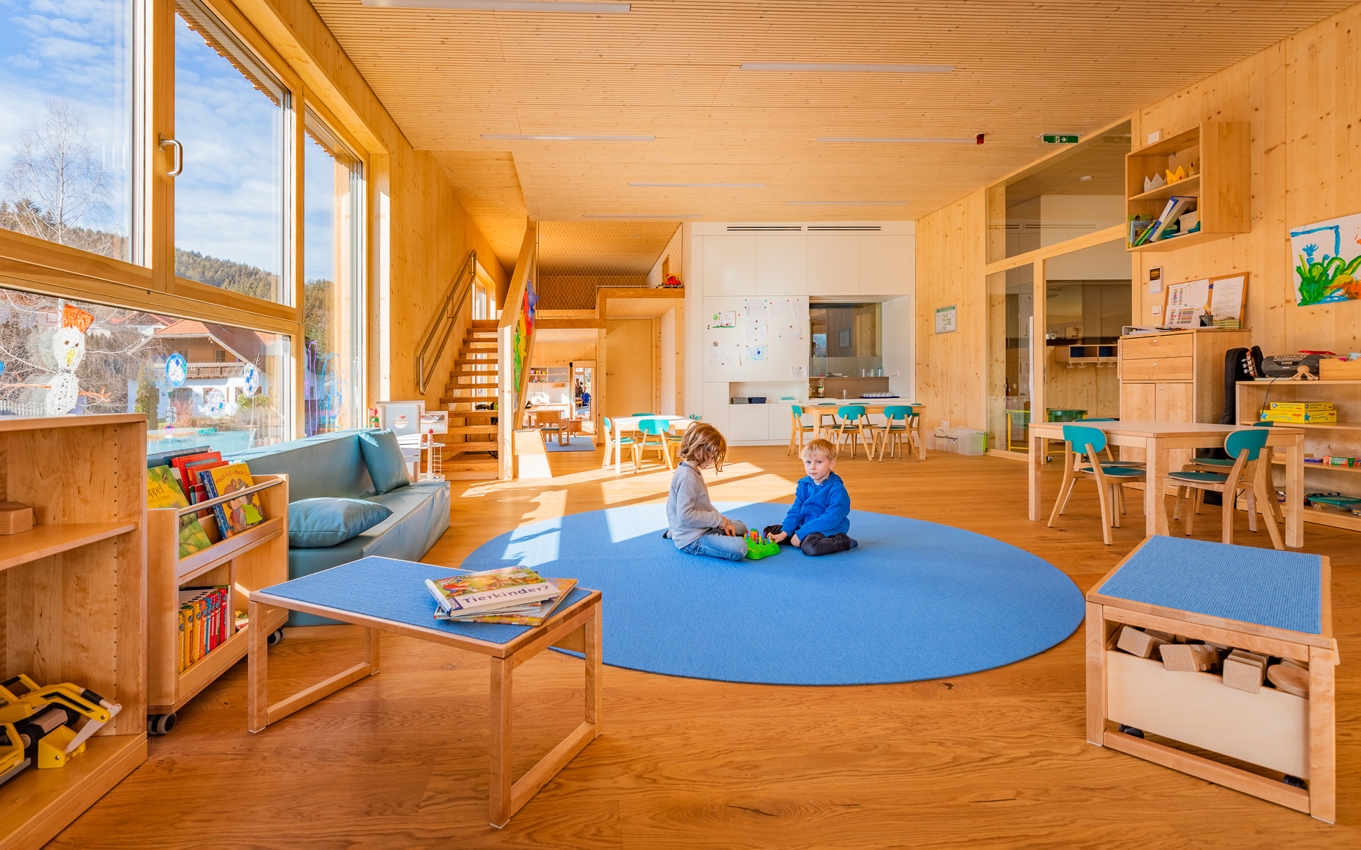 Als Holzerlebnis pur kann man wohl diesen Kindergarten in Aspangberg–St. Peter bezeichnen. Bis auf die erdberührten Bauteile konstruktiv konsequent in Brettsperrholz-Bauweise umgesetzt, steht dieser Bau für den regional bedingten Einsatz des Werkstoffes Holz und lässt diesen innen wie außen rundum sichtbar. Der Steilheitund begrenzten Größe des Grundstücks geschuldet, werden die Räumlichkeiten auf zwei Ebenen untergebracht und mit einer offenen Holztreppe und darüber liegendem Oberlichtband baulich wie atmosphärisch verbunden. Kindgerechte Raumlösungen und großzügige Blickverbindungen in die umliegende Naturlandschaft schaffen optimale Nutzungsbedingungen. (Text: Jurytext Holzbaupreis Niederösterreich 2019)