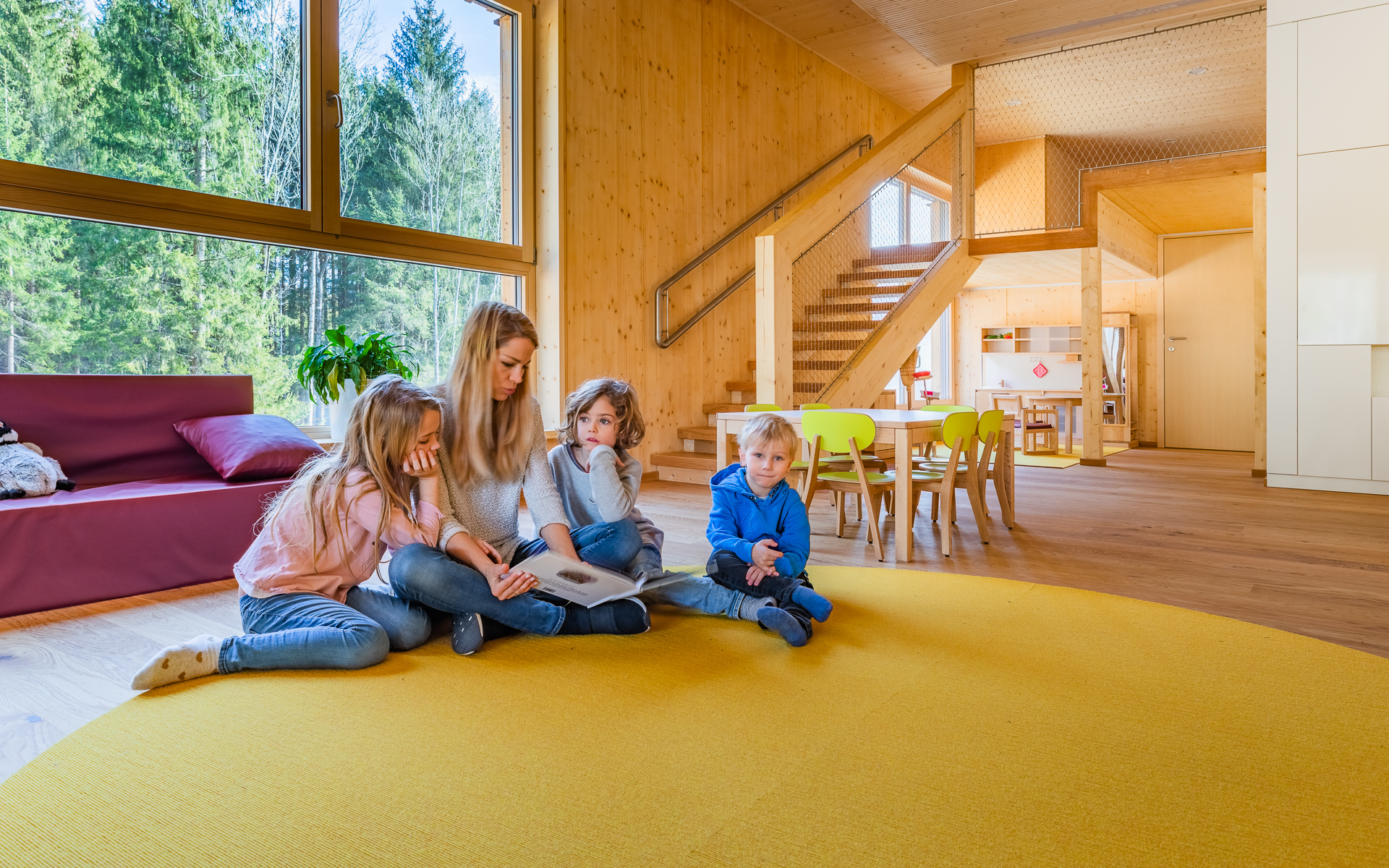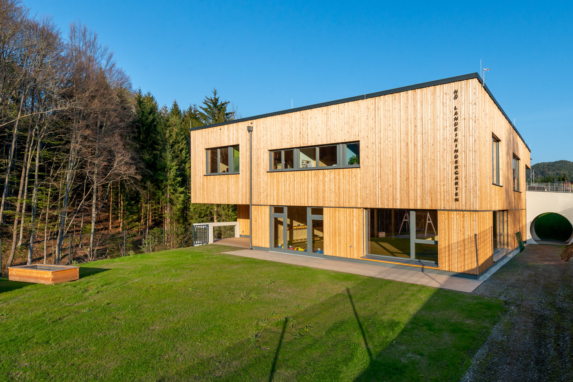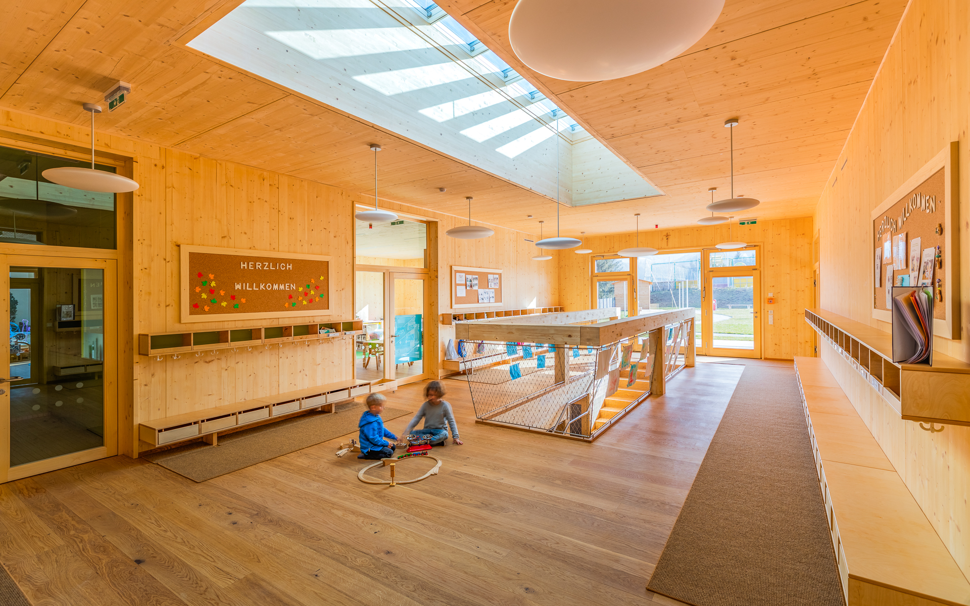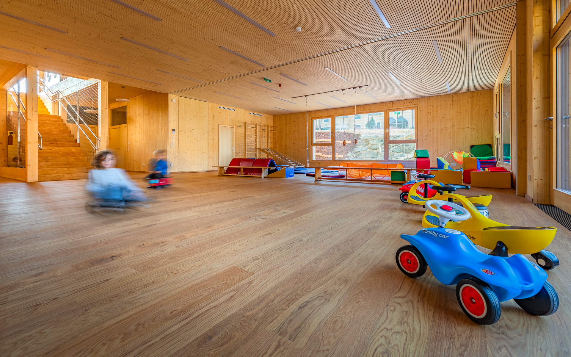 Als Holzerlebnis pur kann man wohl diesen Kindergarten in Aspangberg–St. Peter bezeichnen. Bis auf die erdberührten Bauteile konstruktiv konsequent in Brettsperrholz-Bauweise umgesetzt, steht dieser Bau für den regional bedingten Einsatz des Werkstoffes Holz und lässt diesen innen wie außen rundum sichtbar. Der Steilheitund begrenzten Größe des Grundstücks geschuldet, werden die Räumlichkeiten auf zwei Ebenen untergebracht und mit einer offenen Holztreppe und darüber liegendem Oberlichtband baulich wie atmosphärisch verbunden. Kindgerechte Raumlösungen und großzügige Blickverbindungen in die umliegende Naturlandschaft schaffen optimale Nutzungsbedingungen. (Text: Jurytext Holzbaupreis Niederösterreich 2019)
