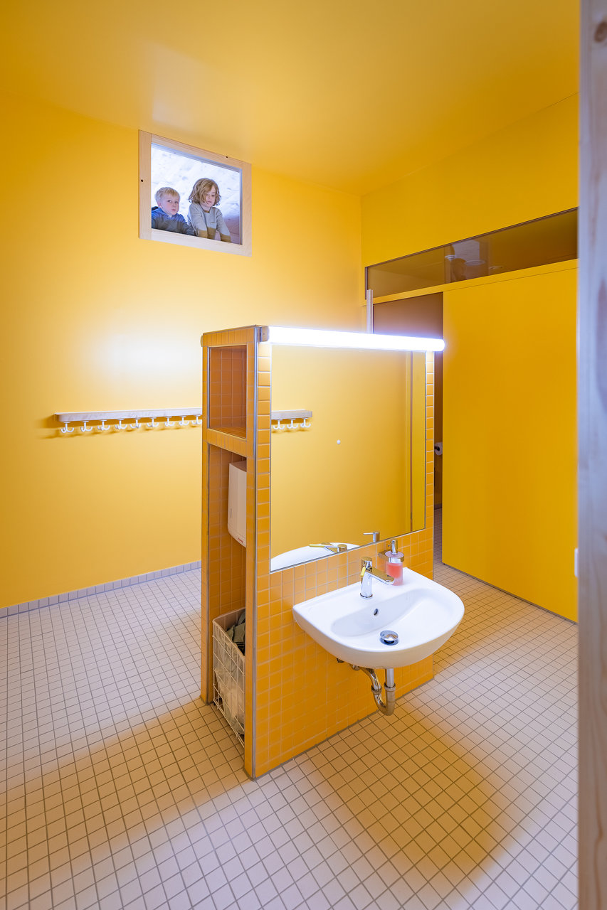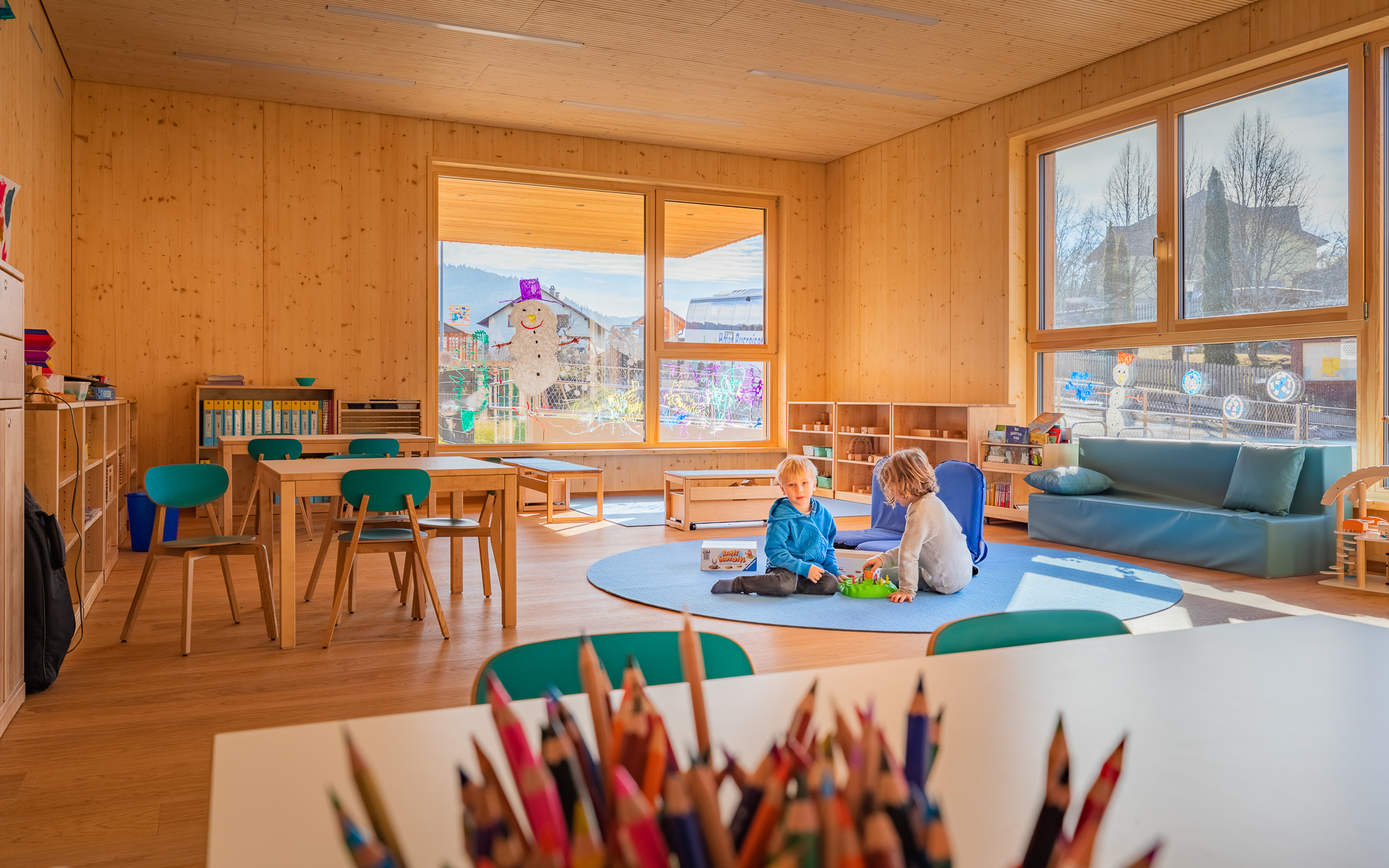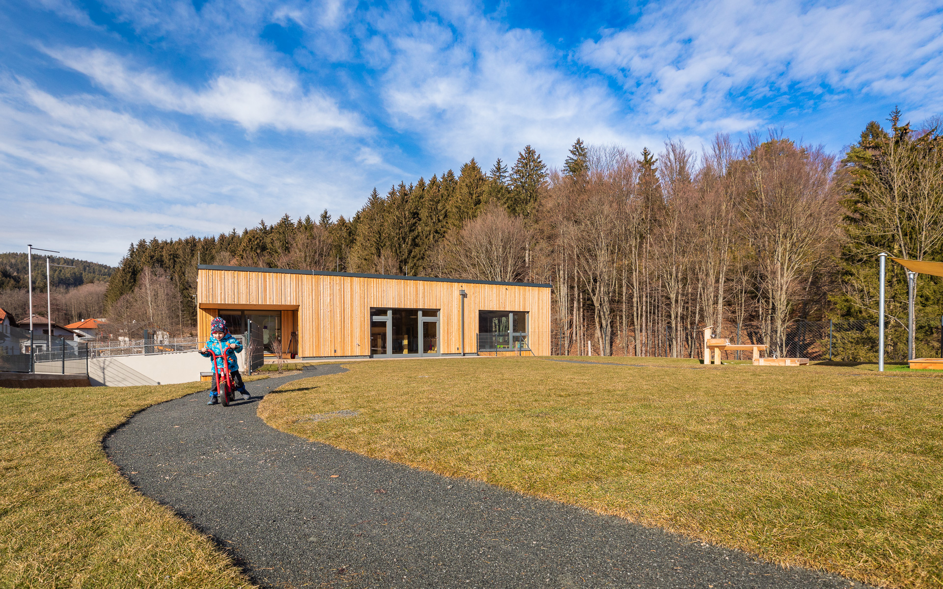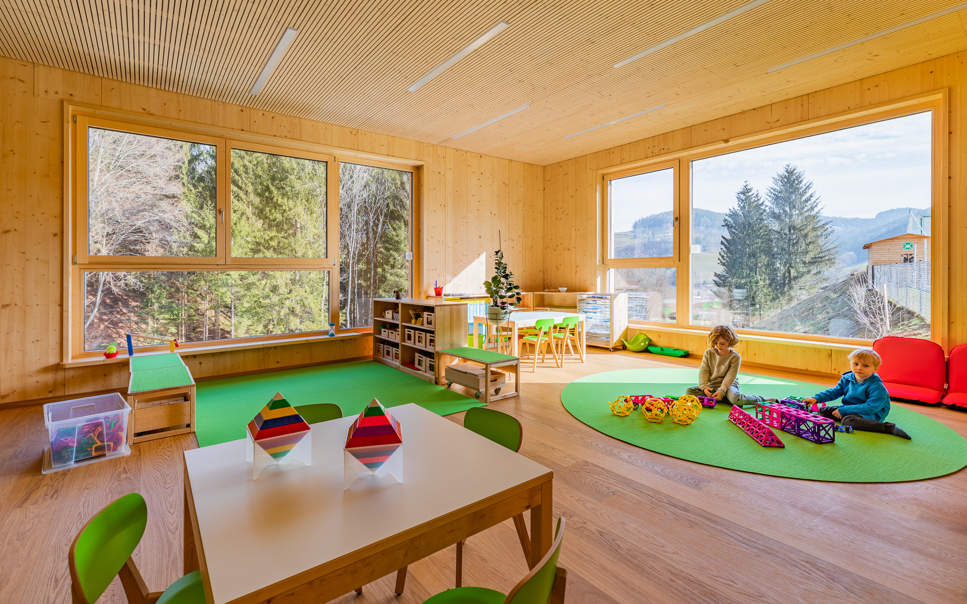 Als Holzerlebnis pur kann man wohl diesen Kindergarten in Aspangberg–St. Peter bezeichnen. Bis auf die erdberührten Bauteile konstruktiv konsequent in Brettsperrholz-Bauweise umgesetzt, steht dieser Bau für den regional bedingten Einsatz des Werkstoffes Holz und lässt diesen innen wie außen rundum sichtbar. Der Steilheitund begrenzten Größe des Grundstücks geschuldet, werden die Räumlichkeiten auf zwei Ebenen untergebracht und mit einer offenen Holztreppe und darüber liegendem Oberlichtband baulich wie atmosphärisch verbunden. Kindgerechte Raumlösungen und großzügige Blickverbindungen in die umliegende Naturlandschaft schaffen optimale Nutzungsbedingungen. (Text: Jurytext Holzbaupreis Niederösterreich 2019)