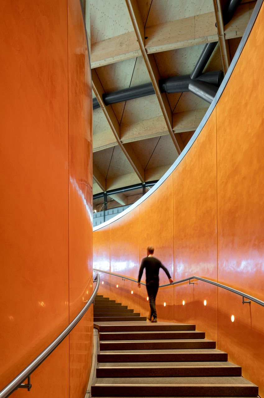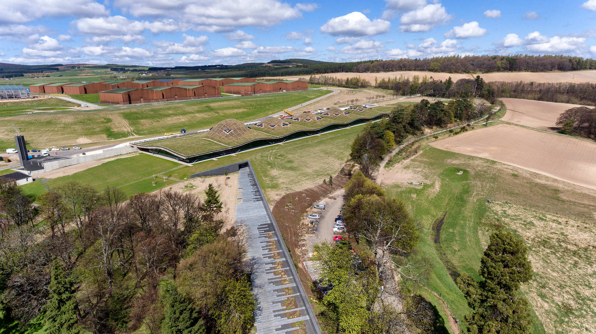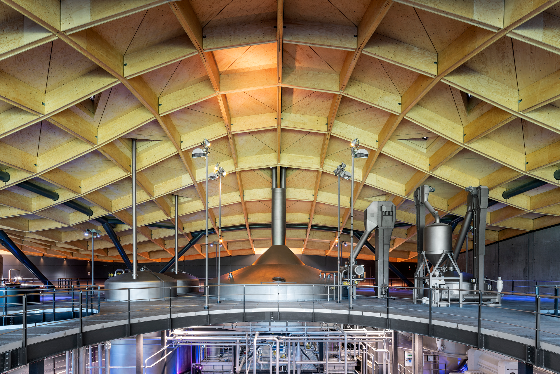 Die imposante Dachkonstruktion der Whisky-Brennerei in Schottland ist über eine Grünfläche mit fünf Kuppeln gespannt. Das Gründach kommt auf einem Holzdach zum Liegen und besteht aus fünf Kuppeln mit auslaufendem Vordach. Die gewaltigen Holzdachkonstruktion mit den Abmessungen 63 x 207 Meter besteht aus 1.800 einfach gekrümmten auf der Oberseite segmentierten abgegrateten Trägern mit zweiseitig beplanten Kerto (Dünnschicht-Furnierholzplatten). Es werden 2.700 zumeist dreieckige sowie rechteckige Dachelemente angefertigt, die sich über eine Fläche von 12.300m² erstrecken. Das Dach folgt dem architektonischen Grundraster von 3 x 3 Meter. Die Träger sind entsprechend segmentiert und folgen ihrer Neigung aufgrund der Lage in der Kuppel. Die Dachkonstruktion überzeugt durch ihre Eleganz der Tragstruktur und fügt sich harmonisch in die Landschaft. (Text: Jurytext Holzbaupreis Niederösterreich 2019)