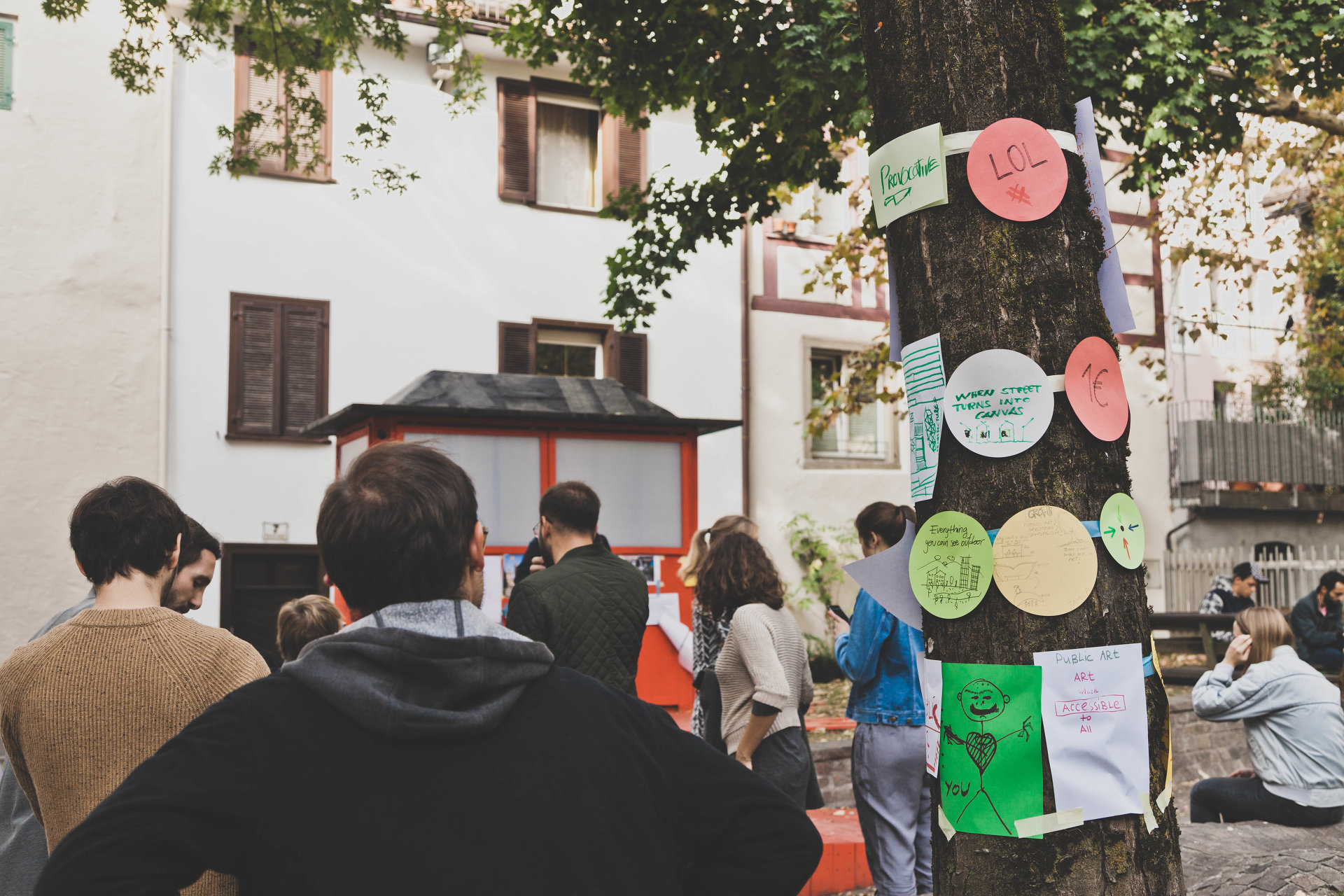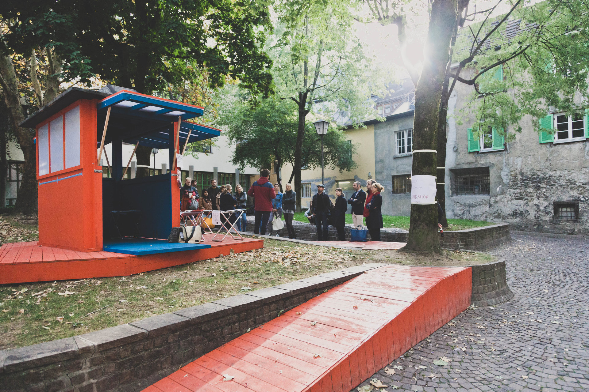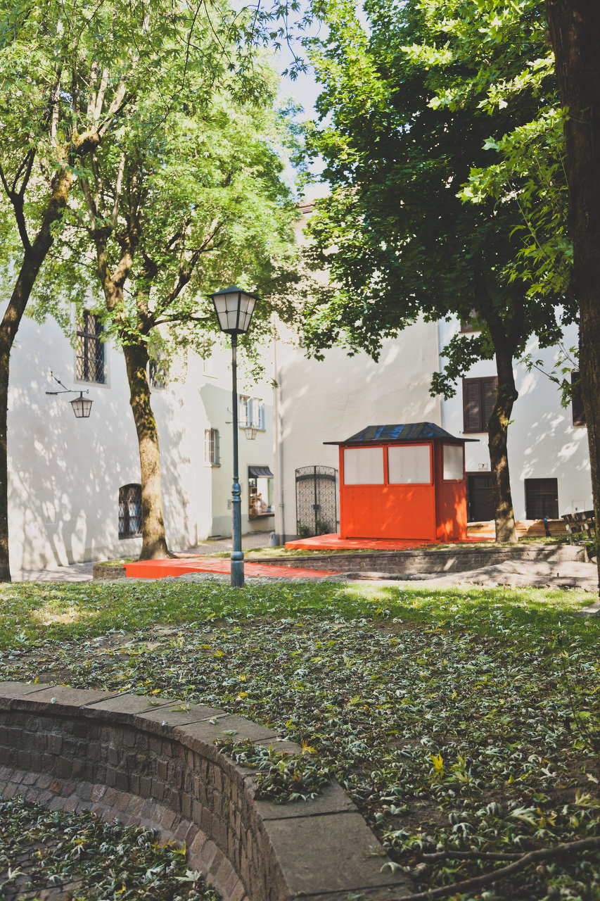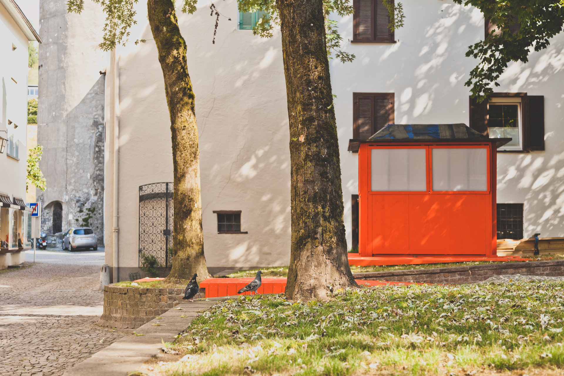Mit geringem Budget und gespendeten Materialien errichteten die Studierenden die temporäre Architektur innerhalb einer Woche. Inmitten eines leicht erhöhten, ummauerten Rasenstücks, über zwei flache Rampen barrierefrei erschlossen, wurde das kleine, rote Teehaus platziert. Mit Klappläden ließ es sich allseitig öffnen und zeigte dann sein komplementär gefärbtes, tiefblaues Inneres. Das Bauwerk wurde während der Sommermonate als Teebar, für kleine Ausstellungen und Aufführungen genutzt und war einer der Feldkircher Schauplätze der Architekturtage am 24. und 25. Mai 2018. (Text: Tobias Hagleitner)