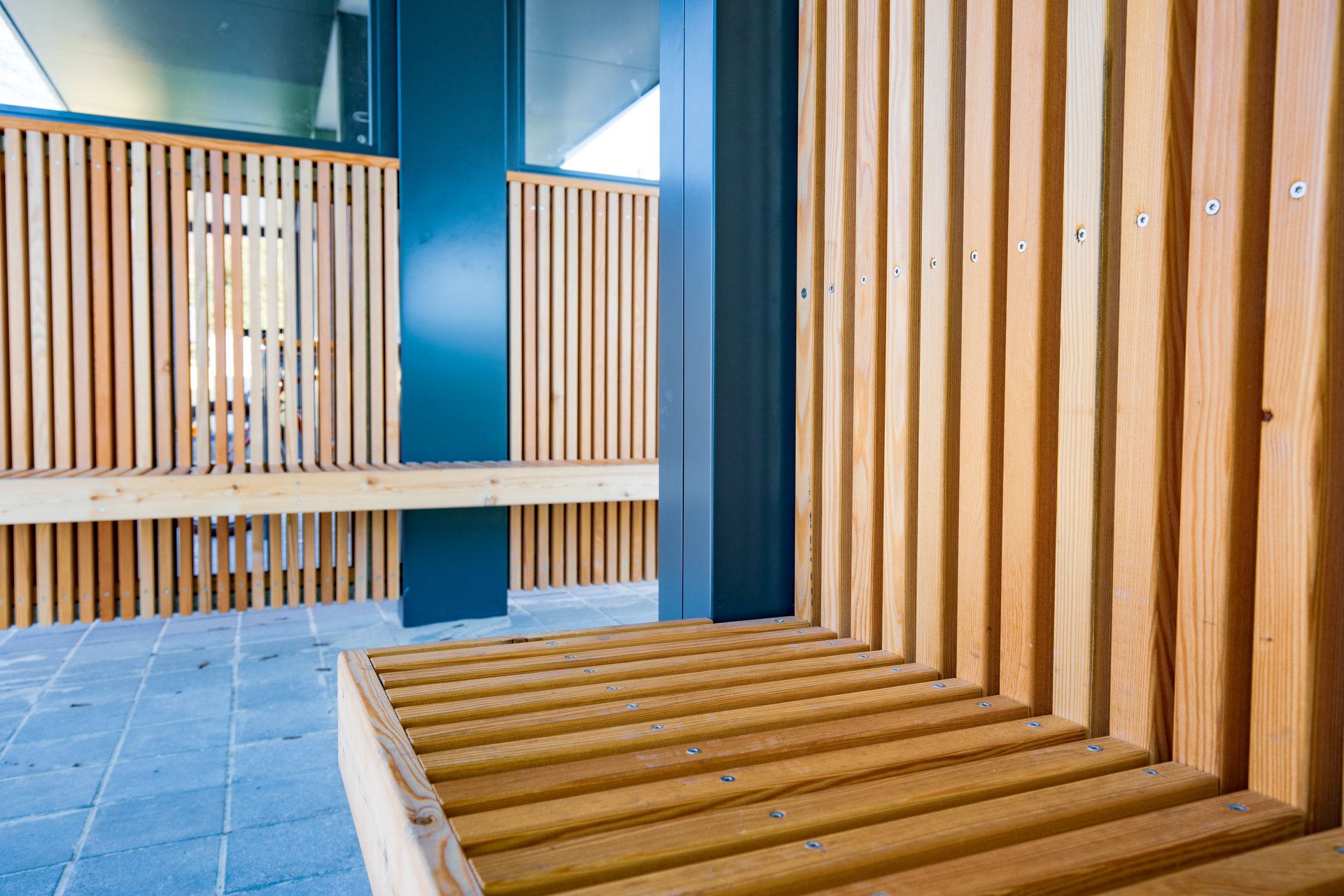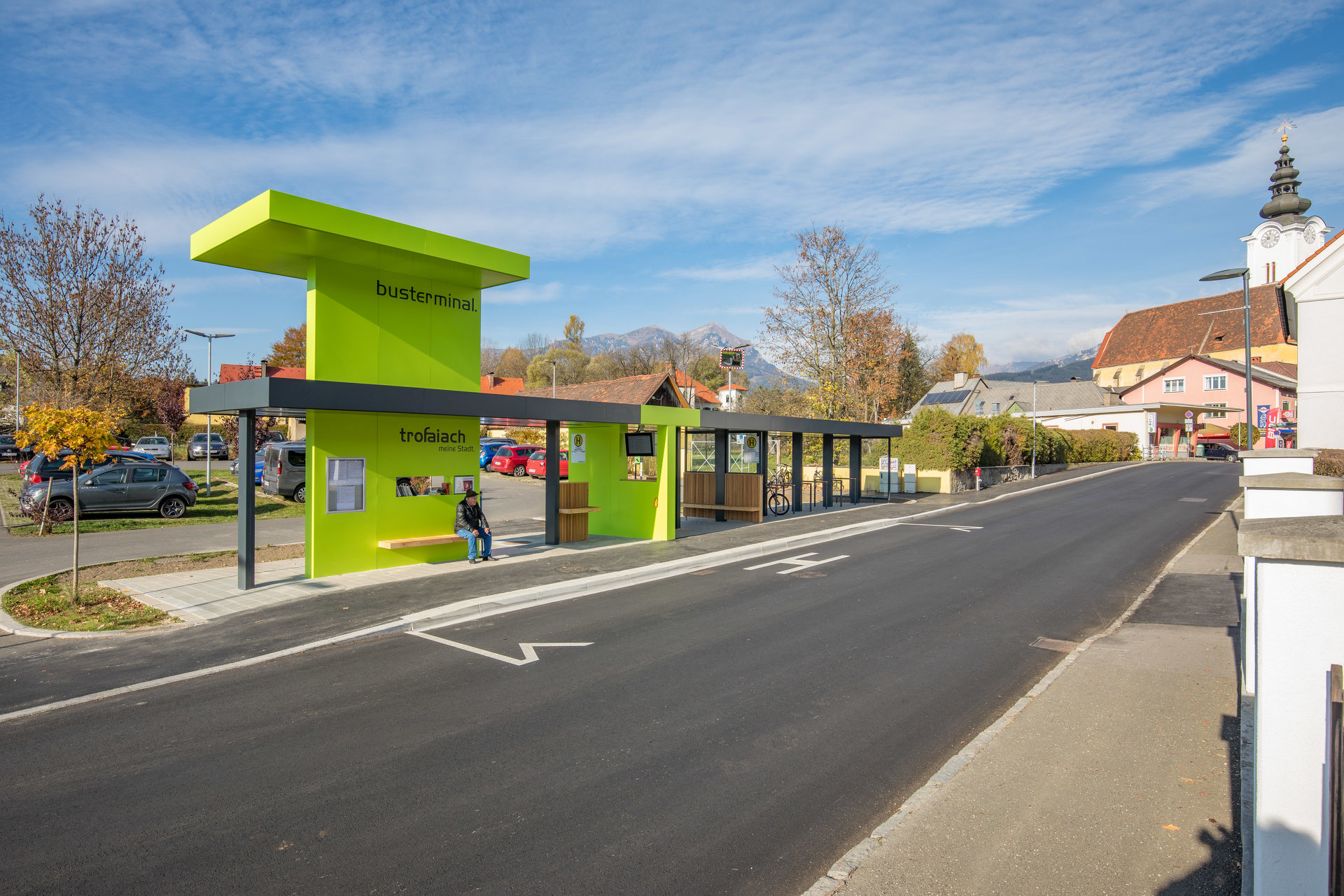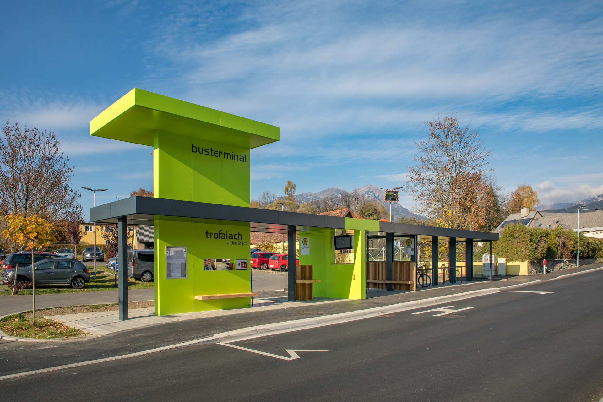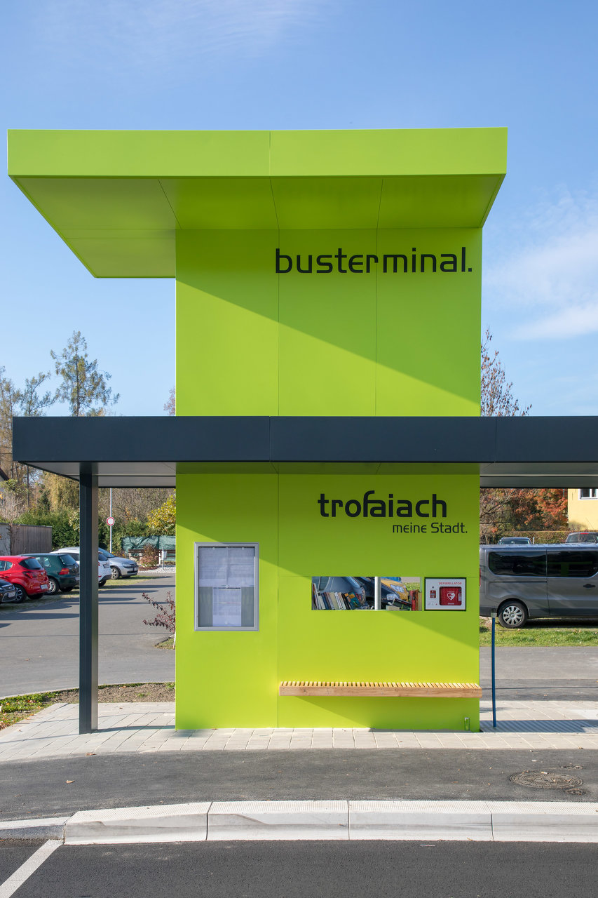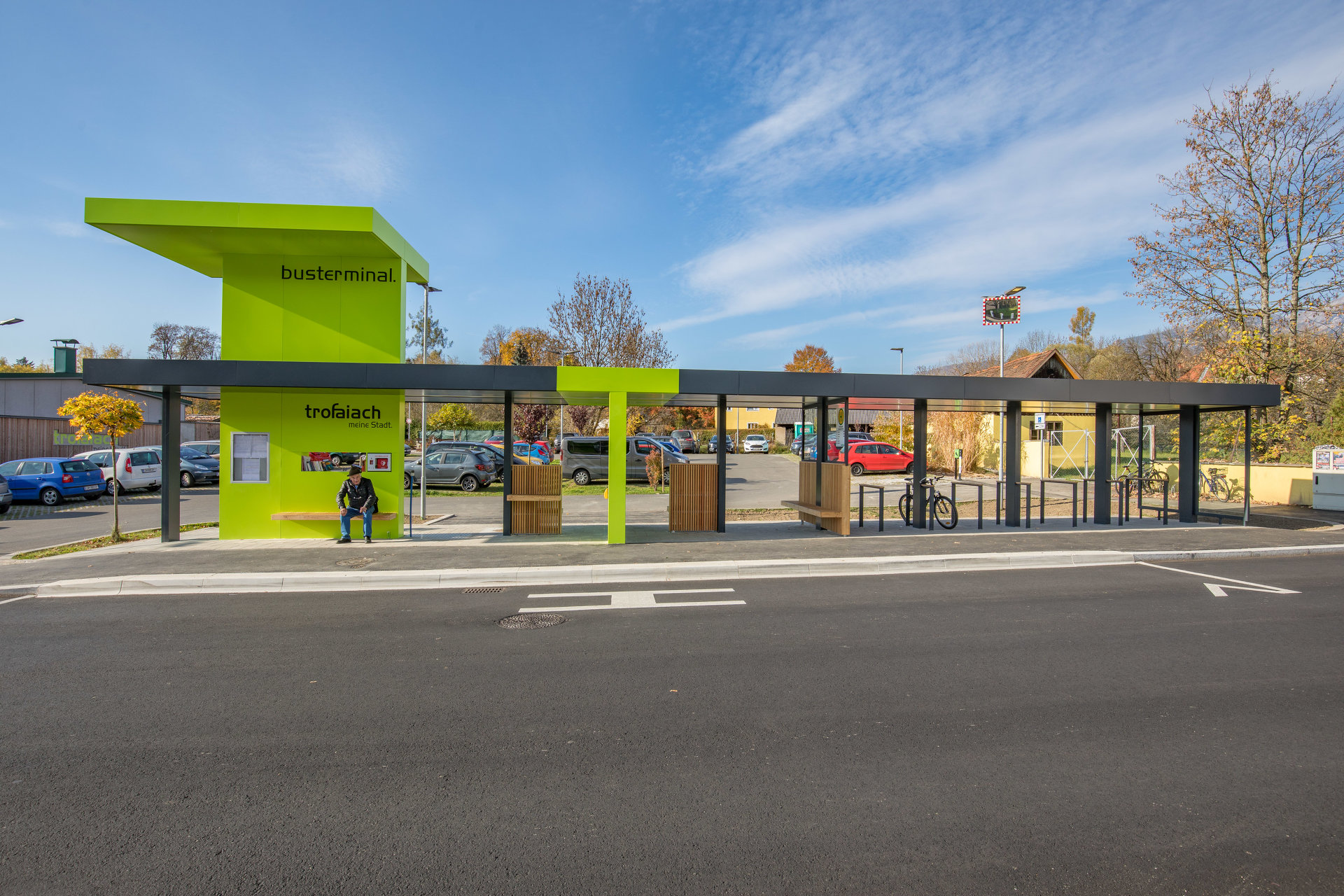 Der Busterminal ist als multimodaler Knoten in Trofaiach Mitte konzipiert, an dem Busse, die im 15-minütigen Takt Trofaiach mit der Bezirkshauptstadt Leoben verbinden, halten und hier Anschluss an Citybusse und Rufbusse haben. Neben der Funktion des Wartens für Busfahrer, befinden sich Radabstellplätze, ein Defibrillator, ein Trinkbrunnen und eine von der Stadtbücherei betreute, öffentlich zugängliche Bücherbox unter einem Dach. Dem Entwurf liegt ein 1,6 x 1 m Raster zugrunde, in den alle verschiedenen Funktionen modulartig eingefügt sind. Es wurde bewusst darauf geachtet die Aufteilung einer üblichen Bushaltestelle in Vorder – und Rückseite aufzulösen, um einen von zwei Seiten zugänglichen überdachten Aufenthaltsbereich zu schaffen. Das langgestreckte Gebäude verläuft entlang der Hauptstraße eingeschoßig und mündet an der Südseite in einem hochgestellten, zweigeschoßig anmutendem T. Insgesamt soll der Terminal als Landmark auf den öffentlichen Verkehr hinweisen. (Text: Architekt:innen)