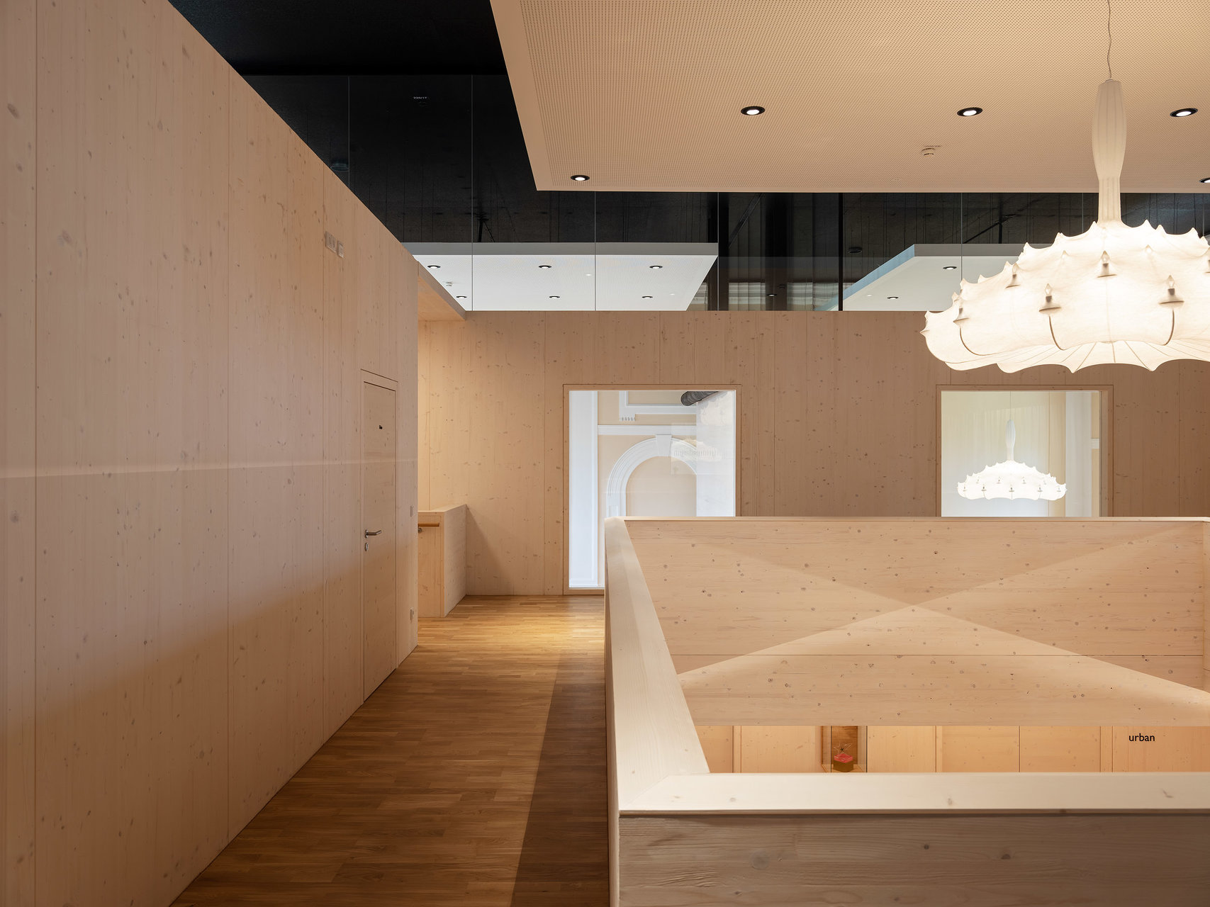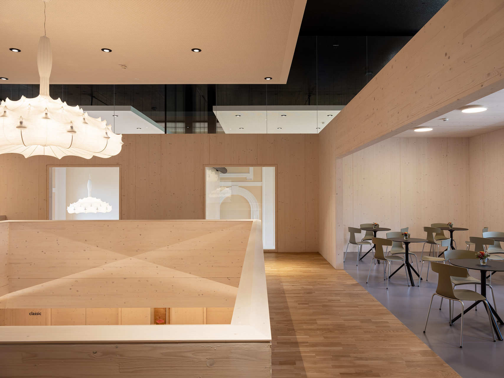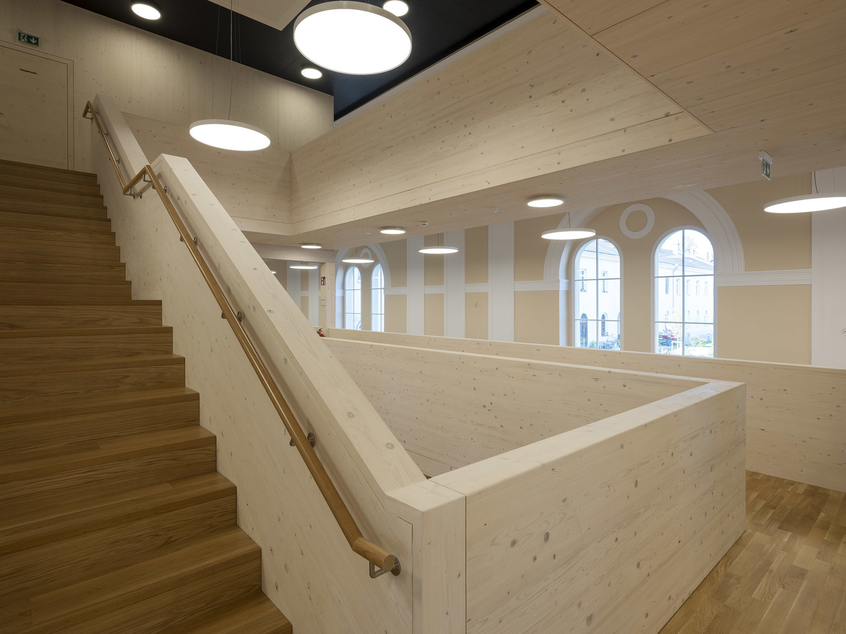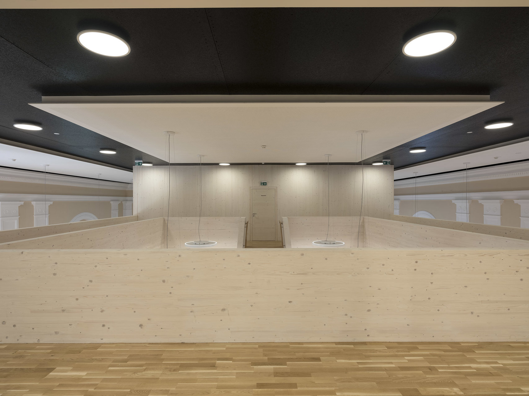 Die historischen Innenwände bleiben weitgehend erhalten, bzw. werden durch neue Fenster in den Sockelzonen ergänzt. Die notwendigen Einbauten, mit Glasfugen zu den Wänden getrennt, werden als weiß lasierte Brettsperrholzkonstruktion wie „Implantate“ beziehungsweise „Raum im Raum“ Konzeption eingefügt. Die ursprüngliche fragile Stahlfachwerkkonstruktion bleibt als Kaltraum hinter einer schwarzen gedämmten Zwischendecke erhalten. Weiße Akustikelemente sind als Schicht unter die dunklen Decken gelegt.