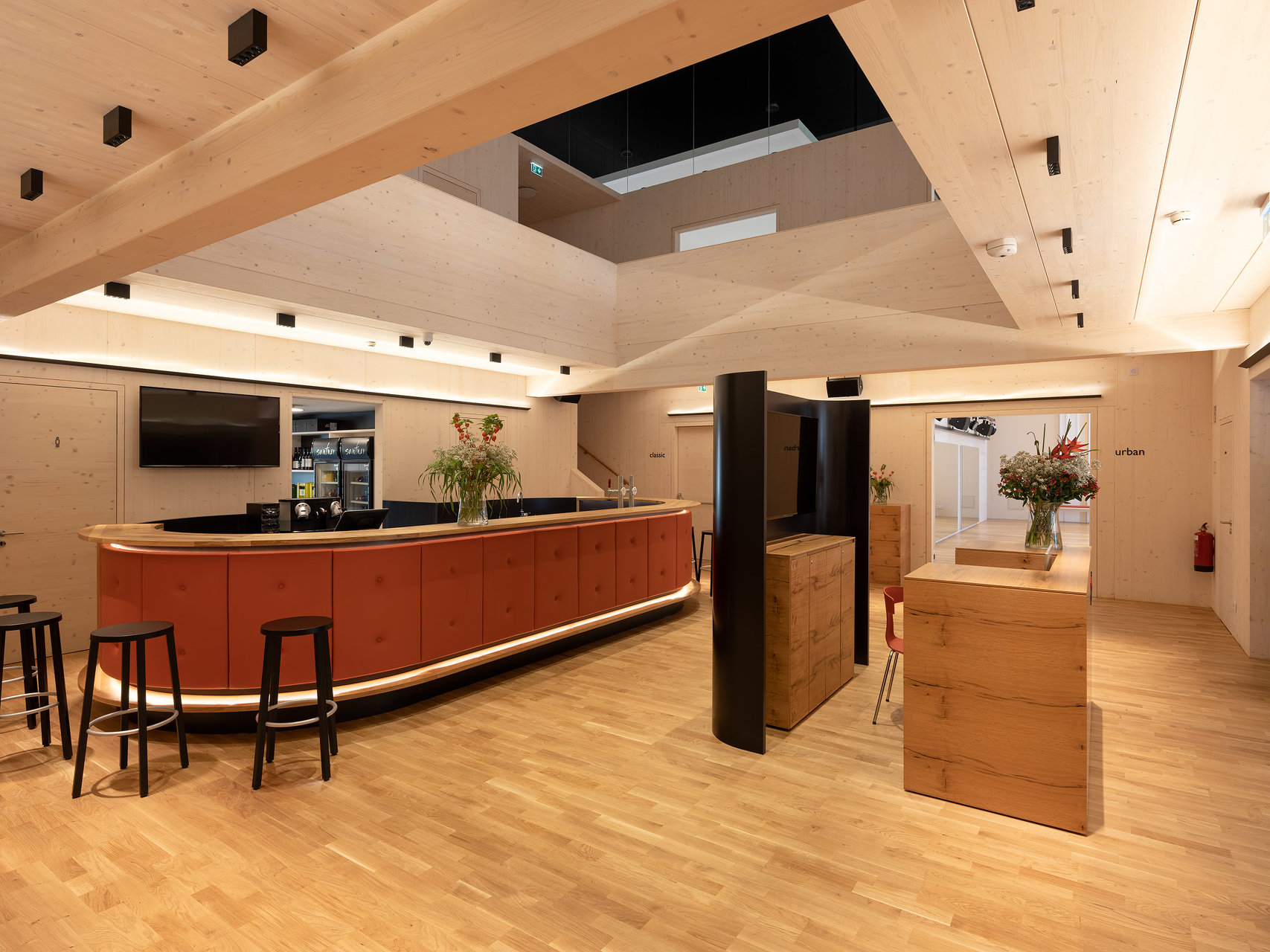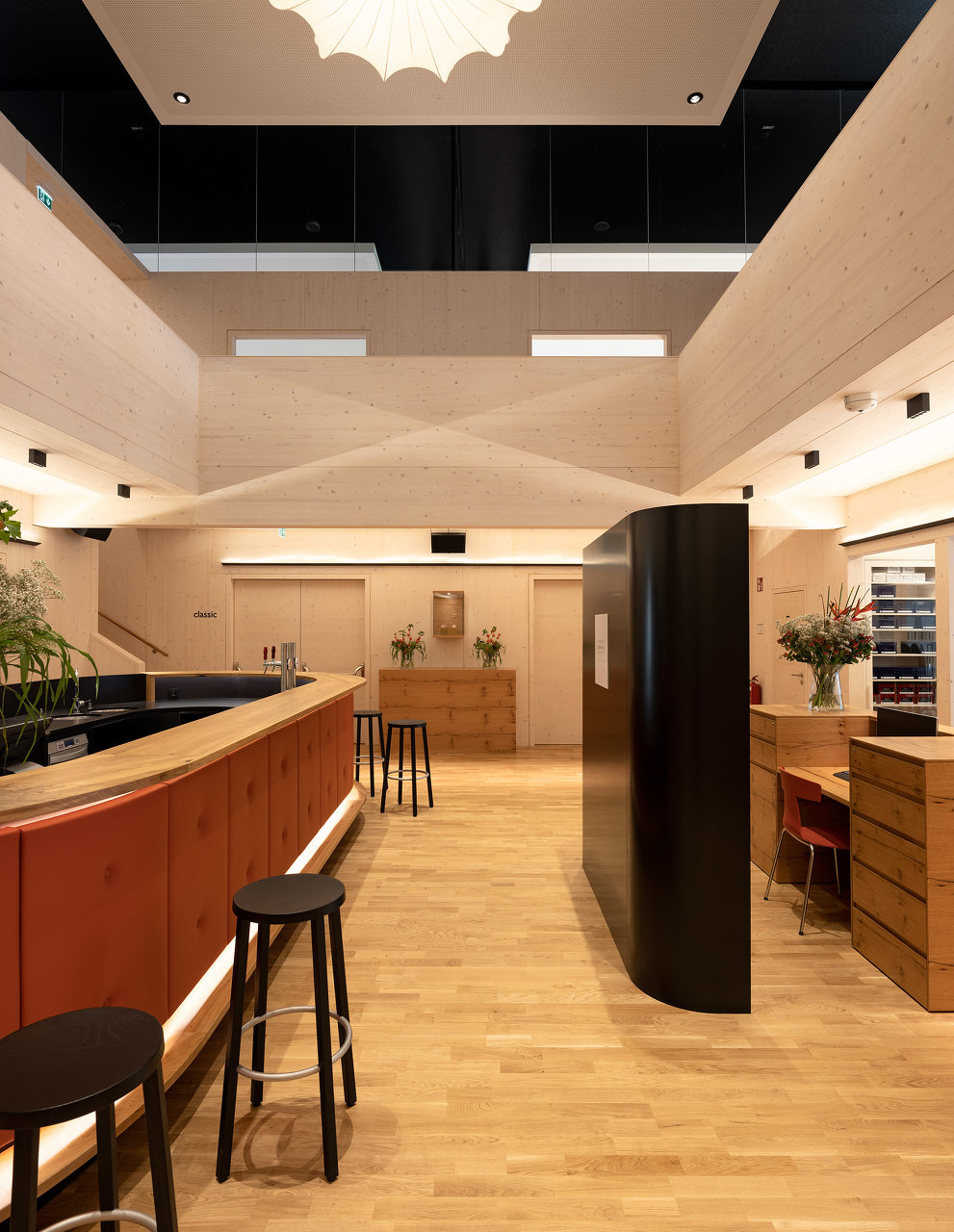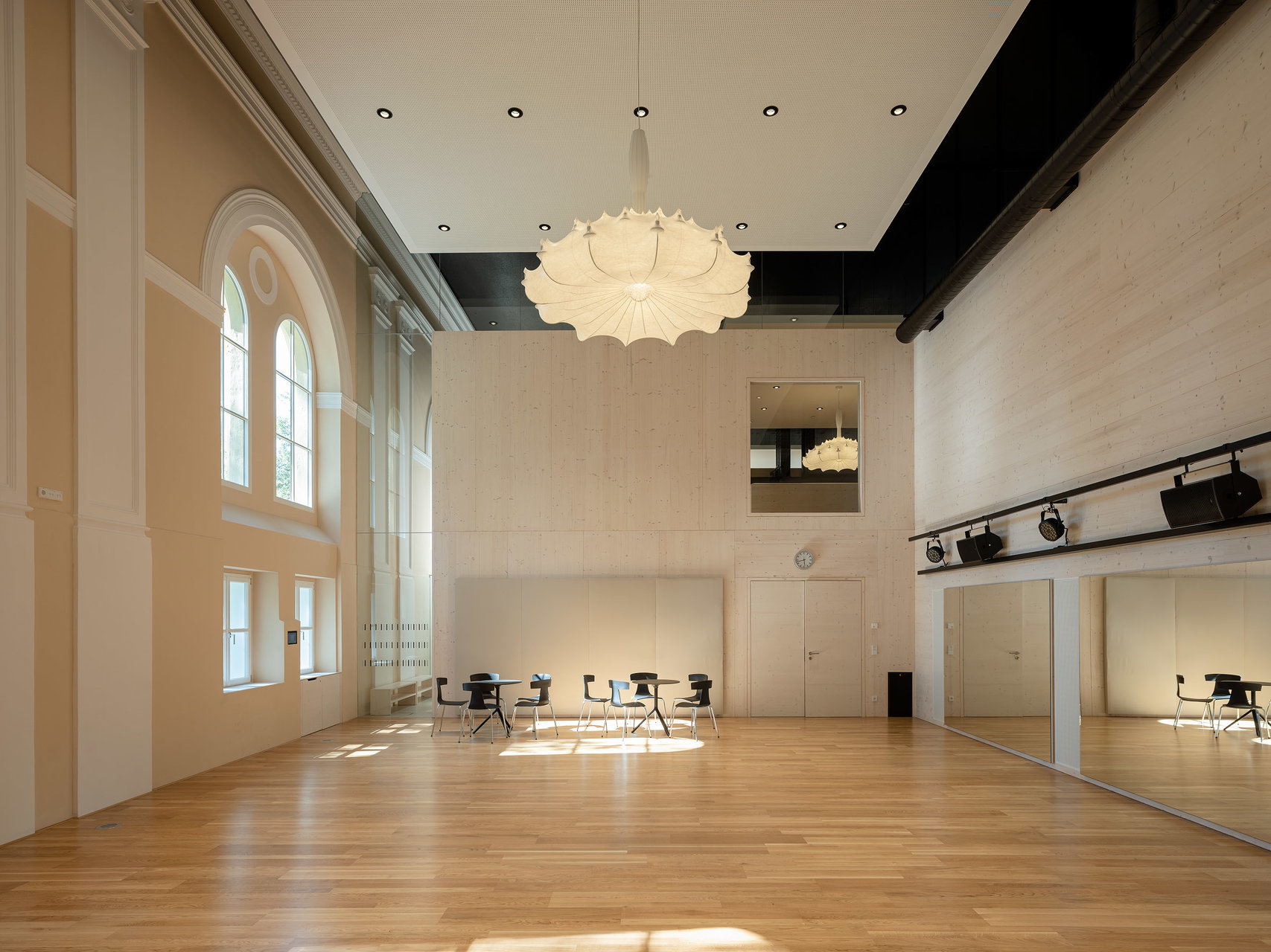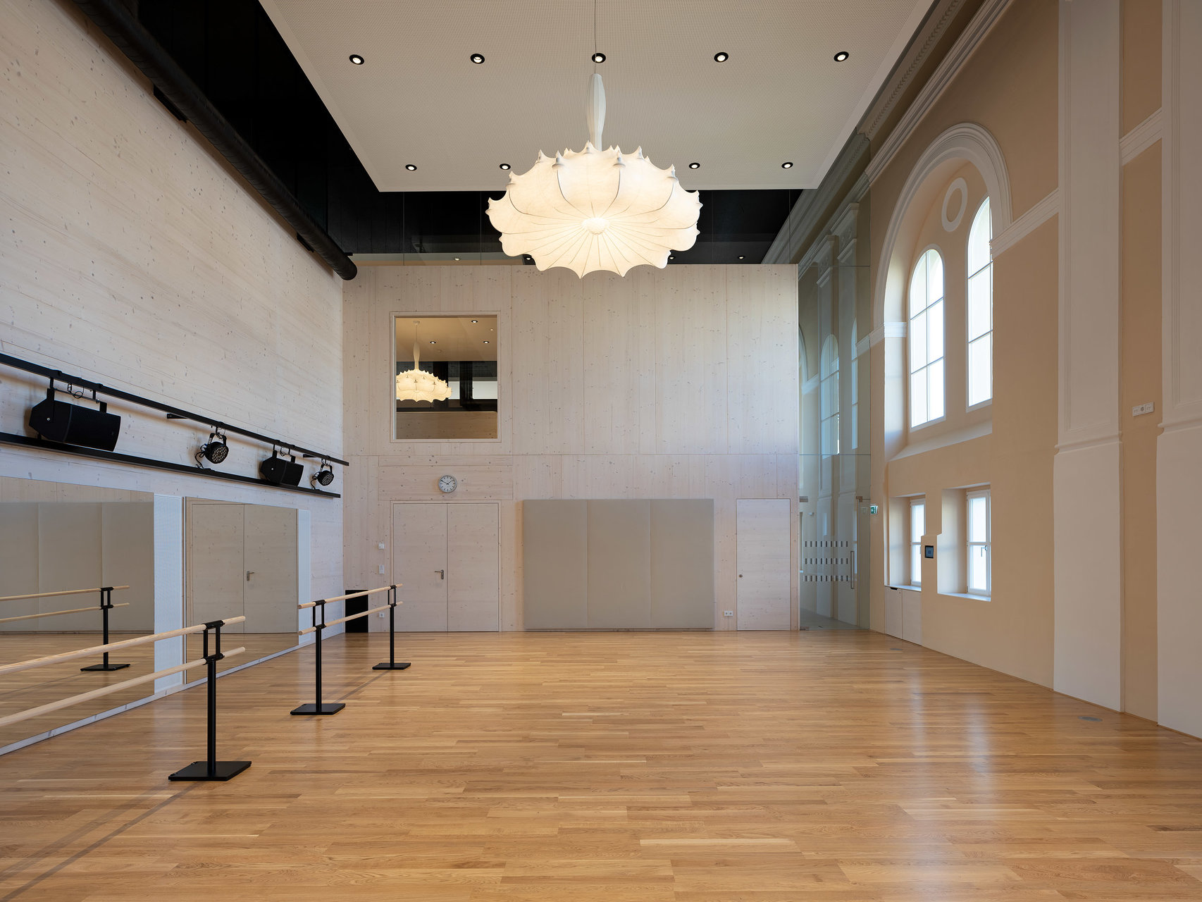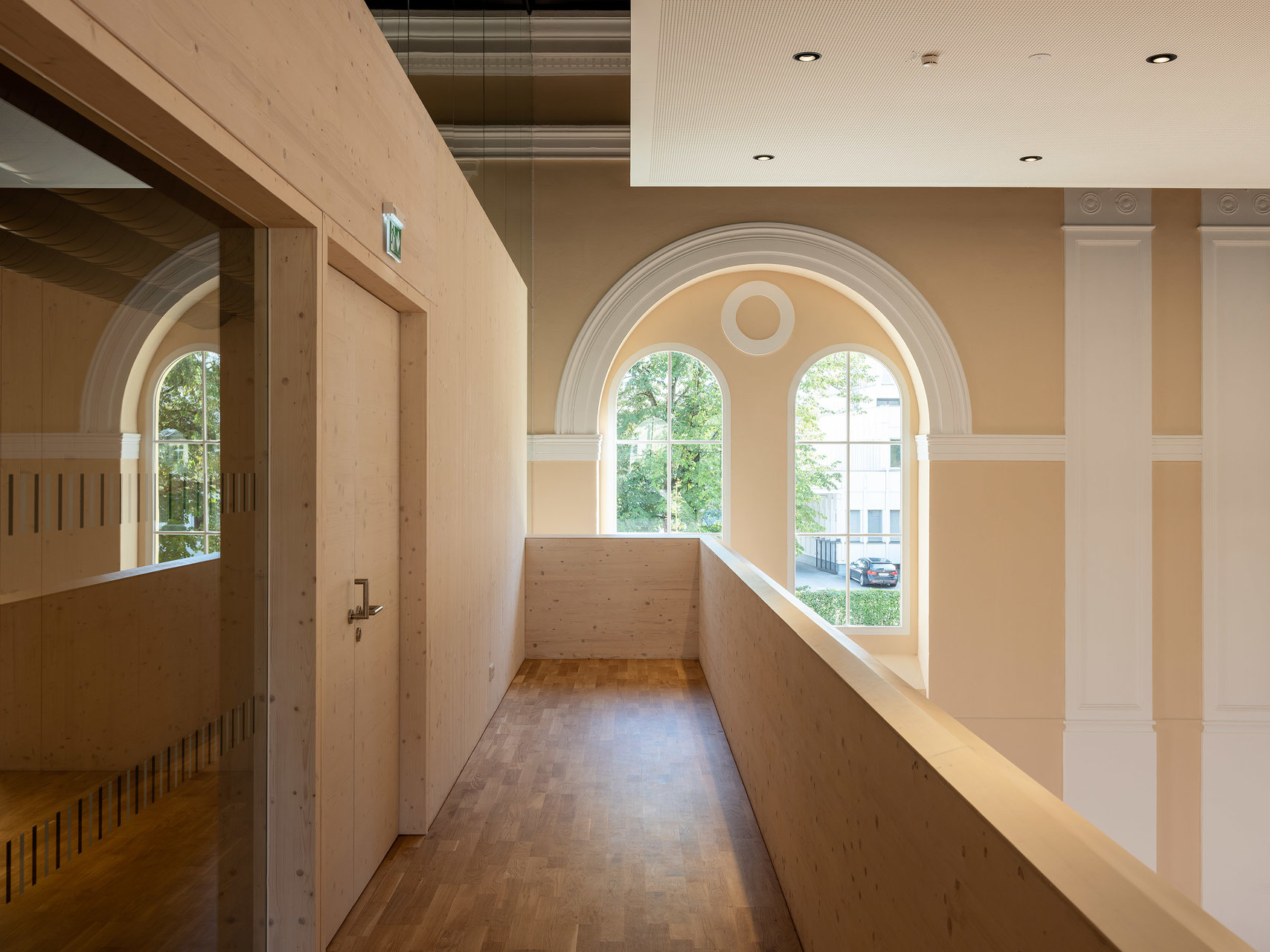 Die historischen Innenwände bleiben weitgehend erhalten, bzw. werden durch neue Fenster in den Sockelzonen ergänzt. Die notwendigen Einbauten, mit Glasfugen zu den Wänden getrennt, werden als weiß lasierte Brettsperrholzkonstruktion wie „Implantate“ beziehungsweise „Raum im Raum“ Konzeption eingefügt. Die ursprüngliche fragile Stahlfachwerkkonstruktion bleibt als Kaltraum hinter einer schwarzen gedämmten Zwischendecke erhalten. Weiße Akustikelemente sind als Schicht unter die dunklen Decken gelegt.