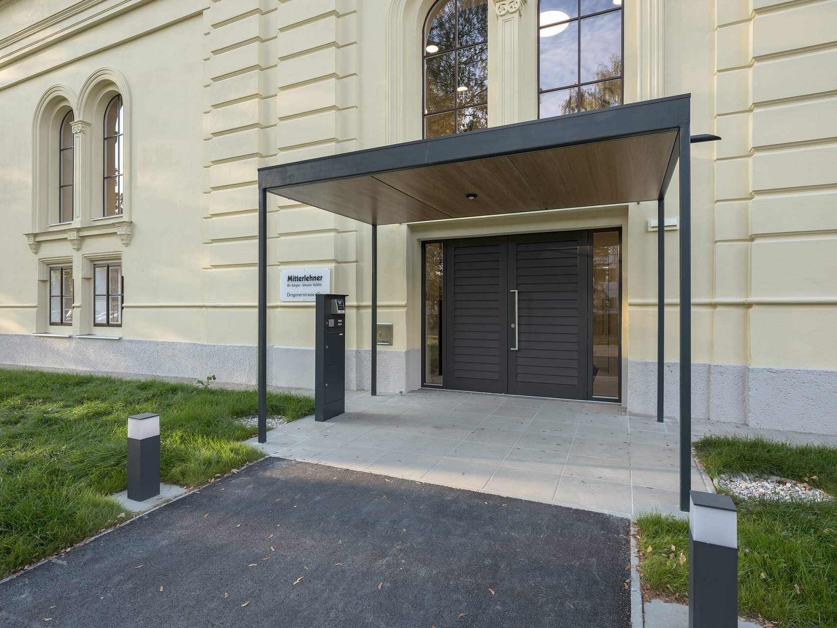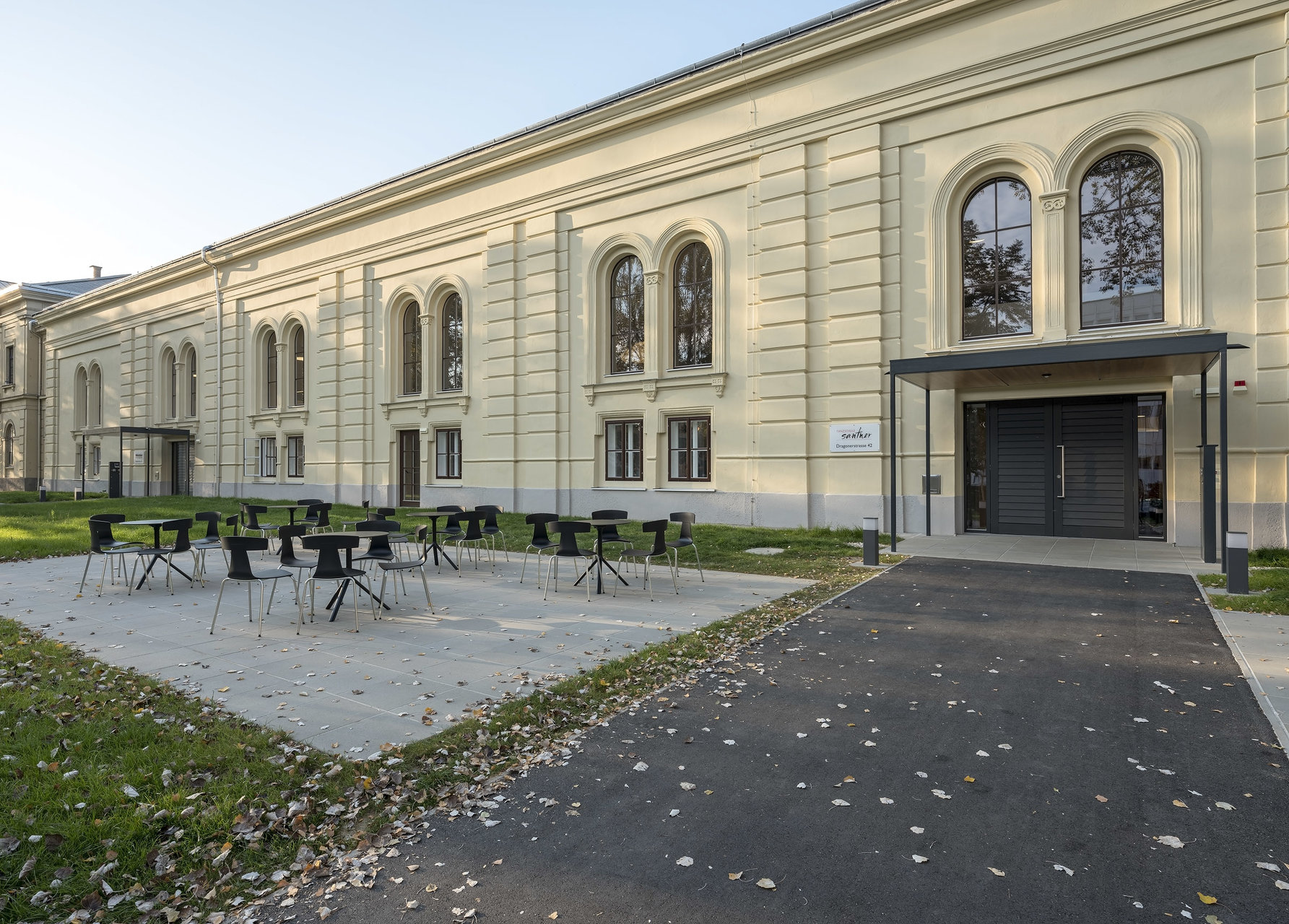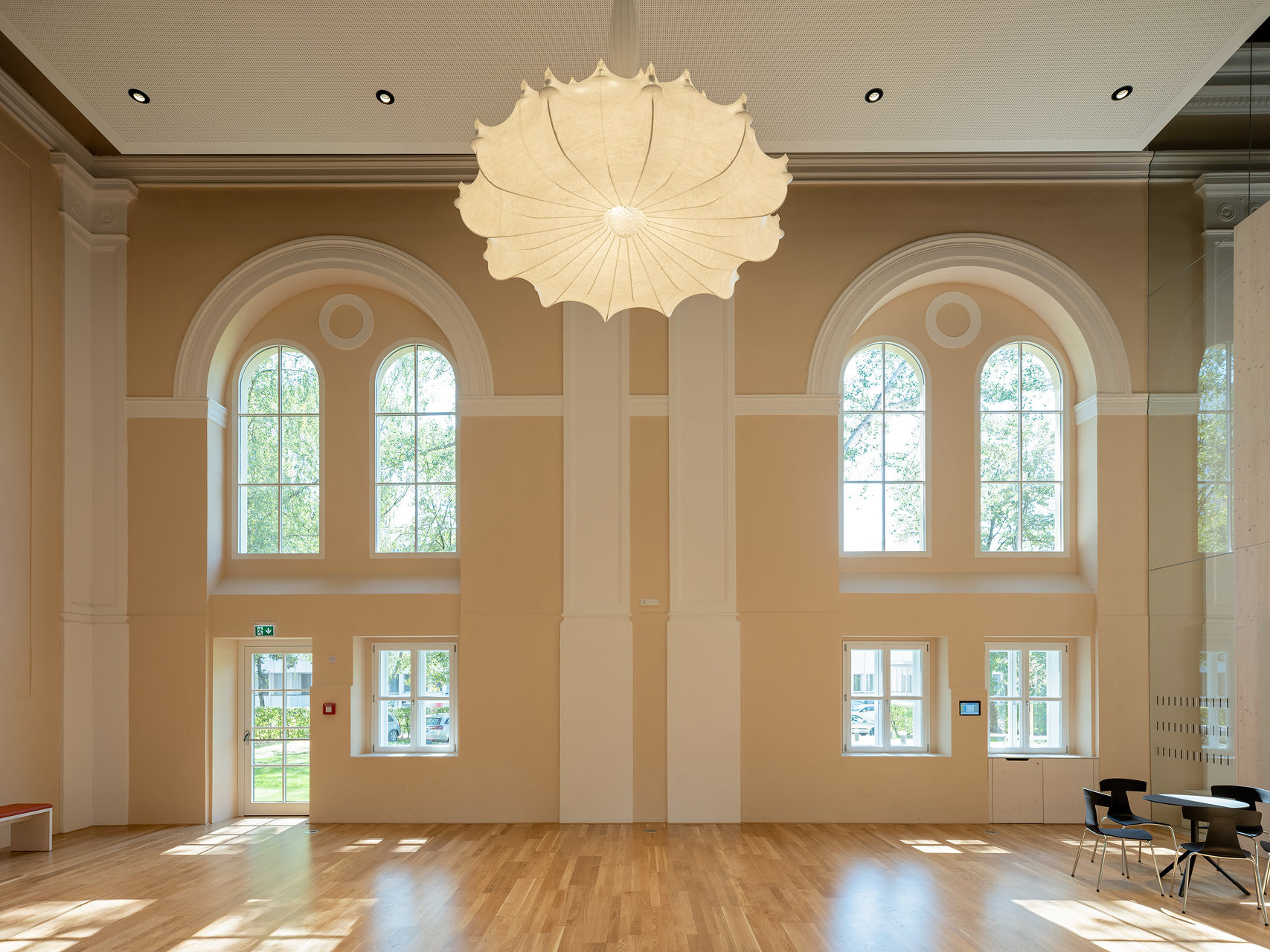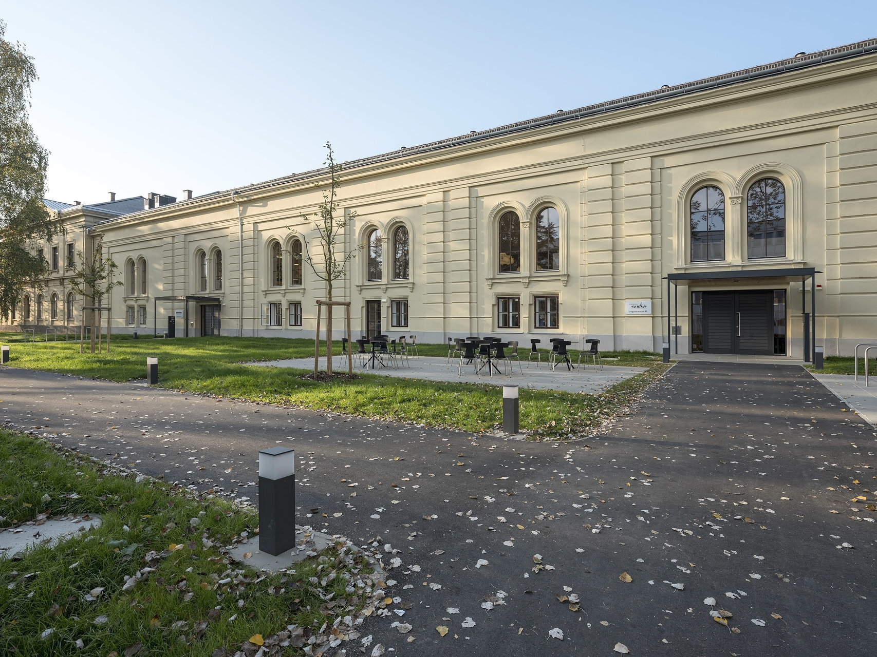 Die historischen Innenwände bleiben weitgehend erhalten, bzw. werden durch neue Fenster in den Sockelzonen ergänzt. Die notwendigen Einbauten, mit Glasfugen zu den Wänden getrennt, werden als weiß lasierte Brettsperrholzkonstruktion wie „Implantate“ beziehungsweise „Raum im Raum“ Konzeption eingefügt. Die ursprüngliche fragile Stahlfachwerkkonstruktion bleibt als Kaltraum hinter einer schwarzen gedämmten Zwischendecke erhalten. Weiße Akustikelemente sind als Schicht unter die dunklen Decken gelegt.