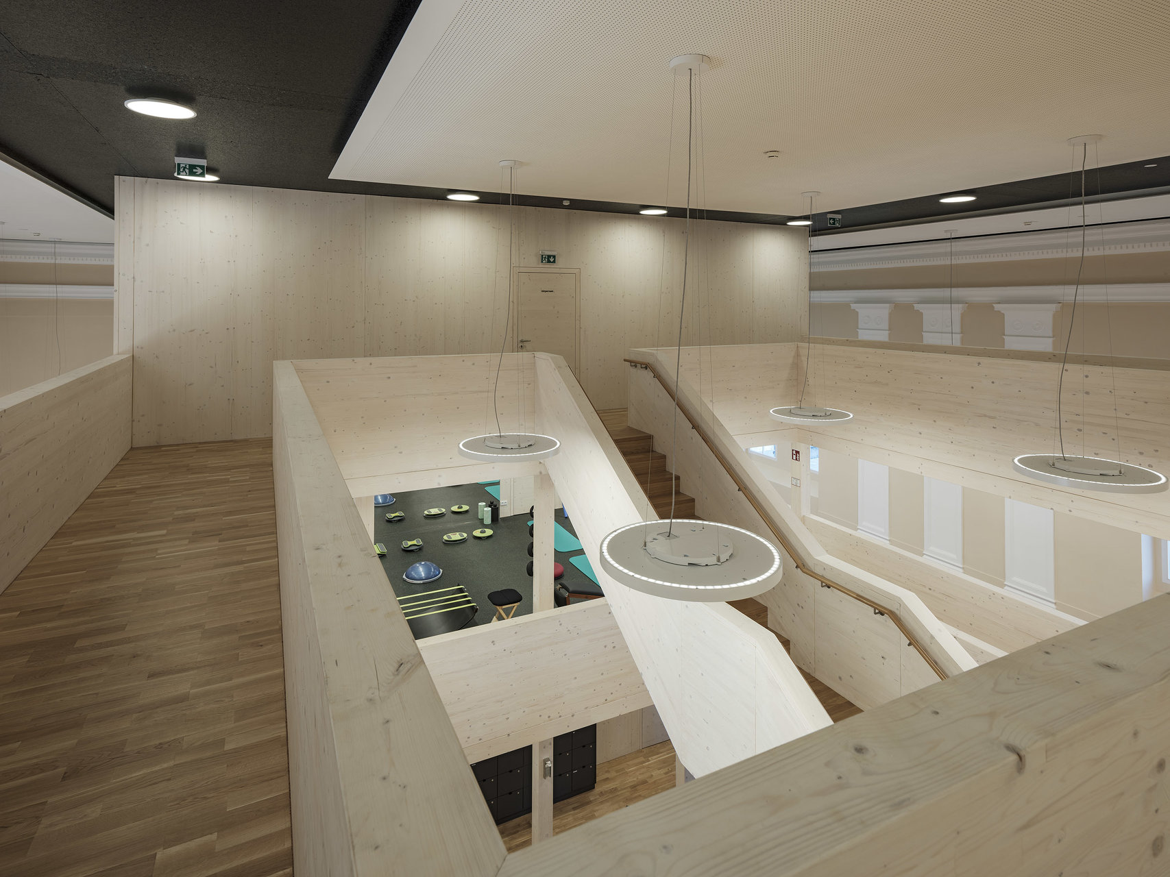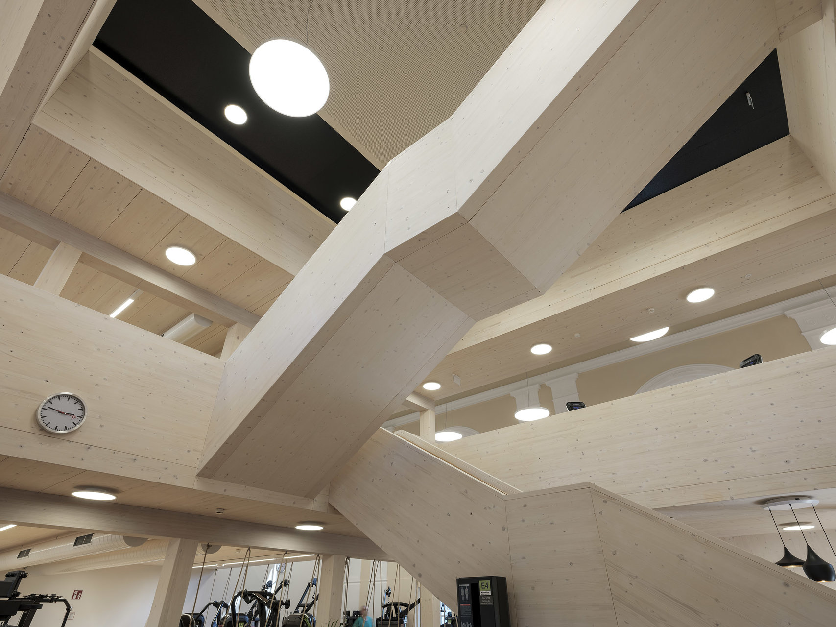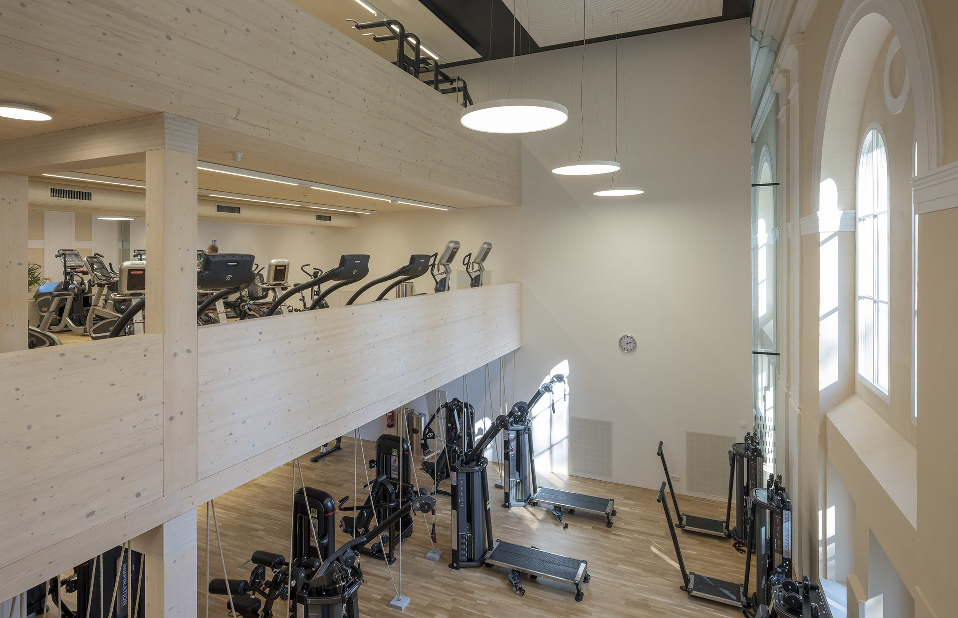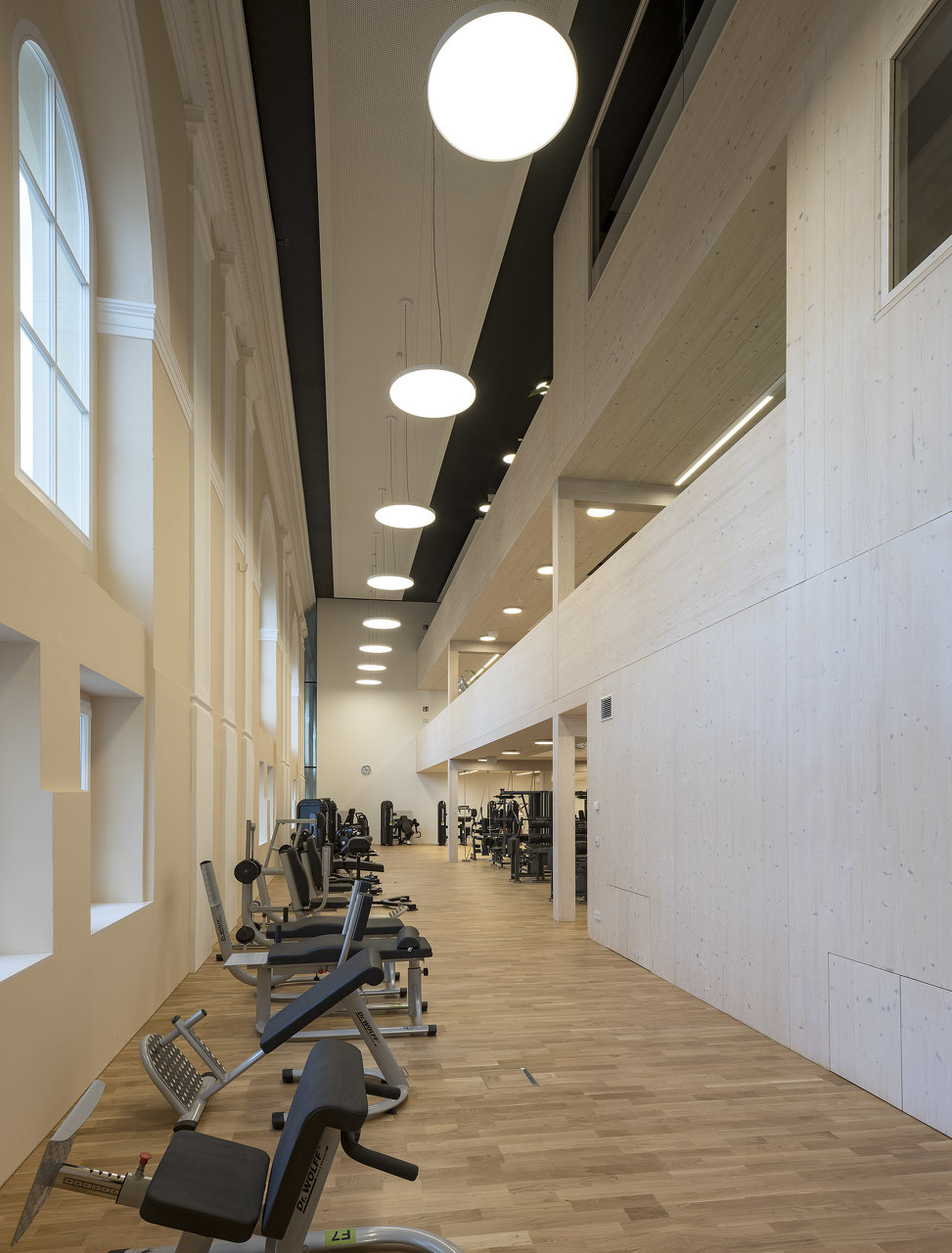 Der in die Halle als Solitär eingestellte Holzbau für ein Fitnessstudio schafft durch seine Ausformung in drei Etagen unterschiedlichste Raumwirkungen. Durch das konsequente Abrücken zum historisch Bestand bleibt das neue Element spürbar. Die kraftvolle Sprache im Einklang mit der historischen Innenfassade bildet den Kontrast zu den schweren Geräten für die Ertüchtigung des Körpers. (Text: Architekten, bearbeitet)