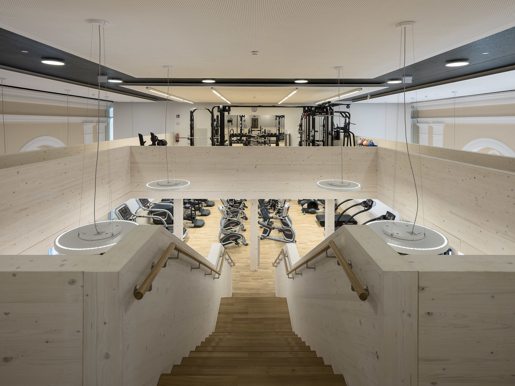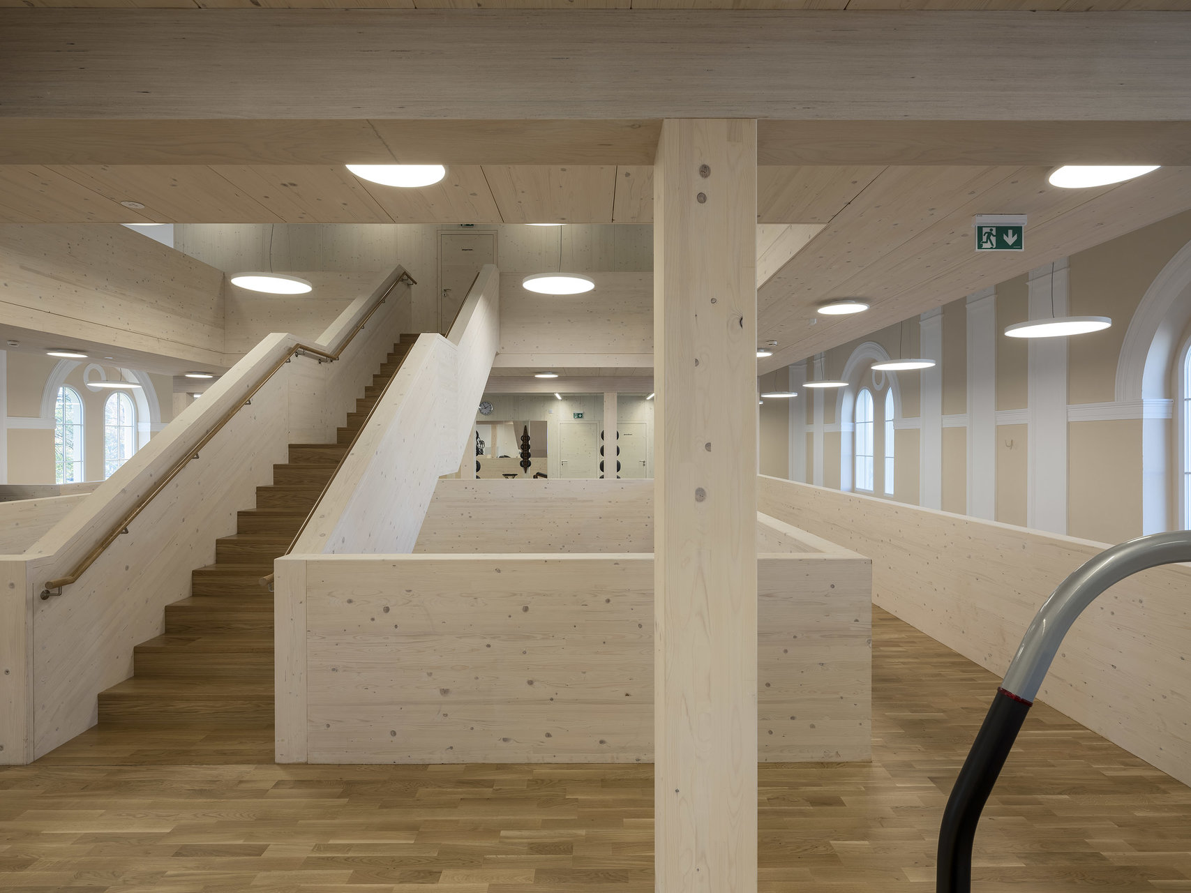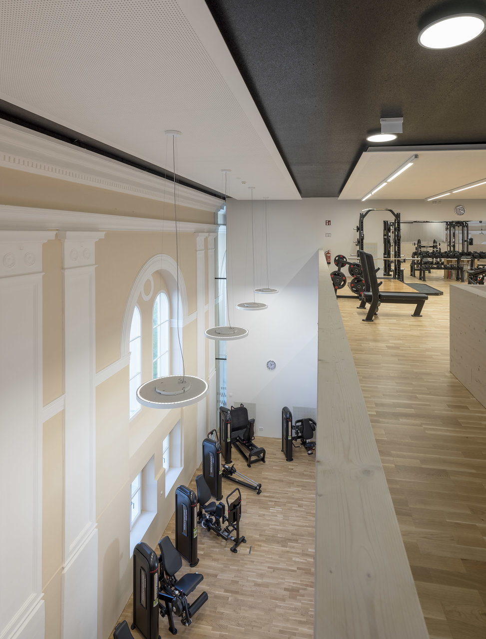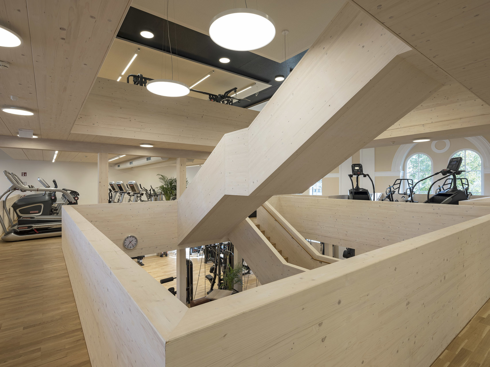 Der in die Halle als Solitär eingestellte Holzbau für ein Fitnessstudio schafft durch seine Ausformung in drei Etagen unterschiedlichste Raumwirkungen. Durch das konsequente Abrücken zum historisch Bestand bleibt das neue Element spürbar. Die kraftvolle Sprache im Einklang mit der historischen Innenfassade bildet den Kontrast zu den schweren Geräten für die Ertüchtigung des Körpers. (Text: Architekten, bearbeitet)