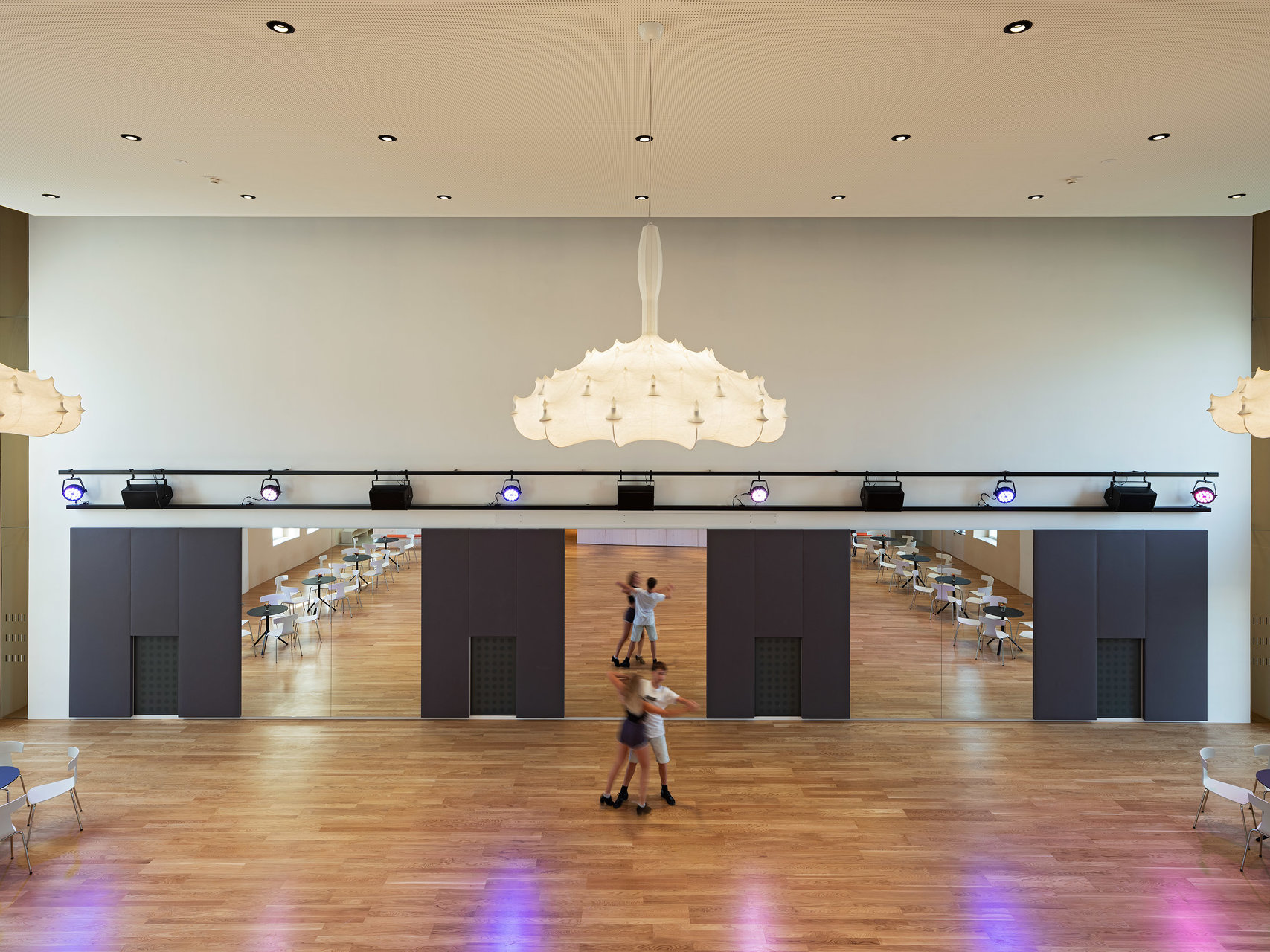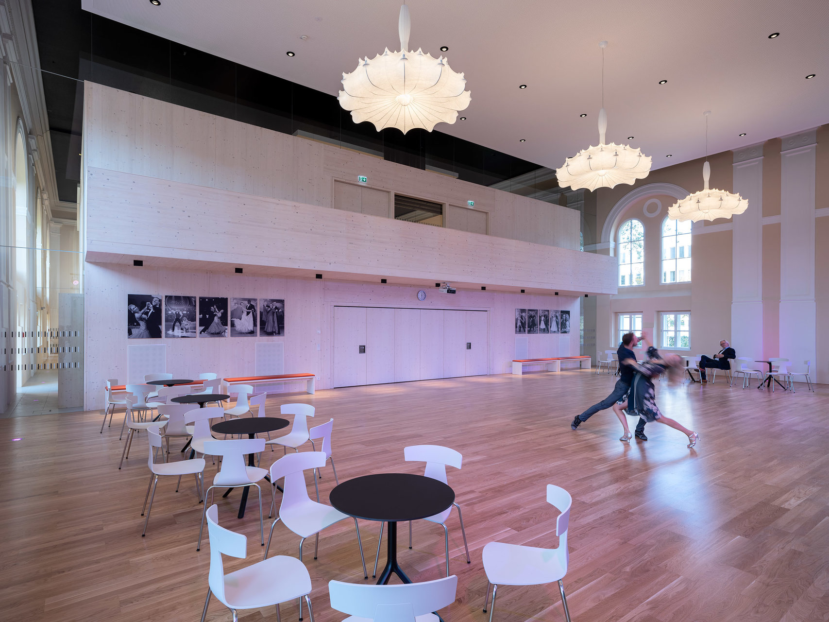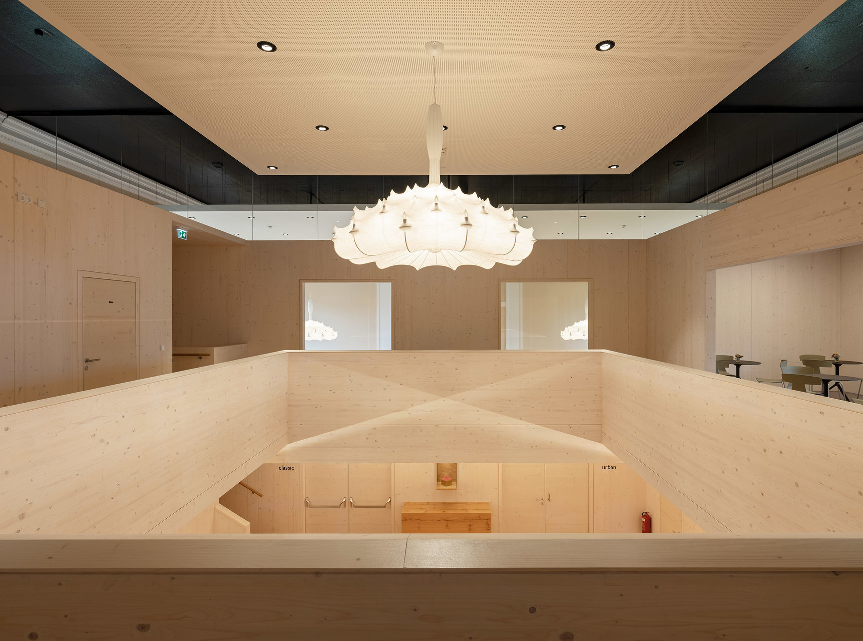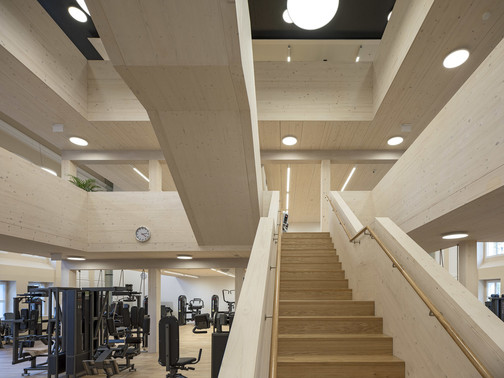 Der in die Halle als Solitär eingestellte Holzbau für ein Fitnessstudio schafft durch seine Ausformung in drei Etagen unterschiedlichste Raumwirkungen. Durch das konsequente Abrücken zum historisch Bestand bleibt das neue Element spürbar. Die kraftvolle Sprache im Einklang mit der historischen Innenfassade bildet den Kontrast zu den schweren Geräten für die Ertüchtigung des Körpers. (Text: Architekten, bearbeitet)