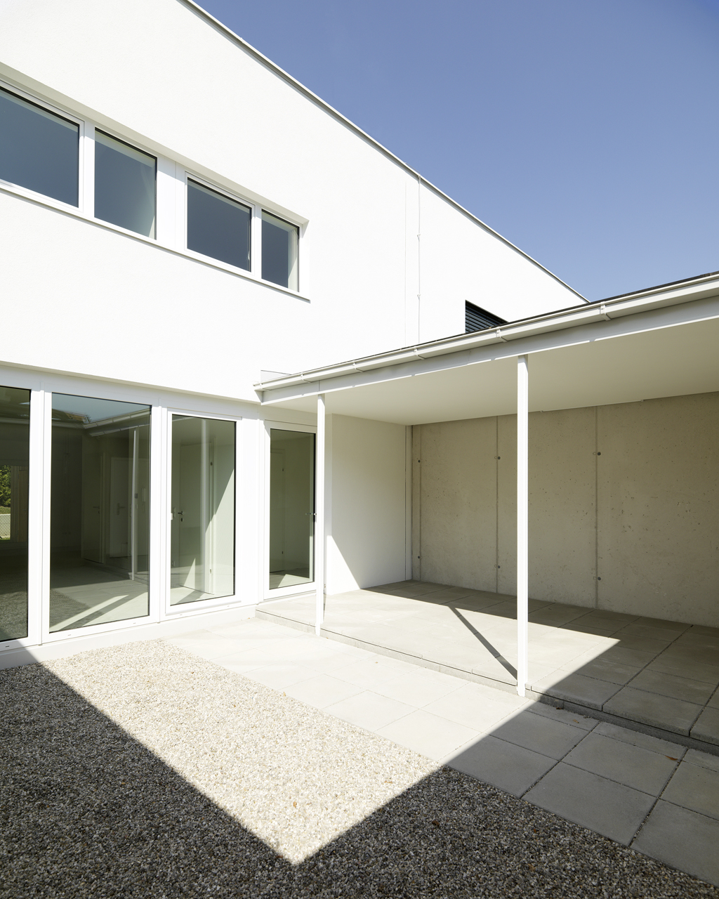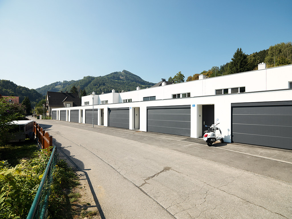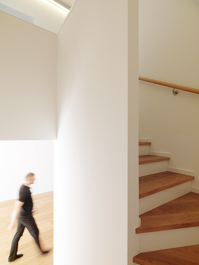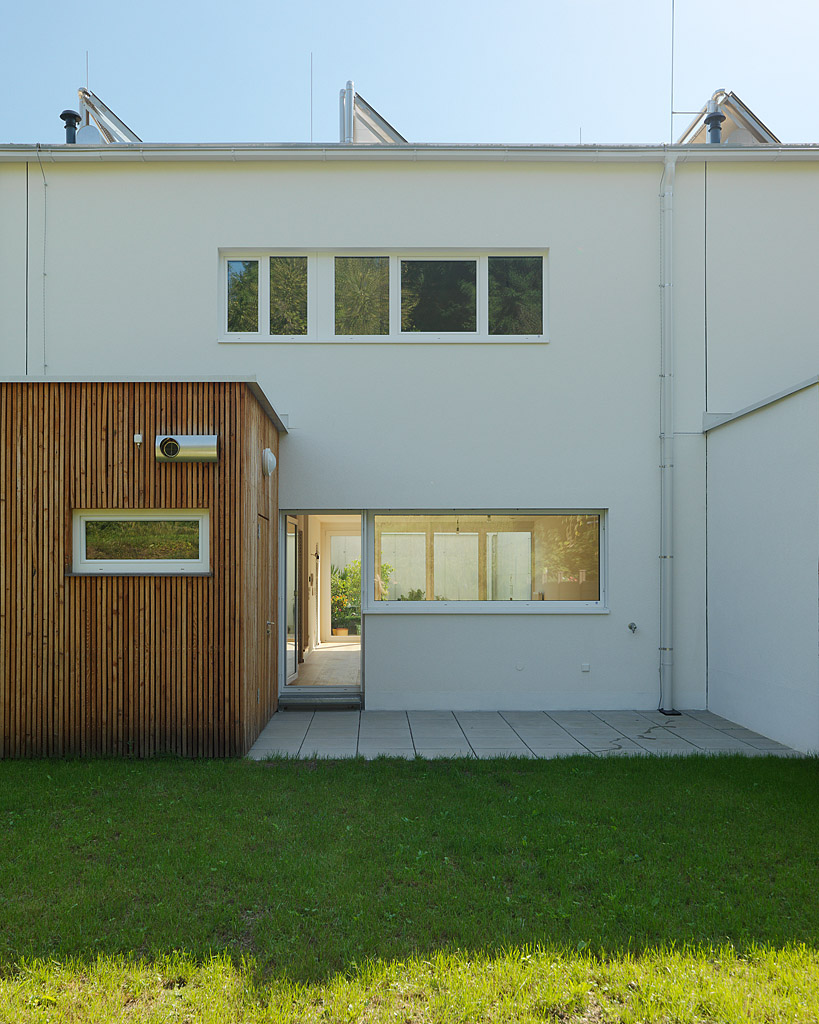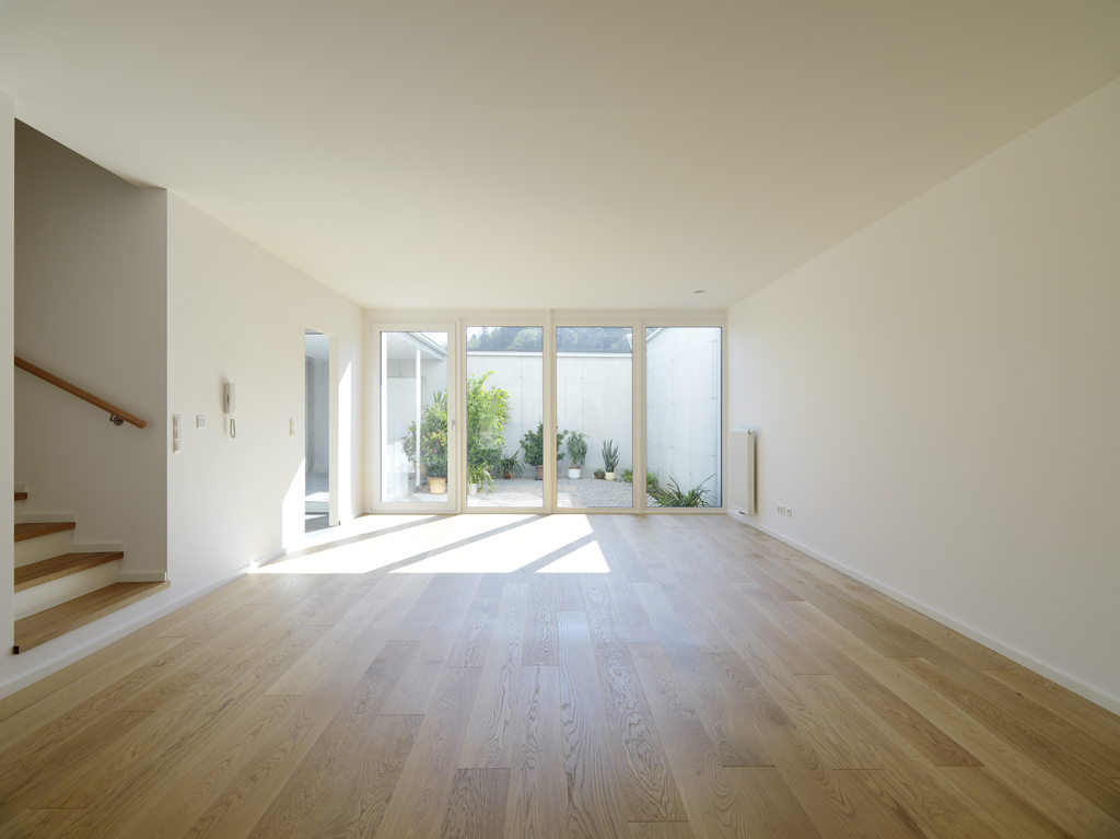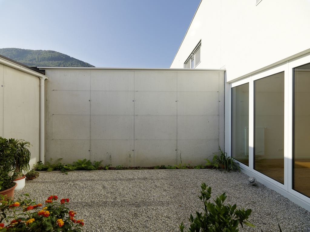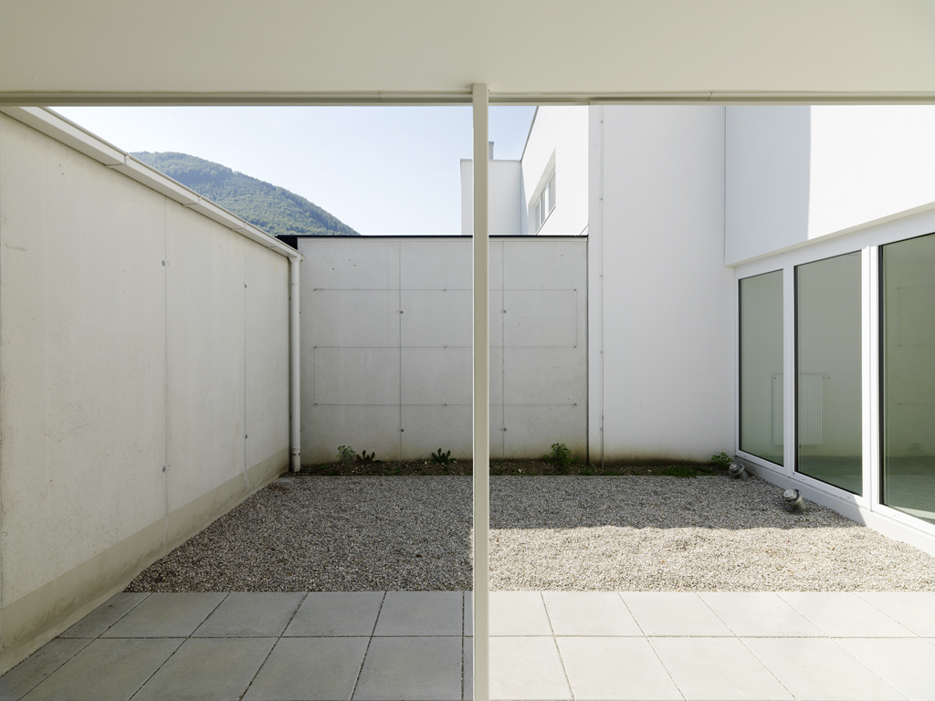 Die Häuser selbst sind jeweils in eine Schicht aus Nebenräumen - die die Breite der Zugangszone aufnimmt - und eine jener für den Aufenthalt unterteilt. Die Nebenraumschicht nimmt Garderobe, Treppe, Küche und Sanitärbereiche in sich auf. Daneben entwickelt sich im Erdgeschoß ein offen bespielbares Wohnzimmer, das sich sowohl in den Patio als auch zum westlich anliegenden Garten öffnet. Im Obergeschoss sind hier die Schlafräume eingefügt. Blickbeziehungen in den Innenhof und zur umgebenden Berglandschaft werden intensiv erlebbar. (Text: Architekt)