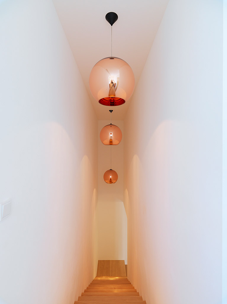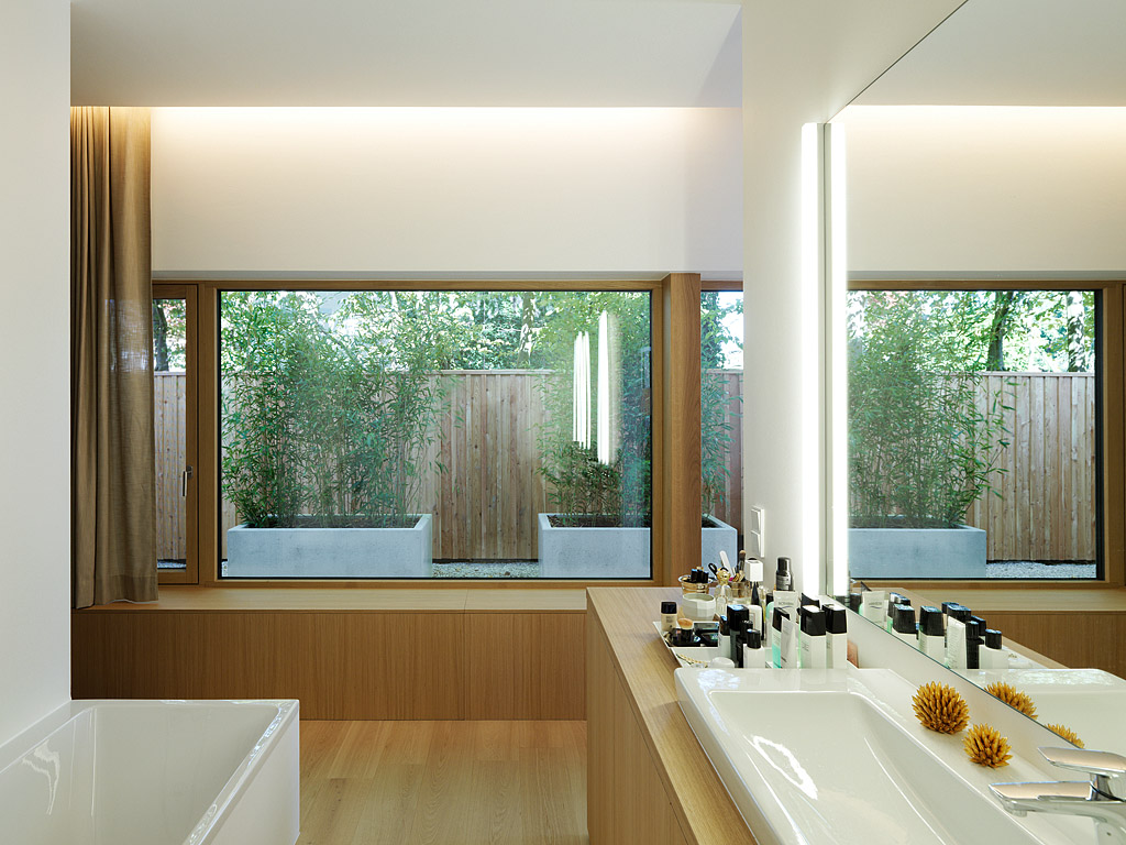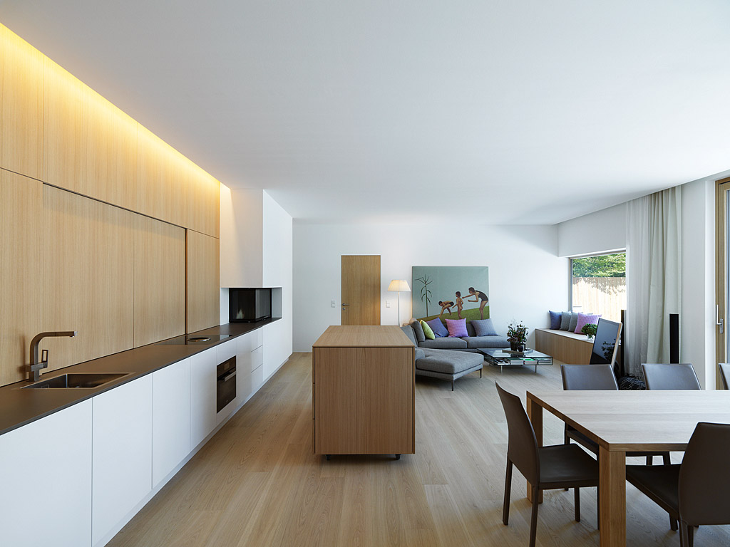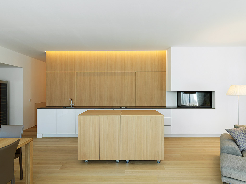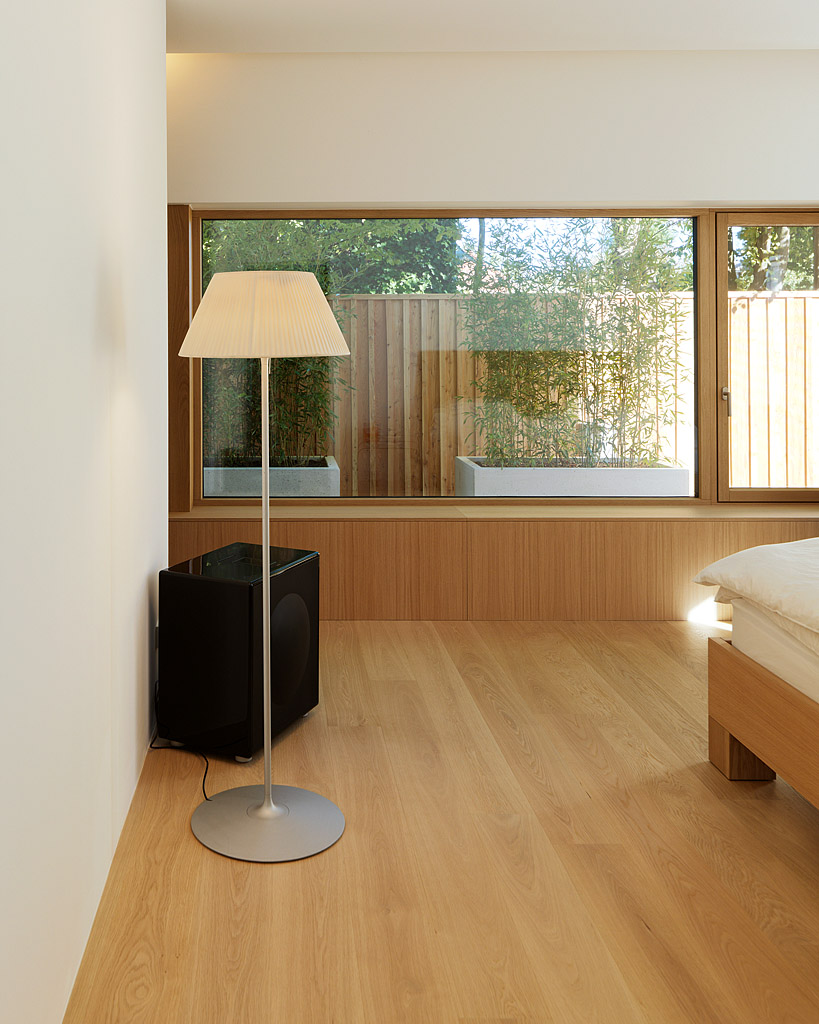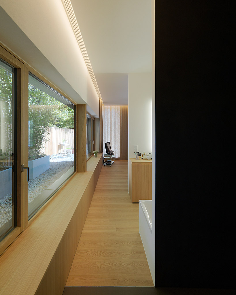 Putzoberflächen an Wänden und Decken sowie Eichenholz für Böden und Schränke unterstreichen die offensichtliche Herleitung. Die Freude an deren Erscheinung und die gespürte Wertigkeit ist auf ein fein detailliertes Handwerk zurückzuführen, das durch Reduktion betont wird. (Text: Architekt, bearbeitet)