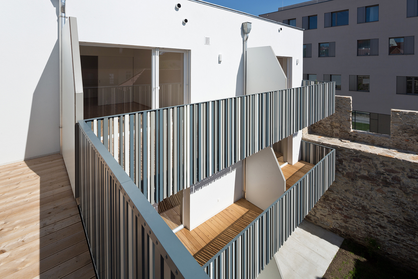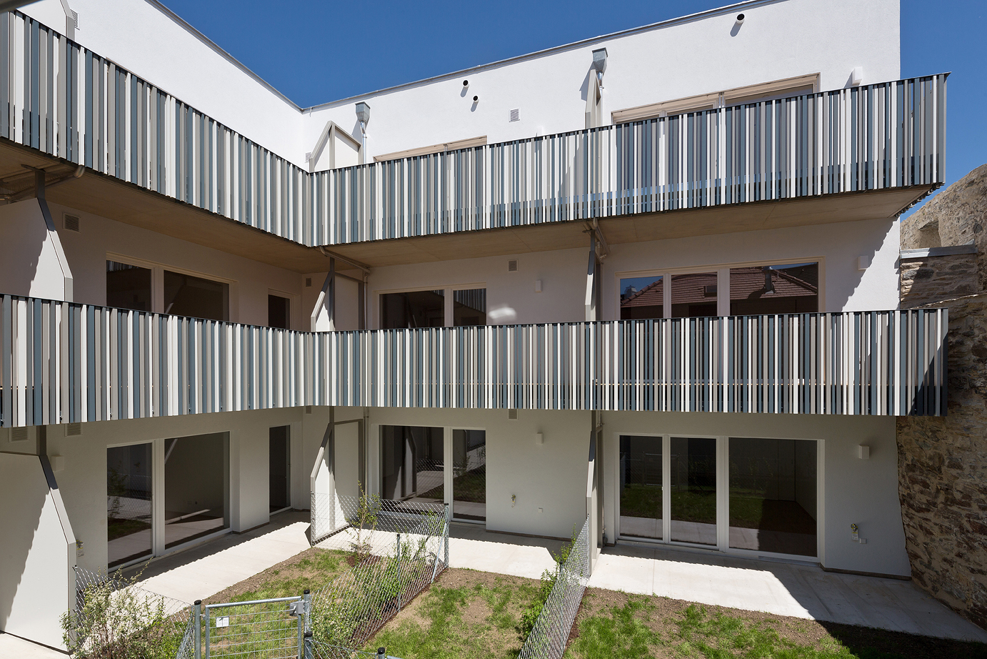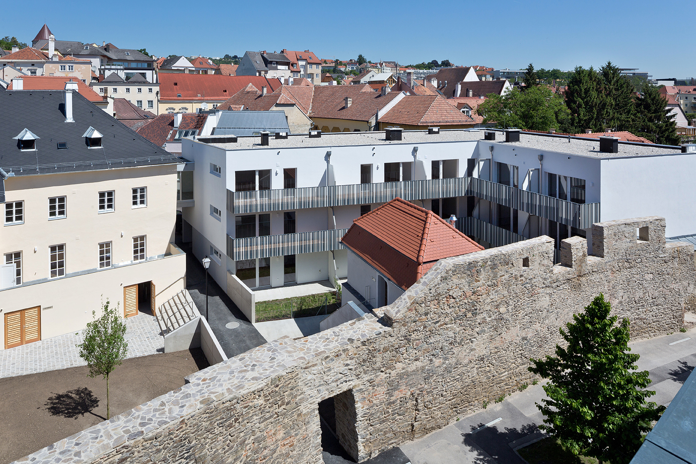 Die unregelmäßige Lochfassade des Neubaus zur Straße hin schützt die Laubengänge, die zu den Wohnungen führen. Richtung Süden und Westen öffnet sich das Wohngebäude mit attraktiven Balkonen oder Terrassen und Eigengarten zum Hof. Die Verbindung im zweiten Obergeschoß sichert die barrierefreie Nutzung der Gesamtanlage. Ein Fußweg leitet durch den Innenhof zu den öffentlichen Grünzonen südlich der Stadtmauer. (Text: Architekt:innen, bearbeitet)