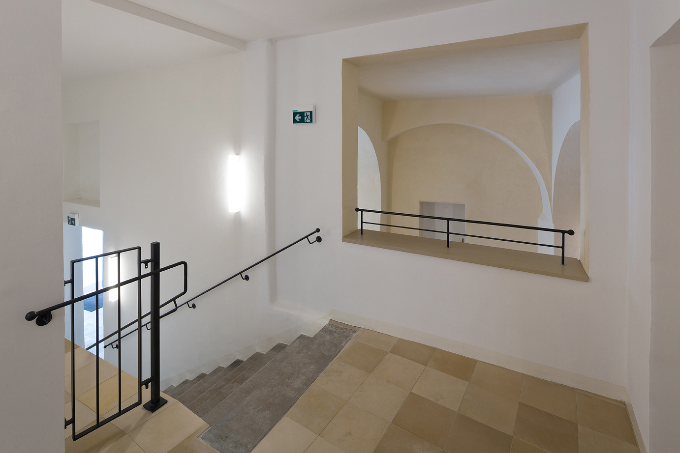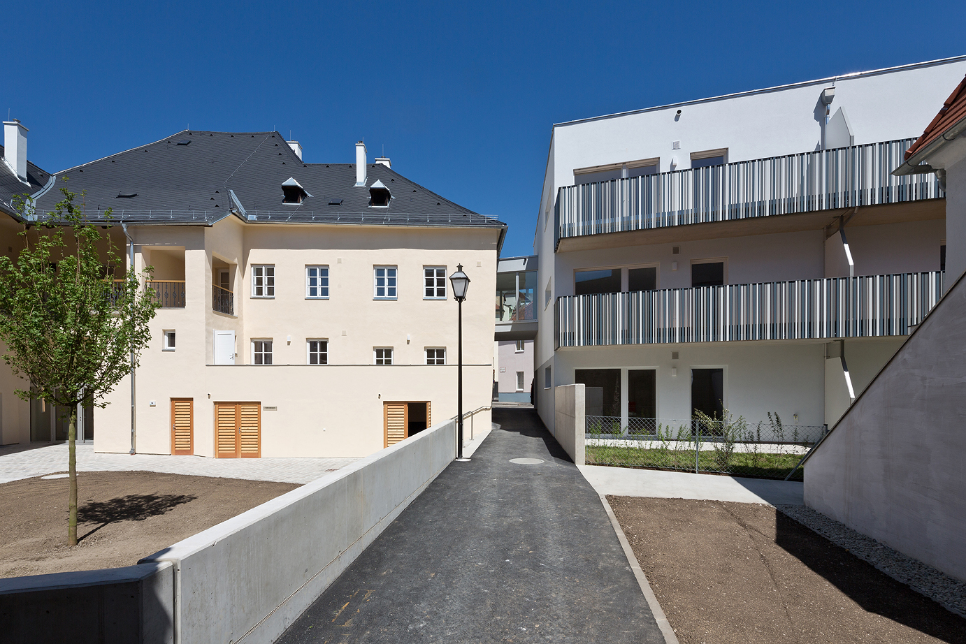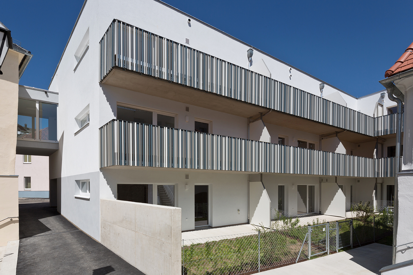Die unregelmäßige Lochfassade des Neubaus zur Straße hin schützt die Laubengänge, die zu den Wohnungen führen. Richtung Süden und Westen öffnet sich das Wohngebäude mit attraktiven Balkonen oder Terrassen und Eigengarten zum Hof. Die Verbindung im zweiten Obergeschoß sichert die barrierefreie Nutzung der Gesamtanlage. Ein Fußweg leitet durch den Innenhof zu den öffentlichen Grünzonen südlich der Stadtmauer. (Text: Architekt:innen, bearbeitet)