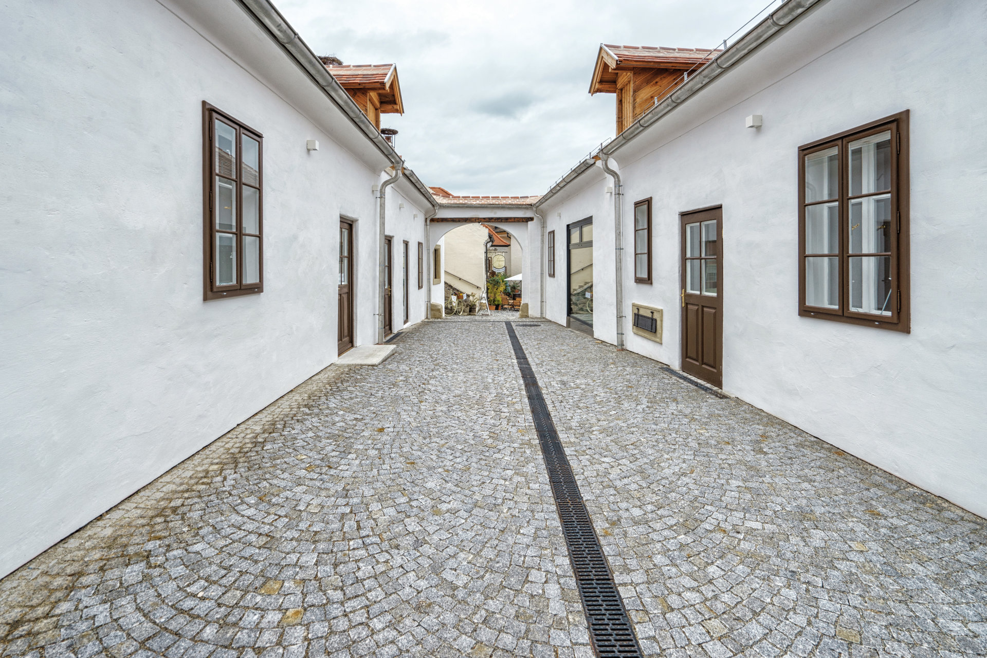 Bevor der Stadtkern mit dem Gebäudekomplex erweitert werden konnte, war ein umfassendes Sanierungskonzept notwendig: historisch wertvolle Elemente wurden erhalten und restauriert und schadhafte Bauteile wurden mit authentischen Materialen wiederhergestellt.