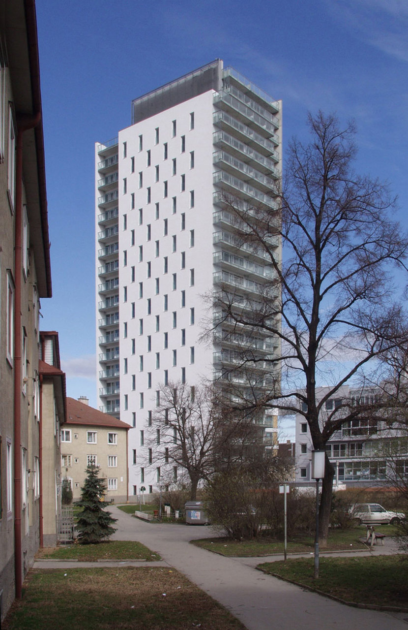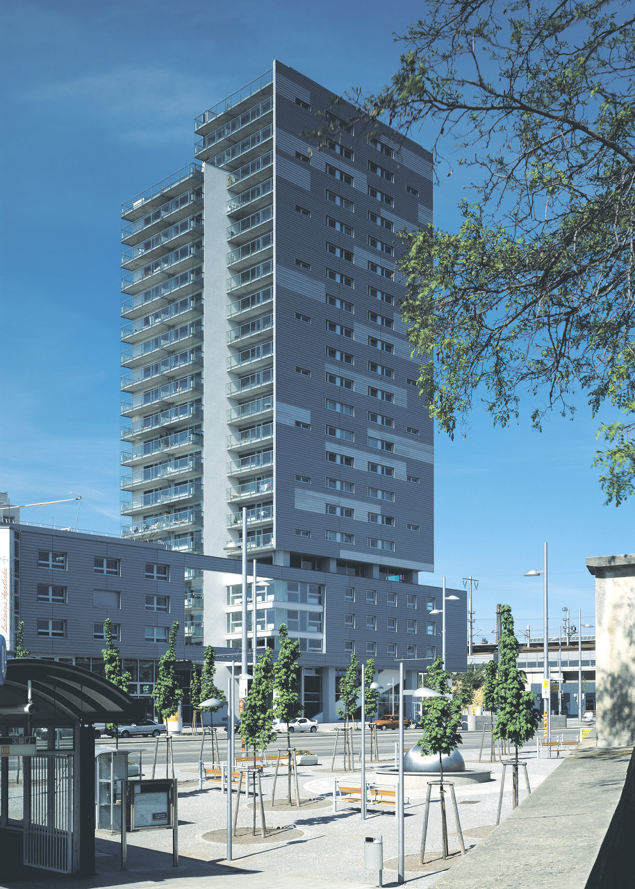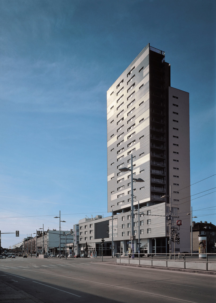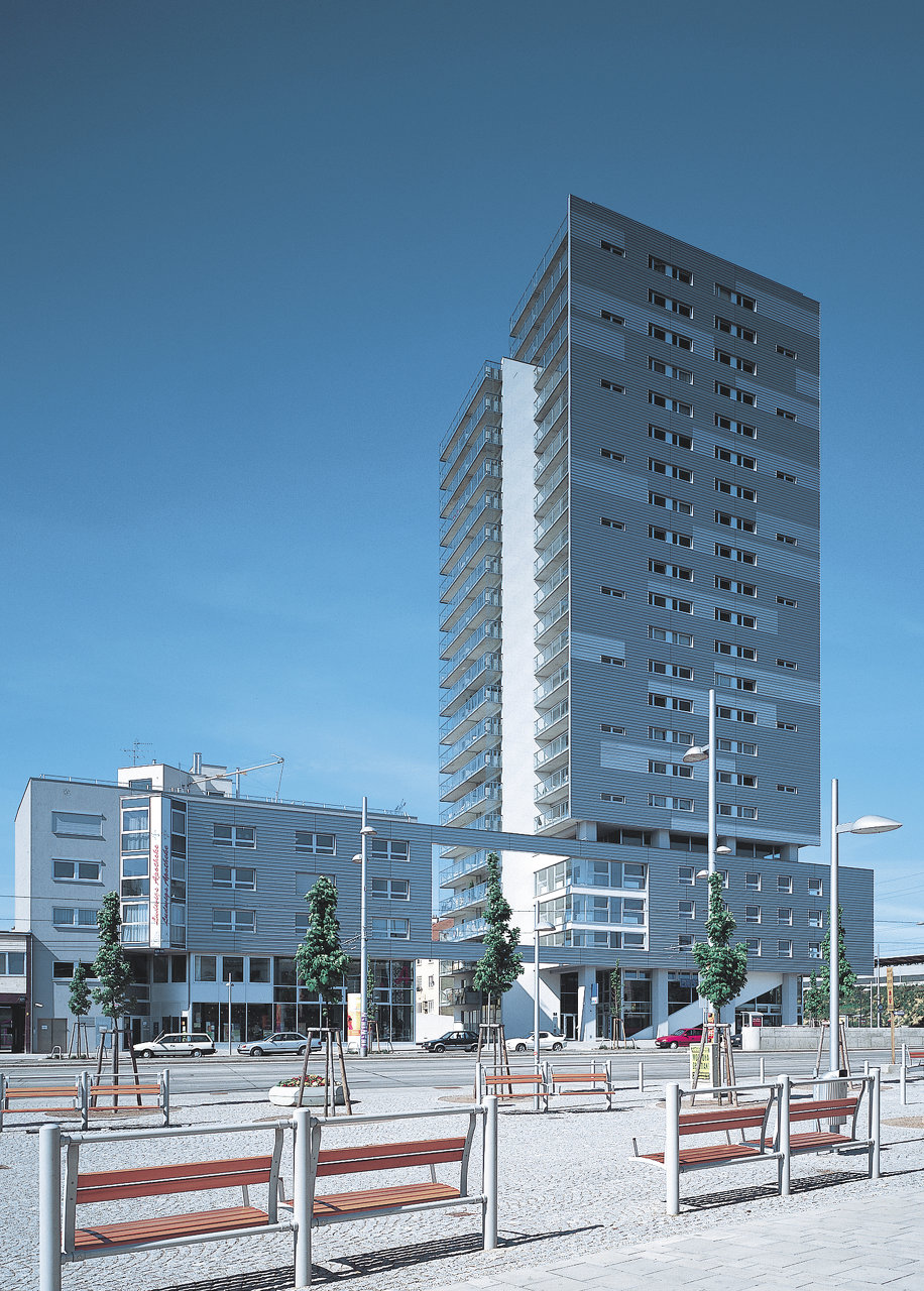 Das Hochhaus mit 24 Geschossen und einer Höhe von ca. 68 m enthält vorwiegend Wohnungen; in den unteren 5 Geschossen sind straßenseitig Büros vorgesehen, im Erdgeschoss Geschäftslokale. Das kleinere Gebäude nimmt lediglich Wohnungen auf und stellt mit einer Höhe von 26 m gewissermaßen ein Pendant zum Hochhaus dar. Durch diesen Bauteil entsteht eine Höhenstaffelung, die das Hochhaus in die vorwiegend 5-geschossige Bebauung der Umgebung einbindet.