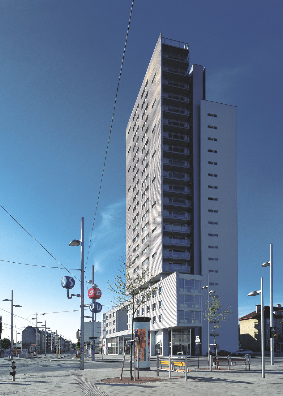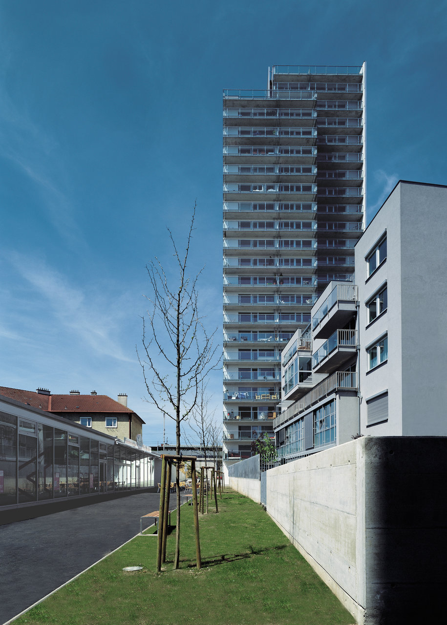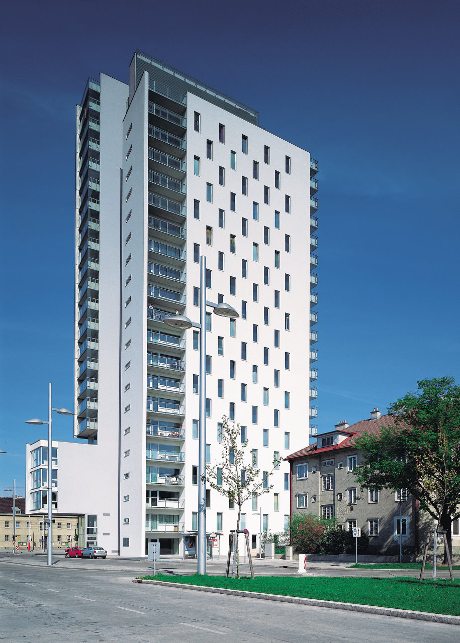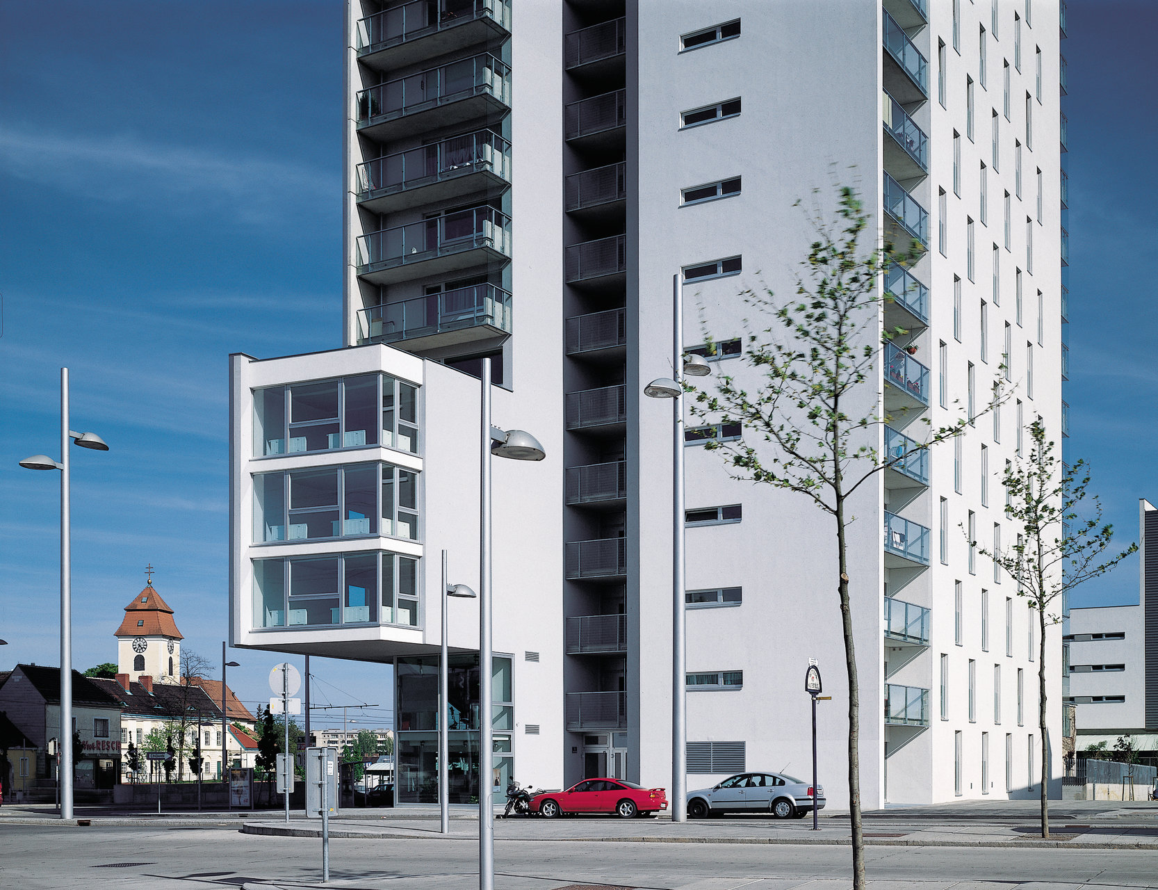 Die Lage des Hochhauses bezüglich der Simmeringer Hauptstraße ist durch die Sichtachse von der Kaiserebersdorfer Straße her bedingt; sie berücksichtigt aber auch die bestehenden 3-geschossigen Wohnhausanlagen (keine Beschattung; Erhalt des Wohnhofes) und weist mit dem auskragenden Bauteil auf den Hauptknotenpunkt des öffentlichen Personennahverkehrs Simmerings (Bahn, U-Bahn, Straßenbahn, Busse) hin. Die städtebauliche Einbindung des Hochhauses gelingt durch die Gliederung des Baukörpers, die sich aus der baulichen Umgebung ableiten läßt. In Höhe der typischen Bebauung in der Simmeringer Hauptstraße wird das Gebäude durch ein Zäsurgeschoss in einen Sockel- und einen Hochhausbereich geteilt.