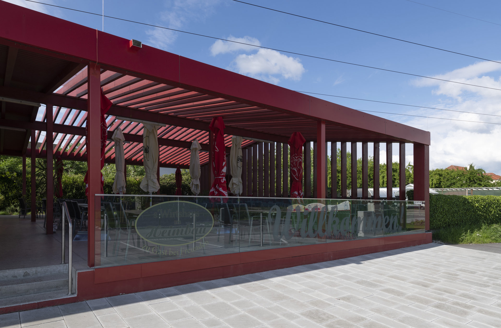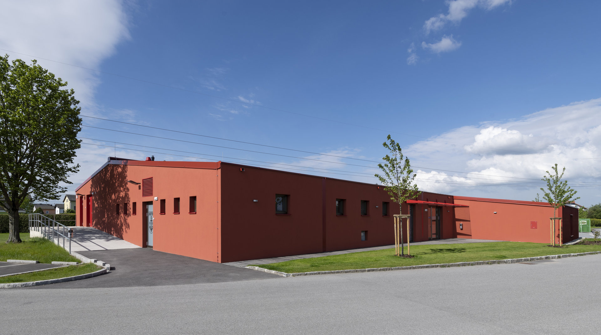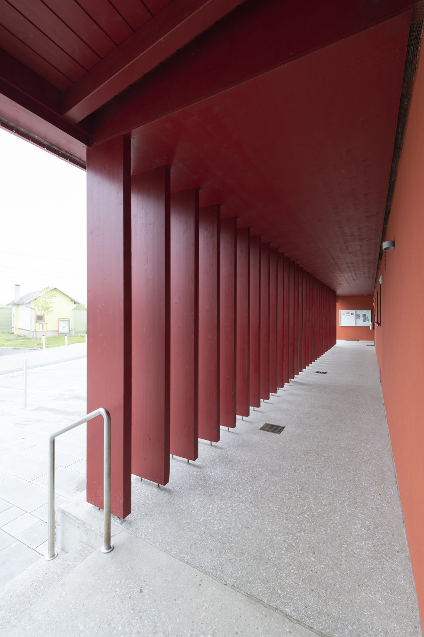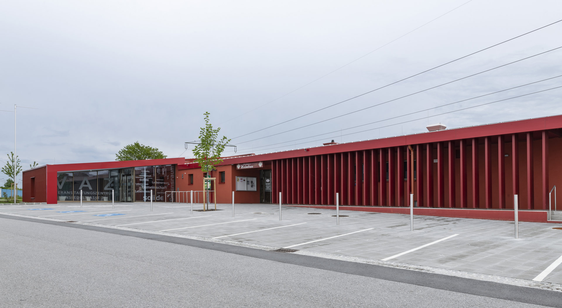 Die notwendige große Anzahl an Parkplätzen wird entlang der bestehenden Aufschließungsstraße in Form von durchgrünten Senkrechtparkplätzen erreicht. Zwischen den Parkplätzen und dem Baukörper spannt sich ein dreieckiger Vorplatz auf, der mit einer hochwertigen Oberfläche neu gestaltet wird. Es ergibt sich ein großzügiger Vorbereich. Die einzelnen Funktionen wie Gasthaus und Veranstaltungssaal sind dabei klar ablesbar. (Text: Architekten)