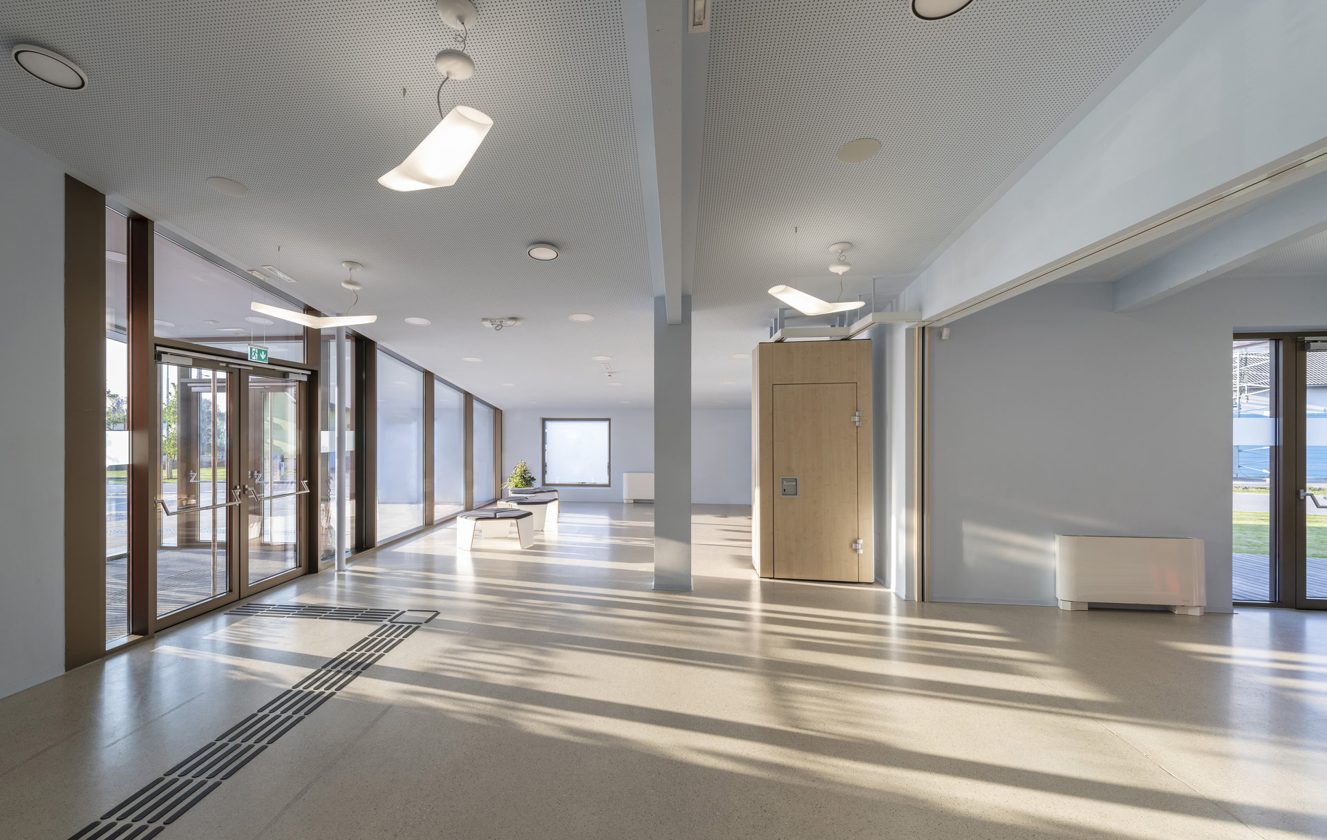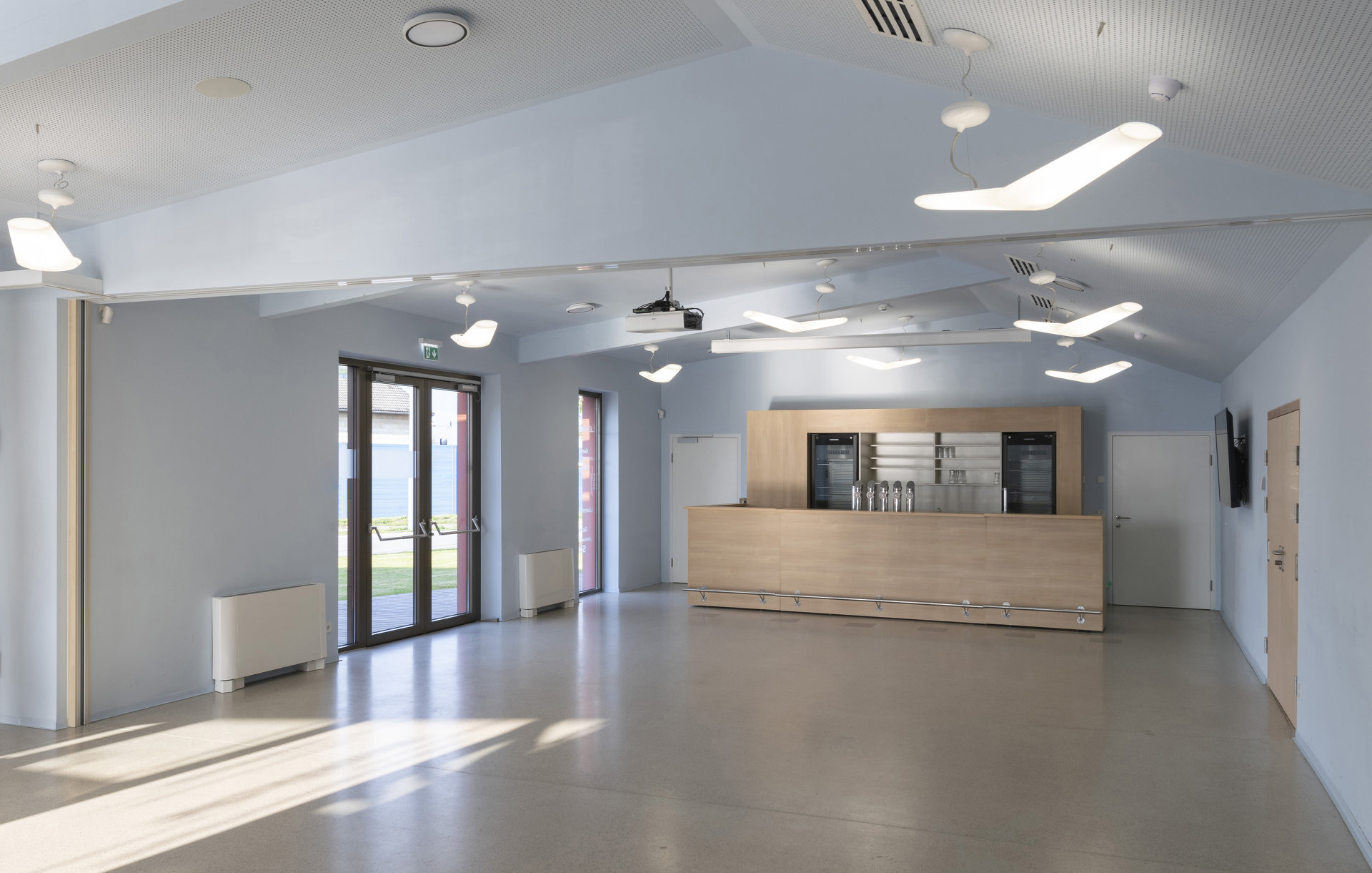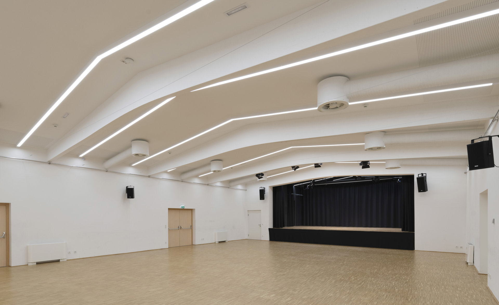 Die notwendige große Anzahl an Parkplätzen wird entlang der bestehenden Aufschließungsstraße in Form von durchgrünten Senkrechtparkplätzen erreicht. Zwischen den Parkplätzen und dem Baukörper spannt sich ein dreieckiger Vorplatz auf, der mit einer hochwertigen Oberfläche neu gestaltet wird. Es ergibt sich ein großzügiger Vorbereich. Die einzelnen Funktionen wie Gasthaus und Veranstaltungssaal sind dabei klar ablesbar. (Text: Architekten)