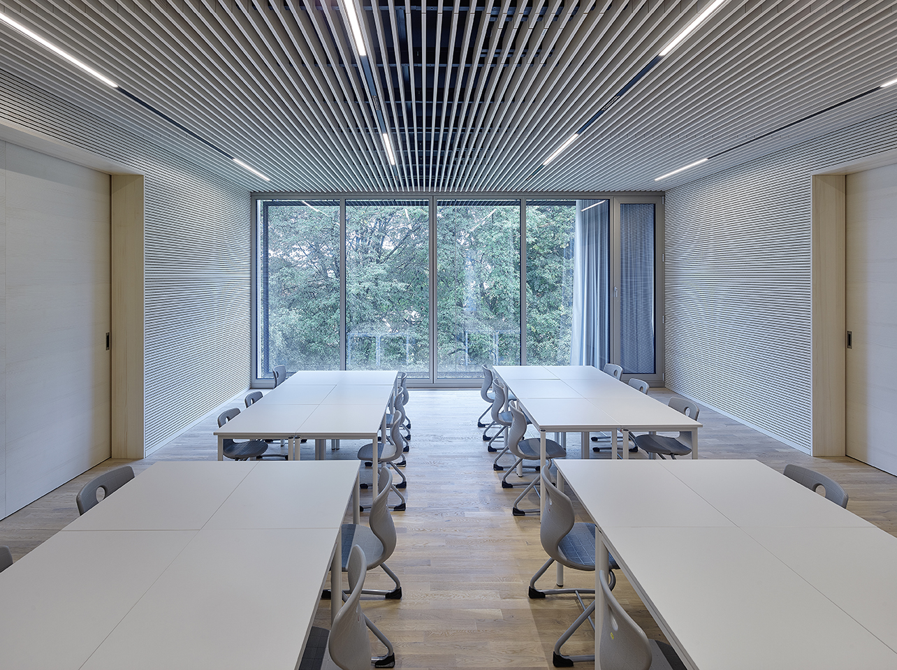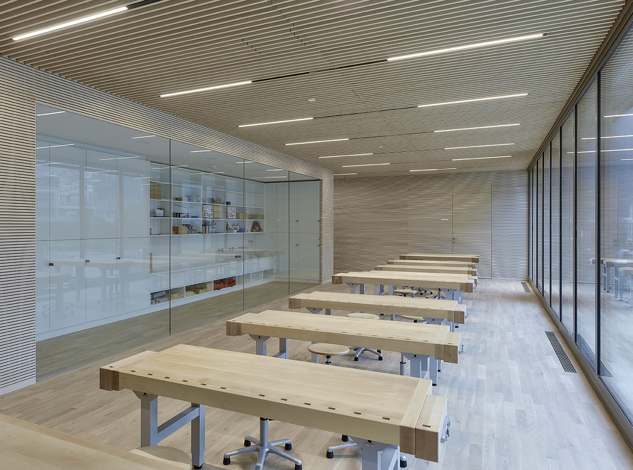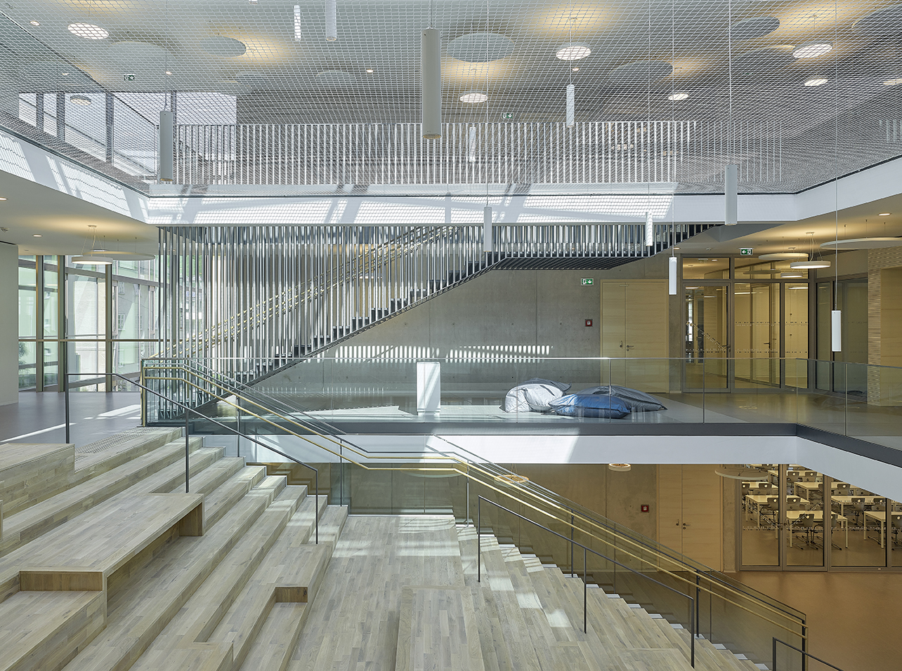Die Lesetreppe bildet neben ihrer Primärfunktion das Kommunikations-Herzstück der Schule. Das offene und flexible Prinzip der Lernlandschaft wird in den Obergeschoßen fortgeführt. Über Schiebetüren und bewegliche Materialboxen können unterschiedliche, schnell zu verändernde Raum- und Lernkonstellationen generiert werden. Die in der Fassade als Rahmen sichtbare, eingeschobenen Sonderräume bilden in den Innenraum wirkende, besonders introvertierte Orte für konzentriertes Arbeiten.