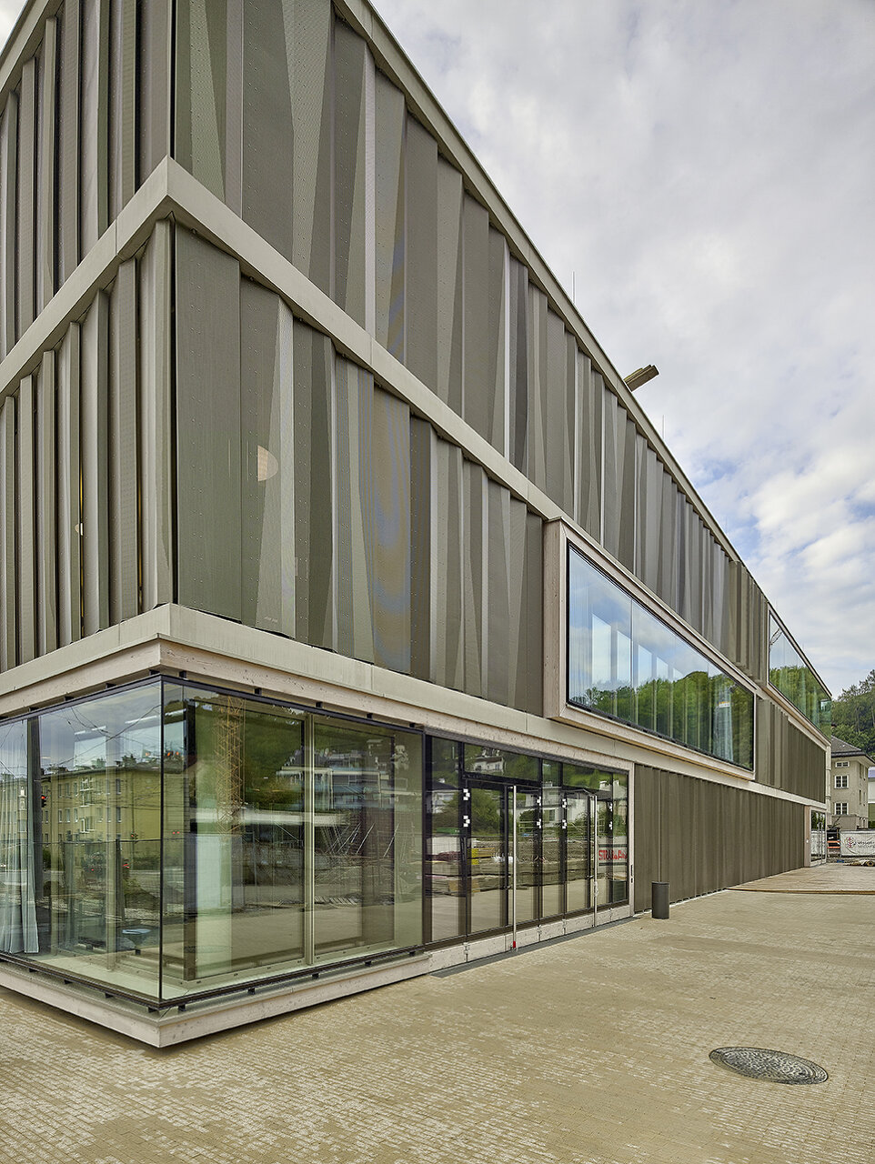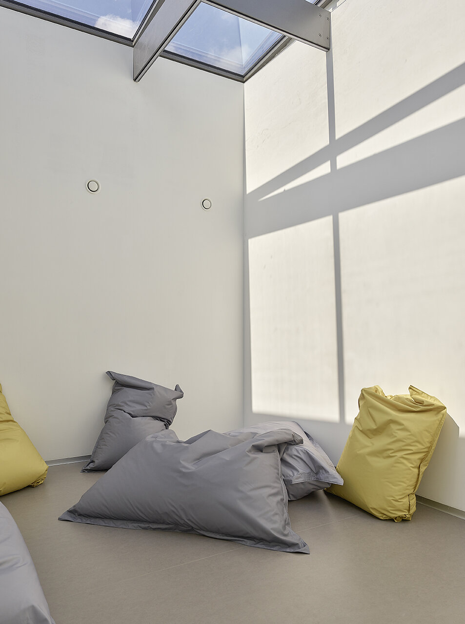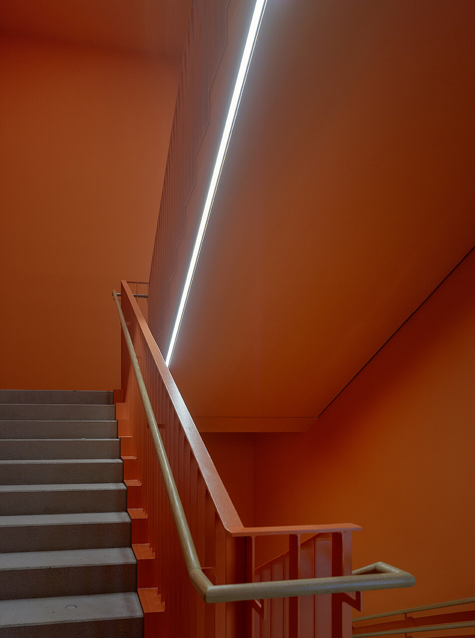 Die Lesetreppe bildet neben ihrer Primärfunktion das Kommunikations-Herzstück der Schule. Das offene und flexible Prinzip der Lernlandschaft wird in den Obergeschoßen fortgeführt. Über Schiebetüren und bewegliche Materialboxen können unterschiedliche, schnell zu verändernde Raum- und Lernkonstellationen generiert werden. Die in der Fassade als Rahmen sichtbare, eingeschobenen Sonderräume bilden in den Innenraum wirkende, besonders introvertierte Orte für konzentriertes Arbeiten.