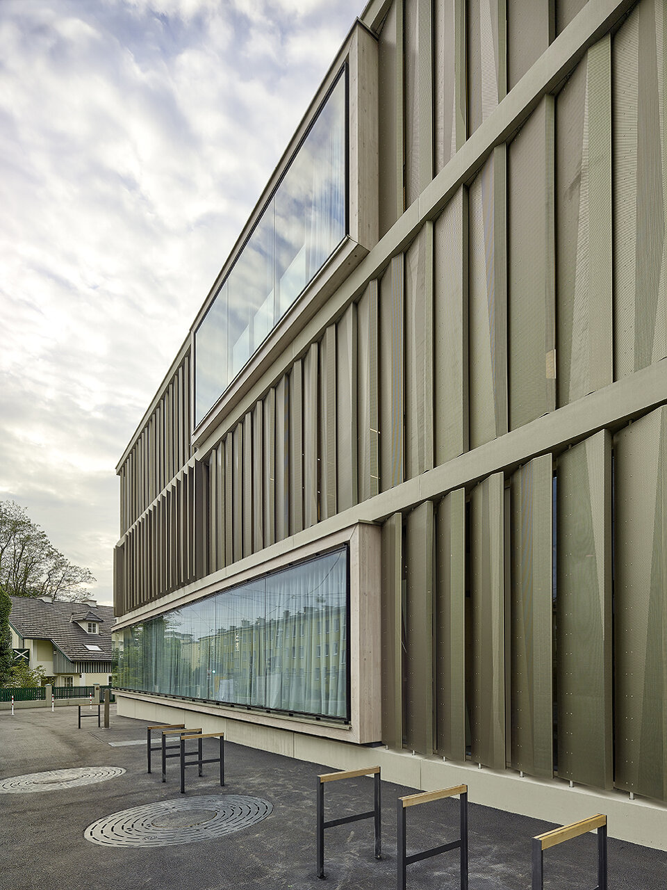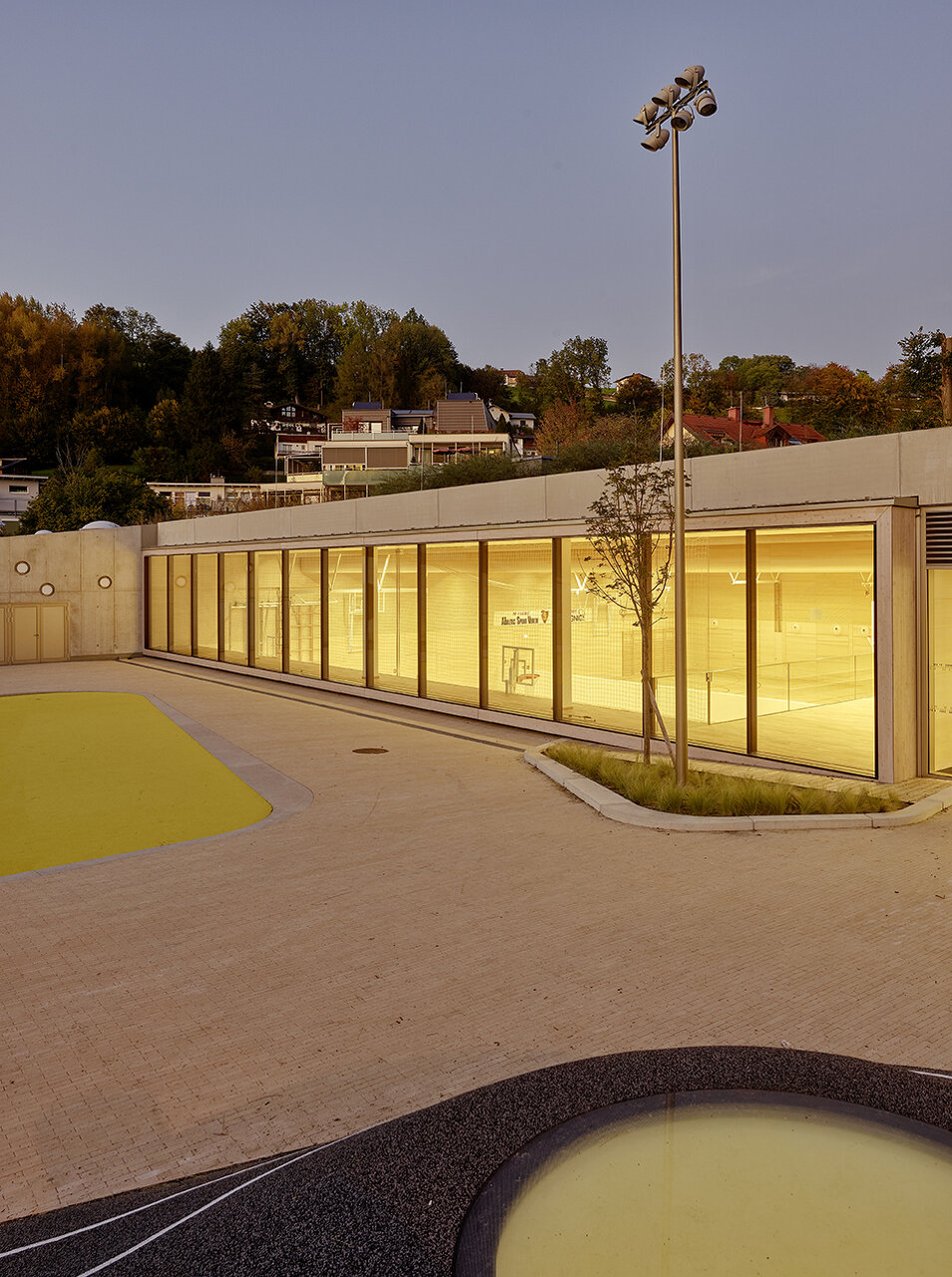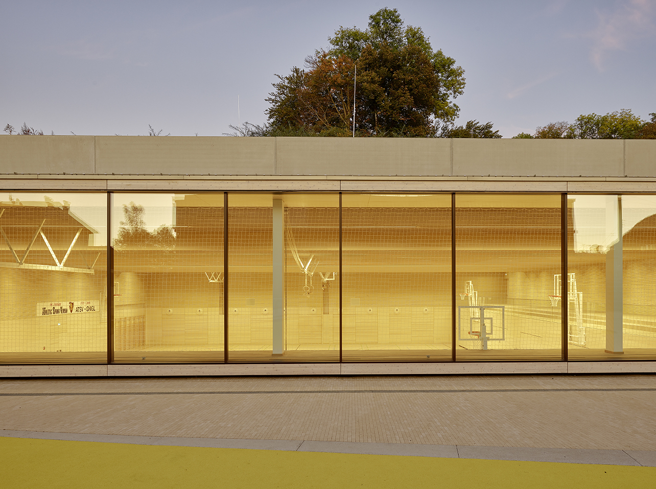 Durch Ausnutzung der Topographie spannt sich zwischen der unter den Hang geschobenen Sporthalle und dem Schulgebäude der Pausenhof auf. Durch das Setzen von Bäumen werden Motive des Parks auf besondere Weise weitergeführt. (IA nach einem Text der Architekten)