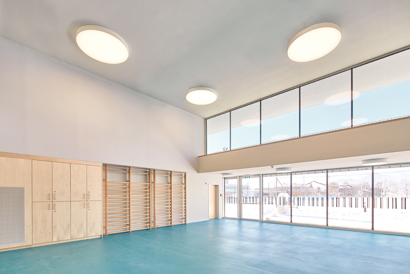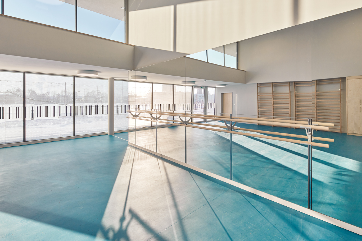 Die geradlinige Architektur fügt sich selbstverständlich in die Topographie ein. Das Volumen der Dreifach-Sporthalle ist klar erkennbar. Schlichtheit und Eleganz vermittelt die hell verputze Fassade und die großen Glasflächen. Durch die Abrückung des Gebäudes von der Josef-Brandstätter-Straße entsteht ein einladender, vielfältig nutzbarer Vorplatz. Das Foyer öffnet sich als verbindendes Element sowohl zum Vorplatz als auch zu den Freisportanlagen im Westen und den neu genutzten Grünflächen im Osten. Zum Schutz vor Hochwasser ist das Erdgeschoßniveau leicht erhöht. Dadurch ergeben sich nicht nur Sichtbeziehungen zu den Fußballfeldern, sondern auch eine optimierte Anbindung an das Straßenniveau.