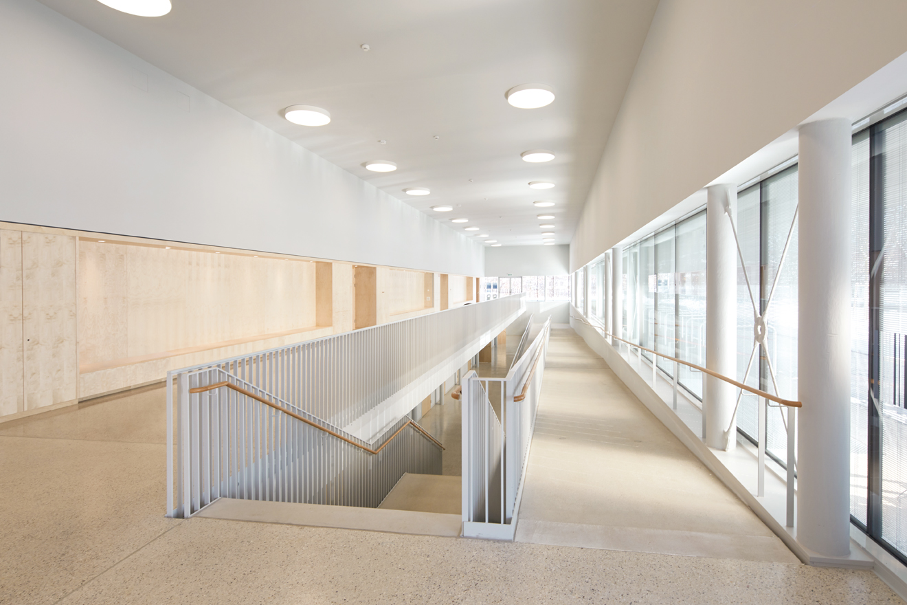 Das Innere ist klar gegliedert. Vom übersichtlichen, rundum verglasten Foyer gelangt man direkt zu den Zuschauertribünen. Treppe und Rampe führen in das Untergeschoss. Das Buffet im Foyer soll mit der Sonnenterrasse auch als Treffpunkt für Spaziergänger und Radfahrer genutzt werden. Warme, natürliche Farben und Materialien schaffen eine freundliche Atmosphäre. (Text: Architekt:innen, bearbeitet)