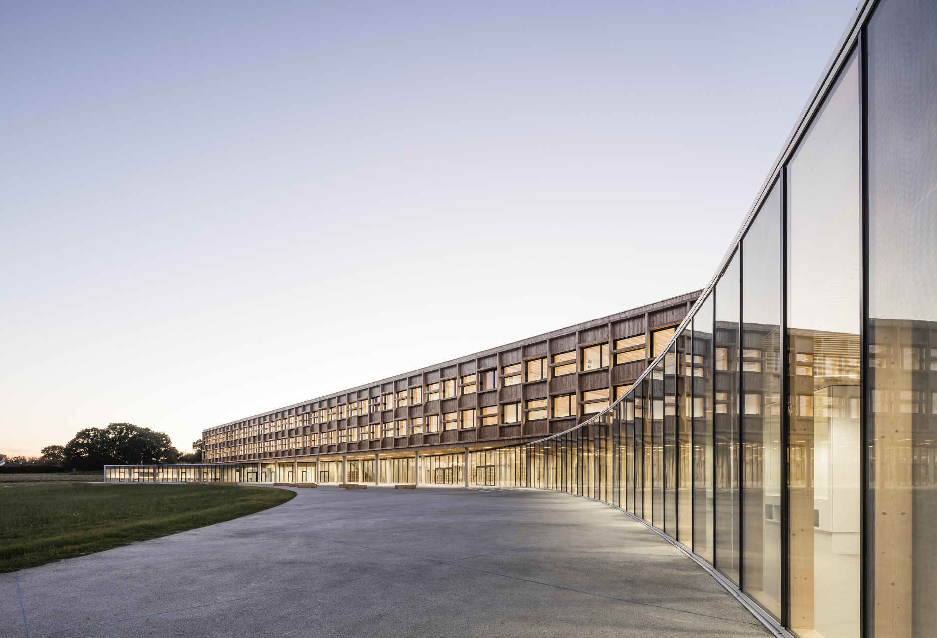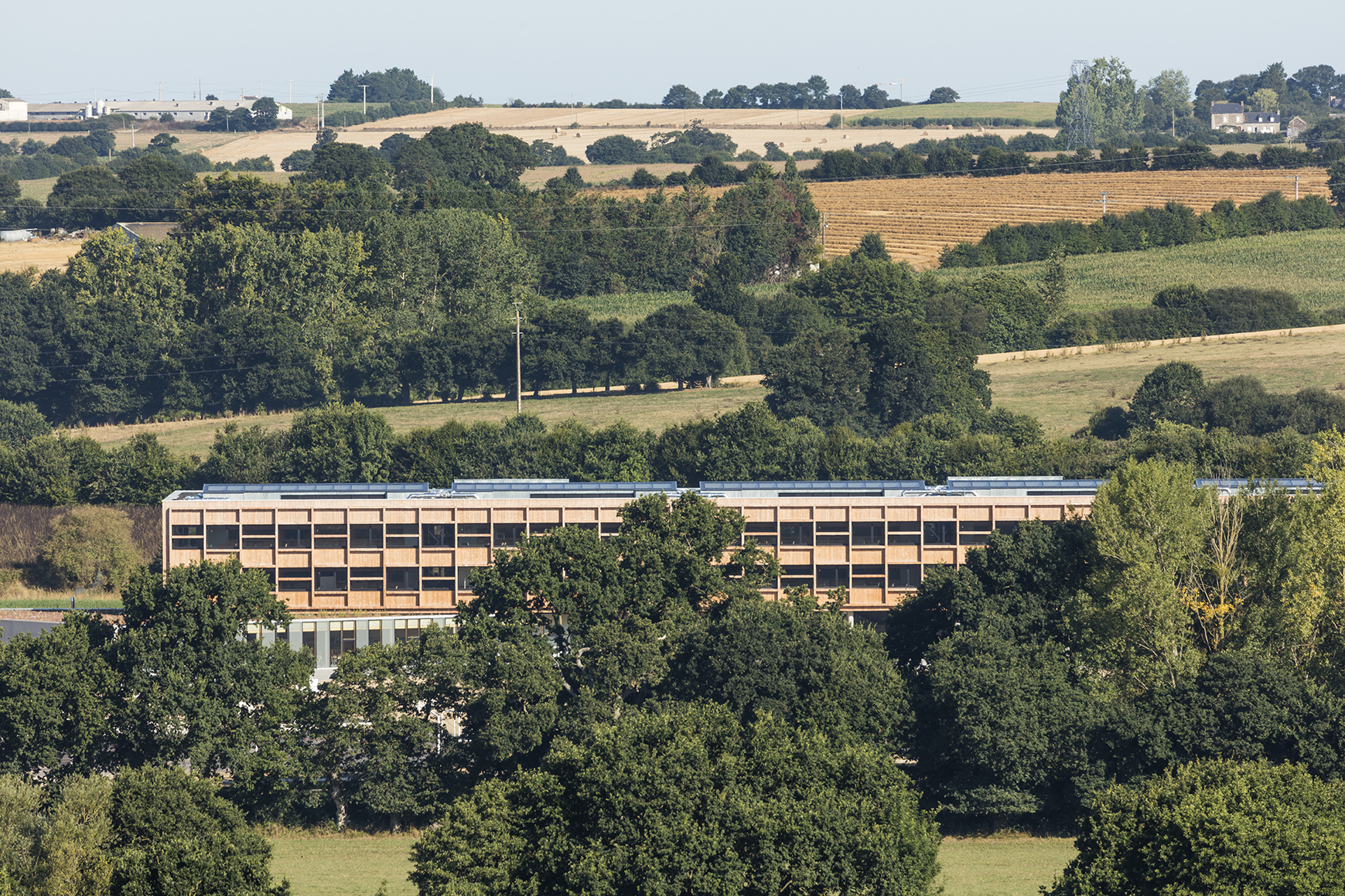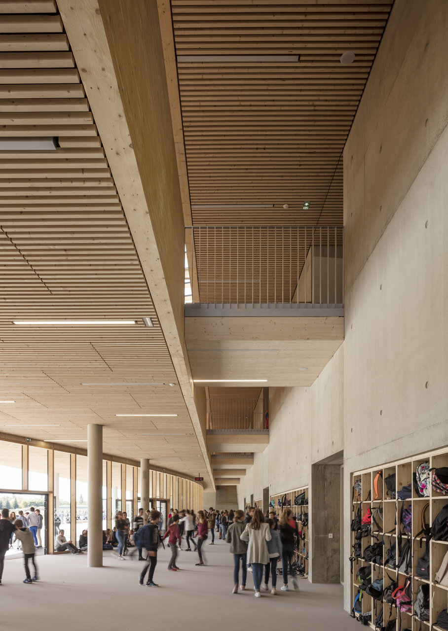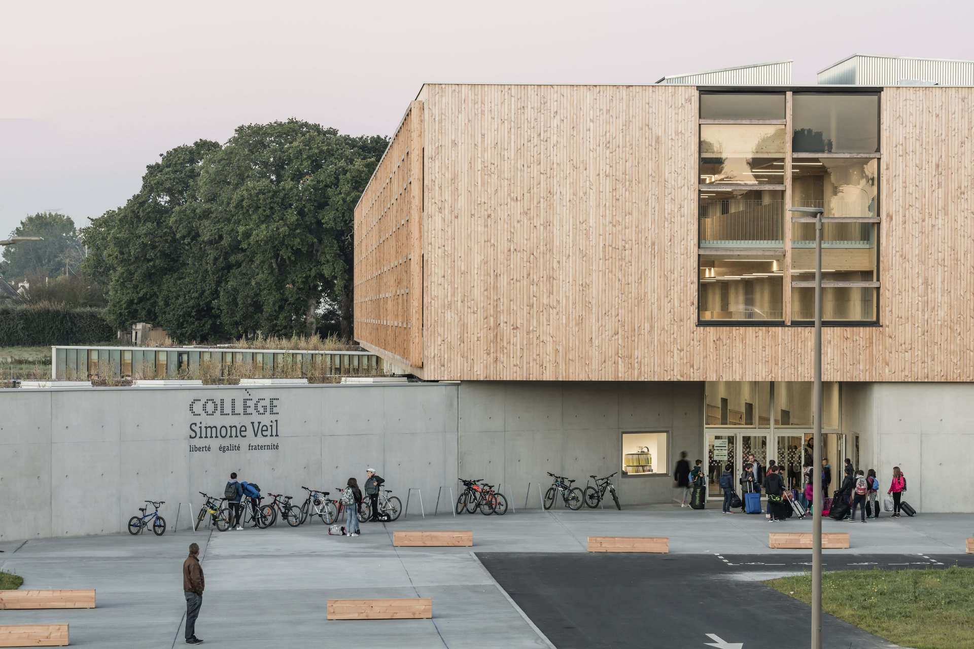 Der zweigeschossige Riegel enthält die 19 Stamm-, Sonder- und Fachklassen. Die Klassen mit weiten Blicken in die Umgebung werden durch vertikal versetzte Lufträume und darüber gespannte Brücken zusammengebunden. An den Südost- und Nordwestfassaden steuern vertikale und horizontale Holzelemente die Lichtversorgung und Beschattung. Ein gebäudehohes, lichtdurchflutetes Atrium kontrastiert die große Kompaktheit des Gebäudes. Die Materialwahl respektiert die Umwelt ebenso wie die Forderung nach Langlebigkeit und niedrigen Erhaltungs-kosten. Beton im Erdgeschoss gewährleistet die nötige Robustheit, die Obergeschosse wurden aus Betonfertigteilen und Holz errichtet. Mit dem College in Lamballe gelang es, das sehr normierte Raumprogramm französischer Schulen strikt umzusetzen, ohne die räumliche Großzügigkeit einzuschränken. (Text: Architekten)