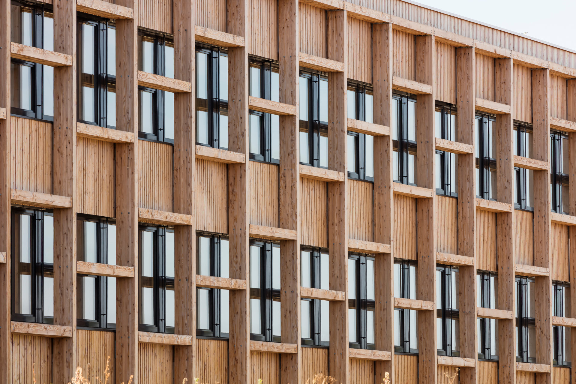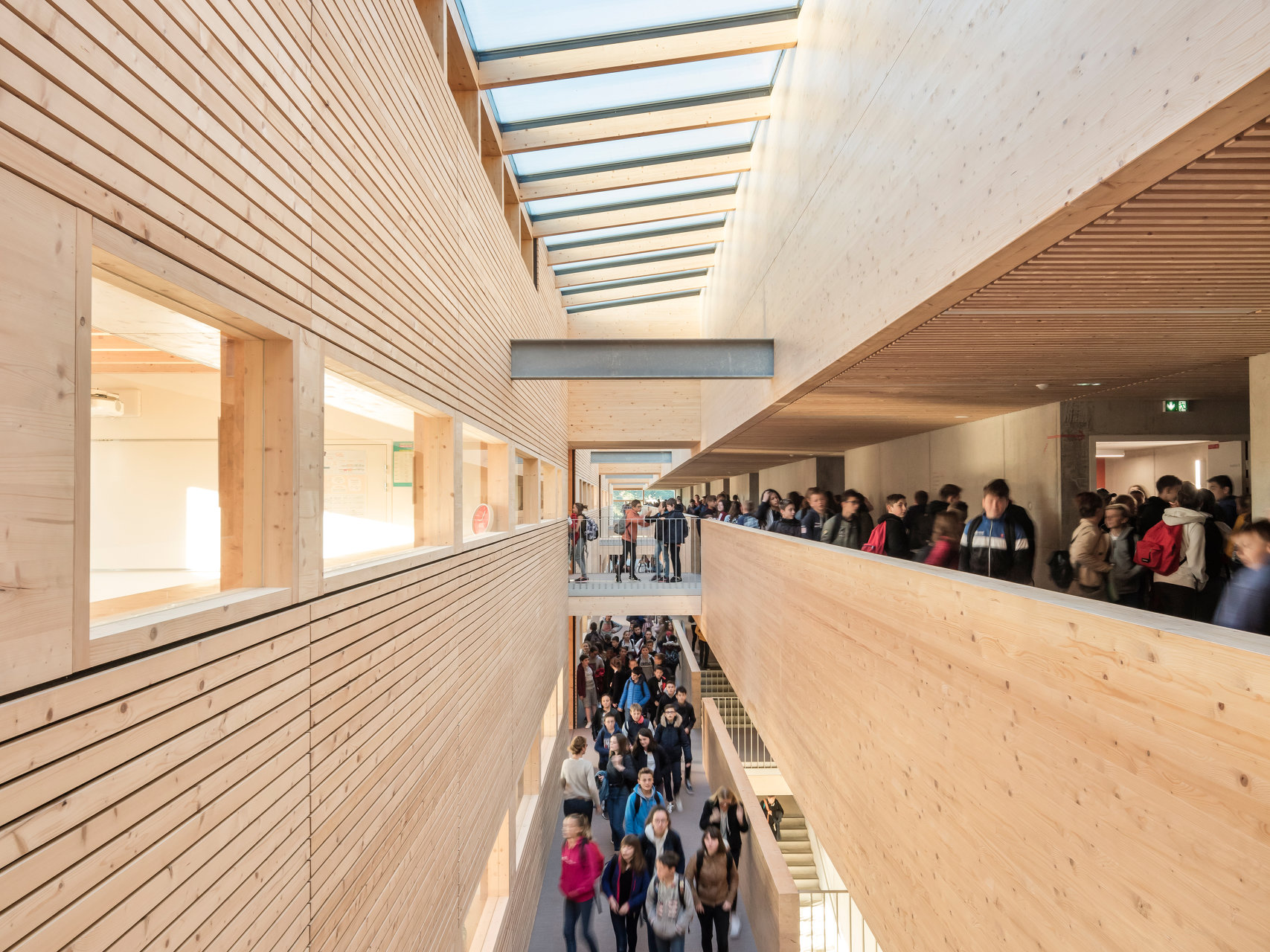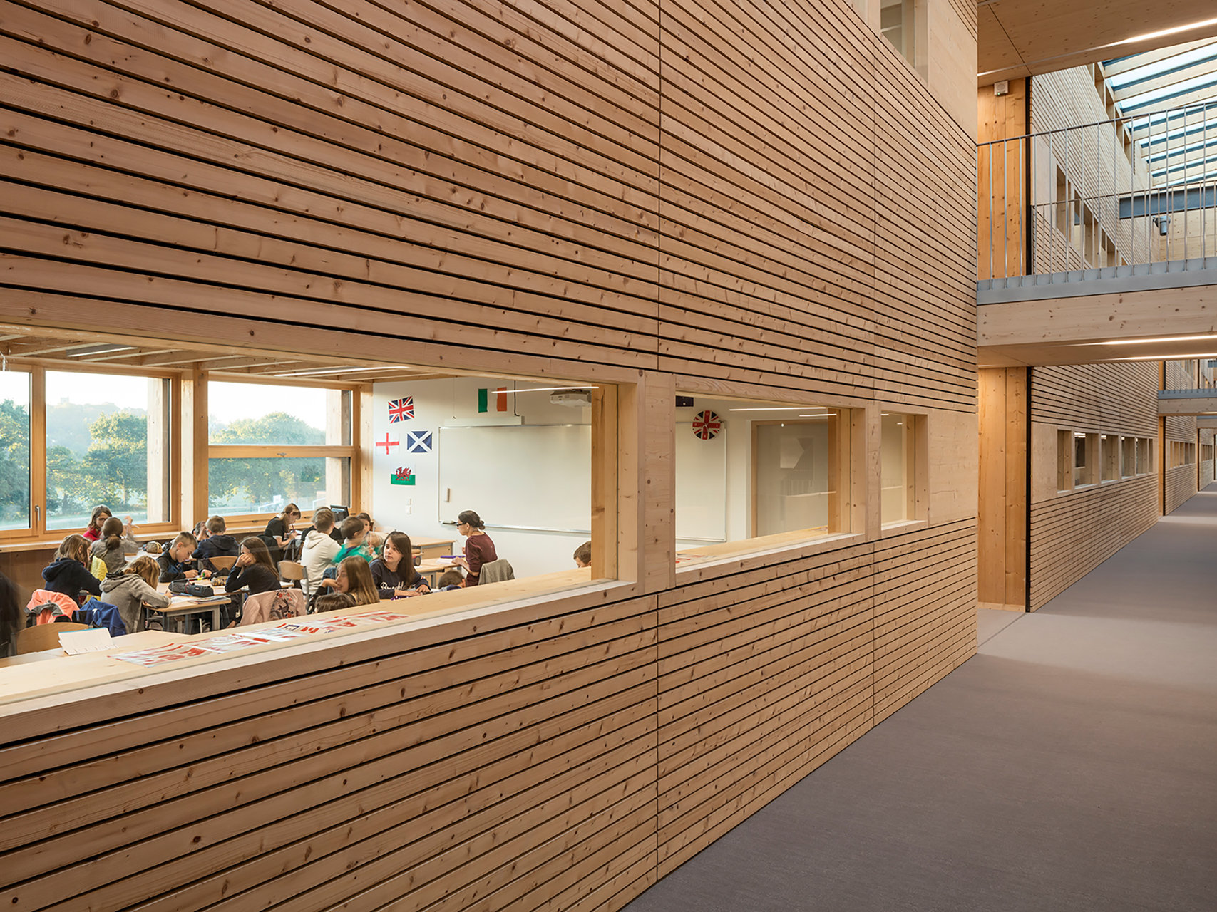 Der zweigeschossige Riegel enthält die 19 Stamm-, Sonder- und Fachklassen. Die Klassen mit weiten Blicken in die Umgebung werden durch vertikal versetzte Lufträume und darüber gespannte Brücken zusammengebunden. An den Südost- und Nordwestfassaden steuern vertikale und horizontale Holzelemente die Lichtversorgung und Beschattung. Ein gebäudehohes, lichtdurchflutetes Atrium kontrastiert die große Kompaktheit des Gebäudes. Die Materialwahl respektiert die Umwelt ebenso wie die Forderung nach Langlebigkeit und niedrigen Erhaltungs-kosten. Beton im Erdgeschoss gewährleistet die nötige Robustheit, die Obergeschosse wurden aus Betonfertigteilen und Holz errichtet. Mit dem College in Lamballe gelang es, das sehr normierte Raumprogramm französischer Schulen strikt umzusetzen, ohne die räumliche Großzügigkeit einzuschränken. (Text: Architekten)