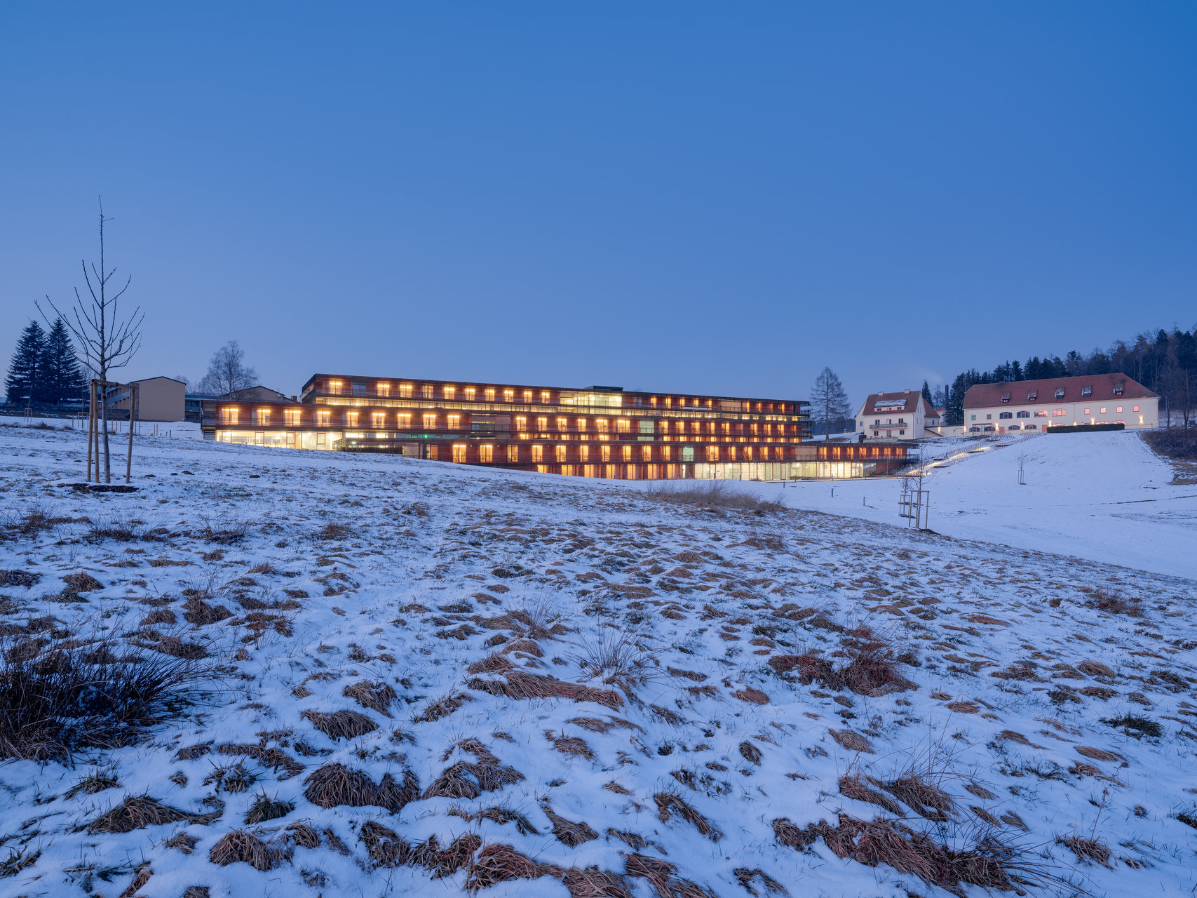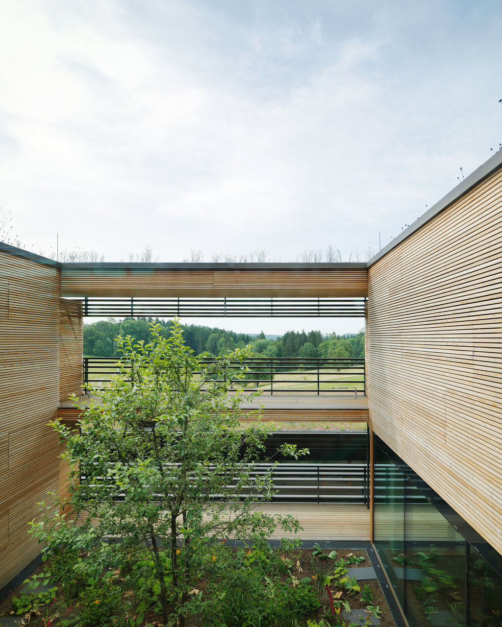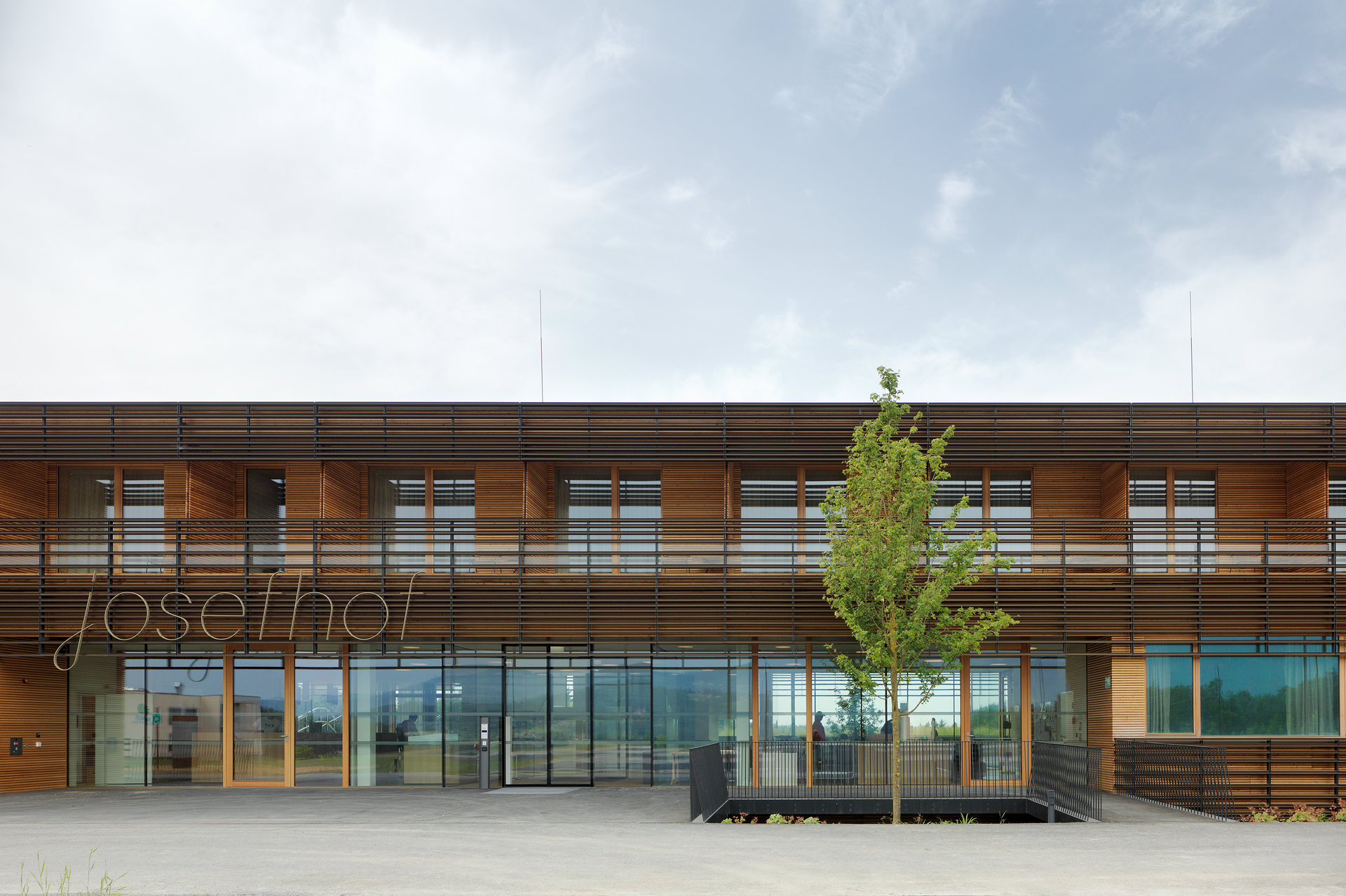 Ein wichtiges Gestaltungselement der Anlage sind fünf Atrien, die an strategischen Punkten in die Baukörper geschnitten sind. Diese Atrien dienen nicht zum Aufenthalt von Nutzern. Sie sind als kleine Landschaftsausschnitte angelegt, mit dichter Bepflanzung auf einem Miniaturhügel in der Mitte. Ihre Aufgabe ist es, gewissermaßen als Akkumulatoren von Achtsamkeit, die umliegenden Räume atmosphärisch zu beruhigen. Das mag seltsam klingen, passt aber sehr gut zur Aufgabe, der sich diese Gesundheitseinrichtung verschrieben hat. Hierher kommt man nämlich nicht, wenn man krank ist, sondern aus Gründen der Prophylaxe. Es geht um „stationäre Gesundheitsförderung“, bei der Versicherte eine Woche lang lernen, gesünder zu leben, vom Essen über die Bewegung bis zur Rauchentwöhnung. Deshalb gibt es hinter dem Speisesaal eine Lehrküche, in der die Gäste in die Welt abseits von Stelze und Schnitzel eingeführt werden. Die Gäste gehören zum größten Teil zur Altersgruppe jenseits der 50, wobei es eigene Angebote für die Zeit unmittelbar nach der Pensionierung gibt sowie für Pensionisten zwischen 65 und 75 Jahren. Die Kosten übernimmt die Versicherung, berufstätige Gäste müssen für die Zeit im „Josefhof“ ihren Urlaub konsumieren.